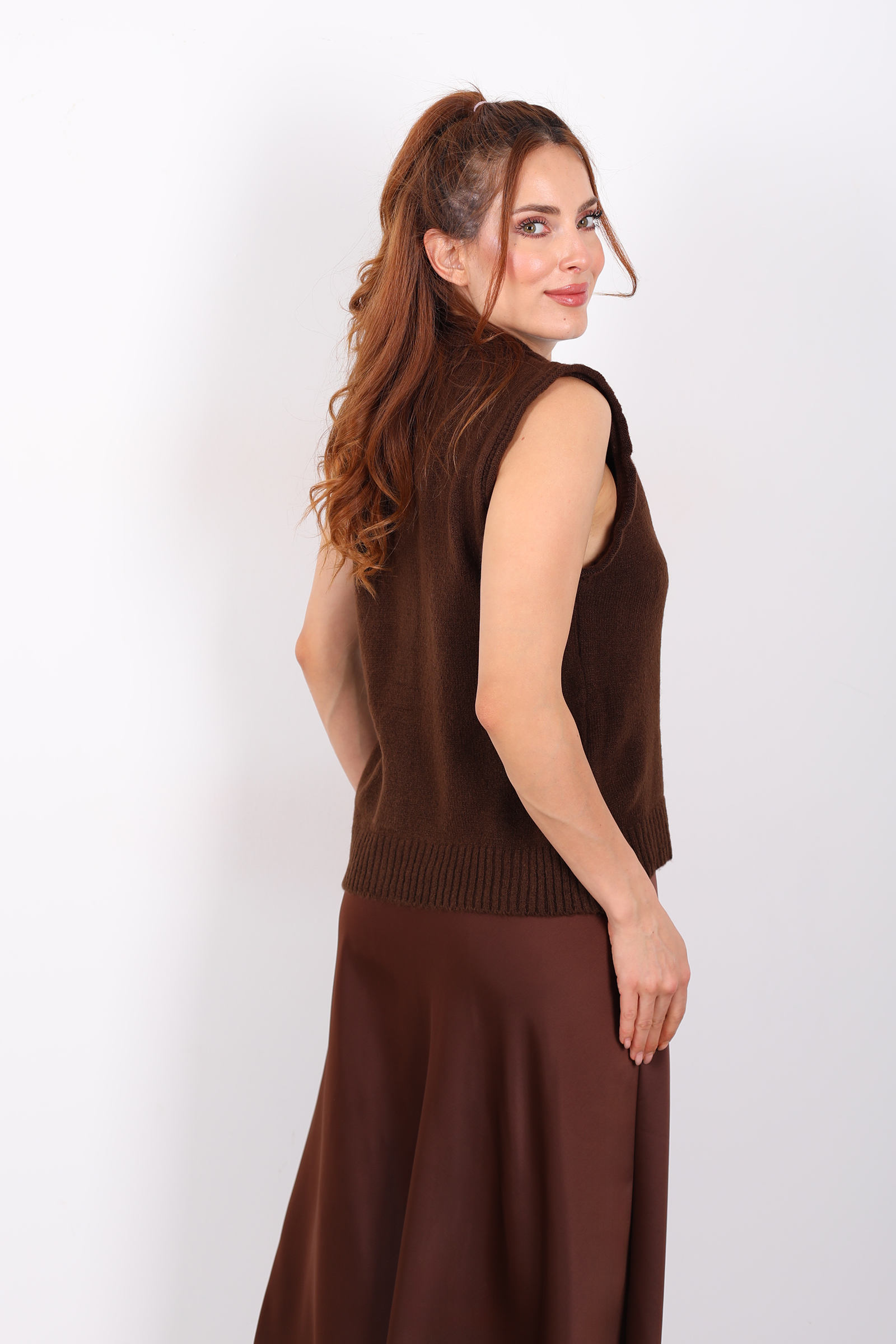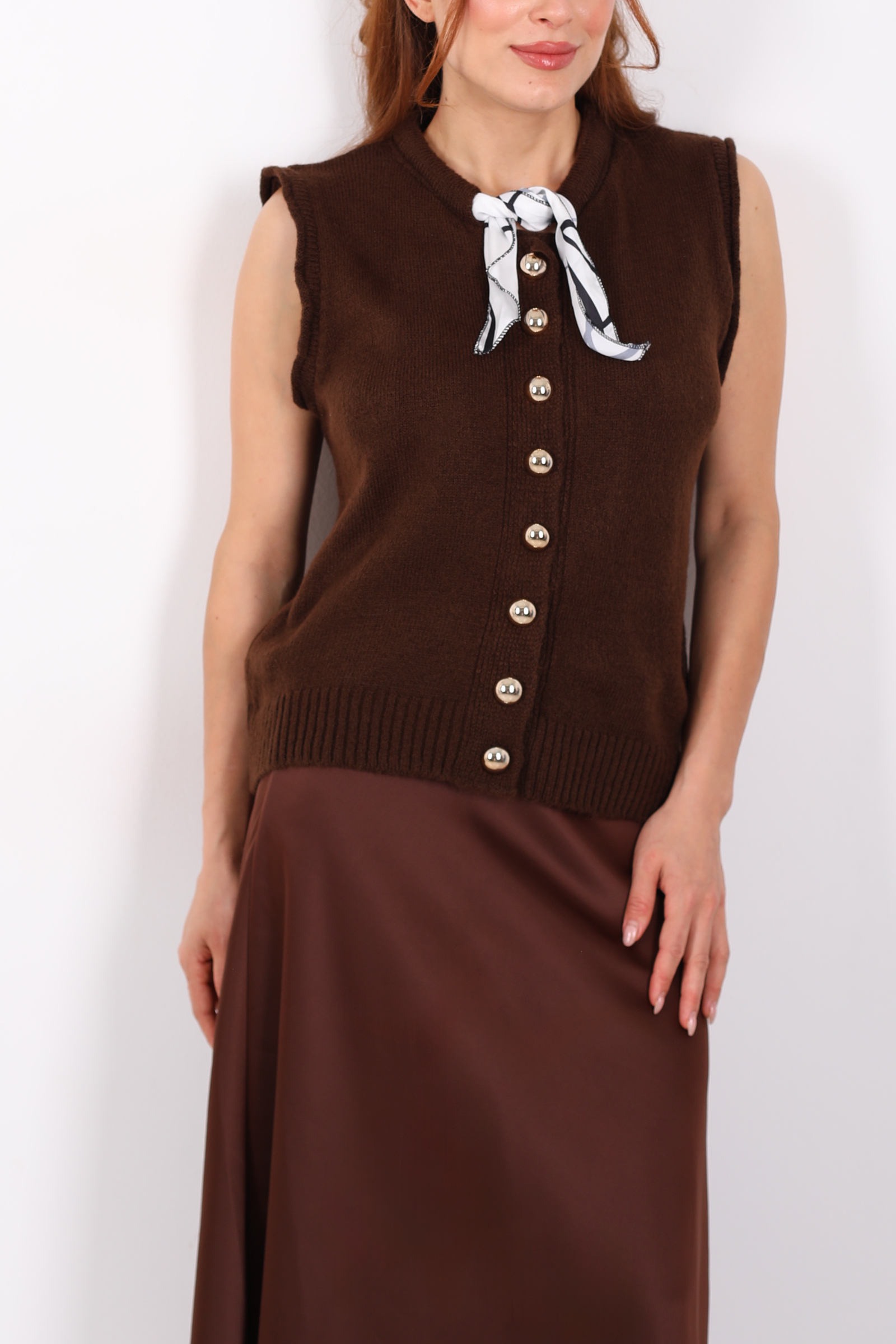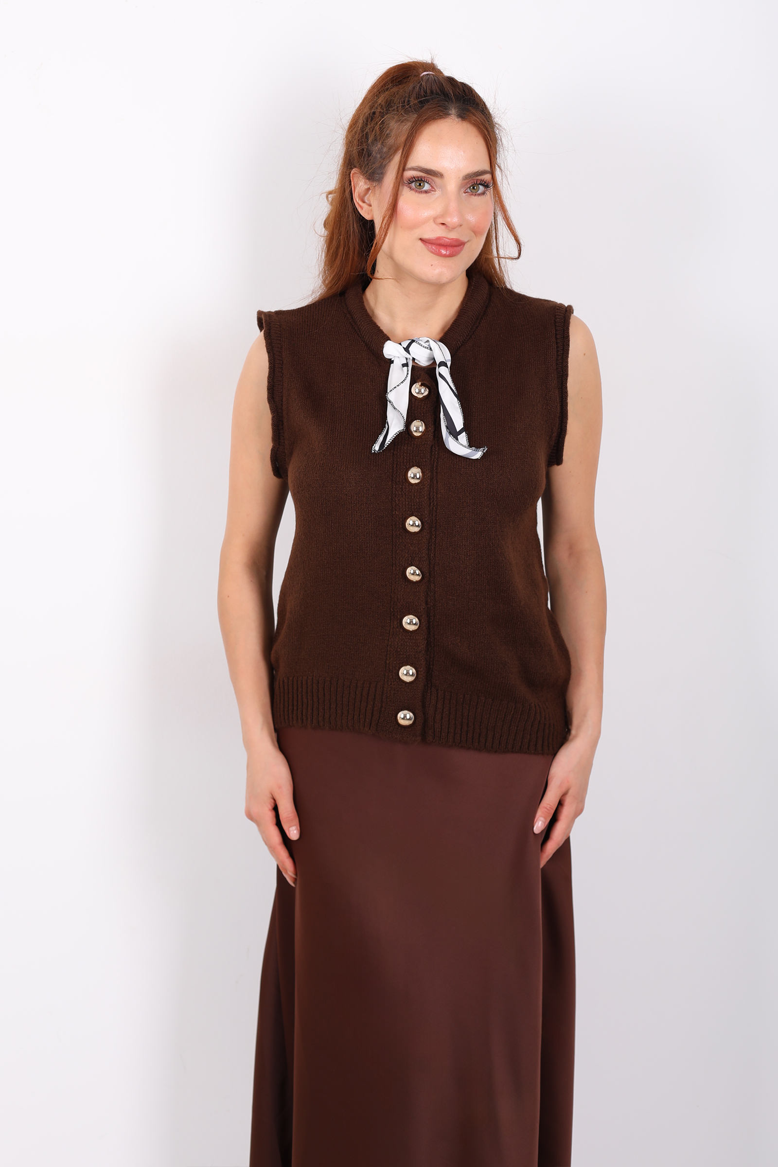 Fularlı Düğmeli Kahverengi Kadın Triko Yelek