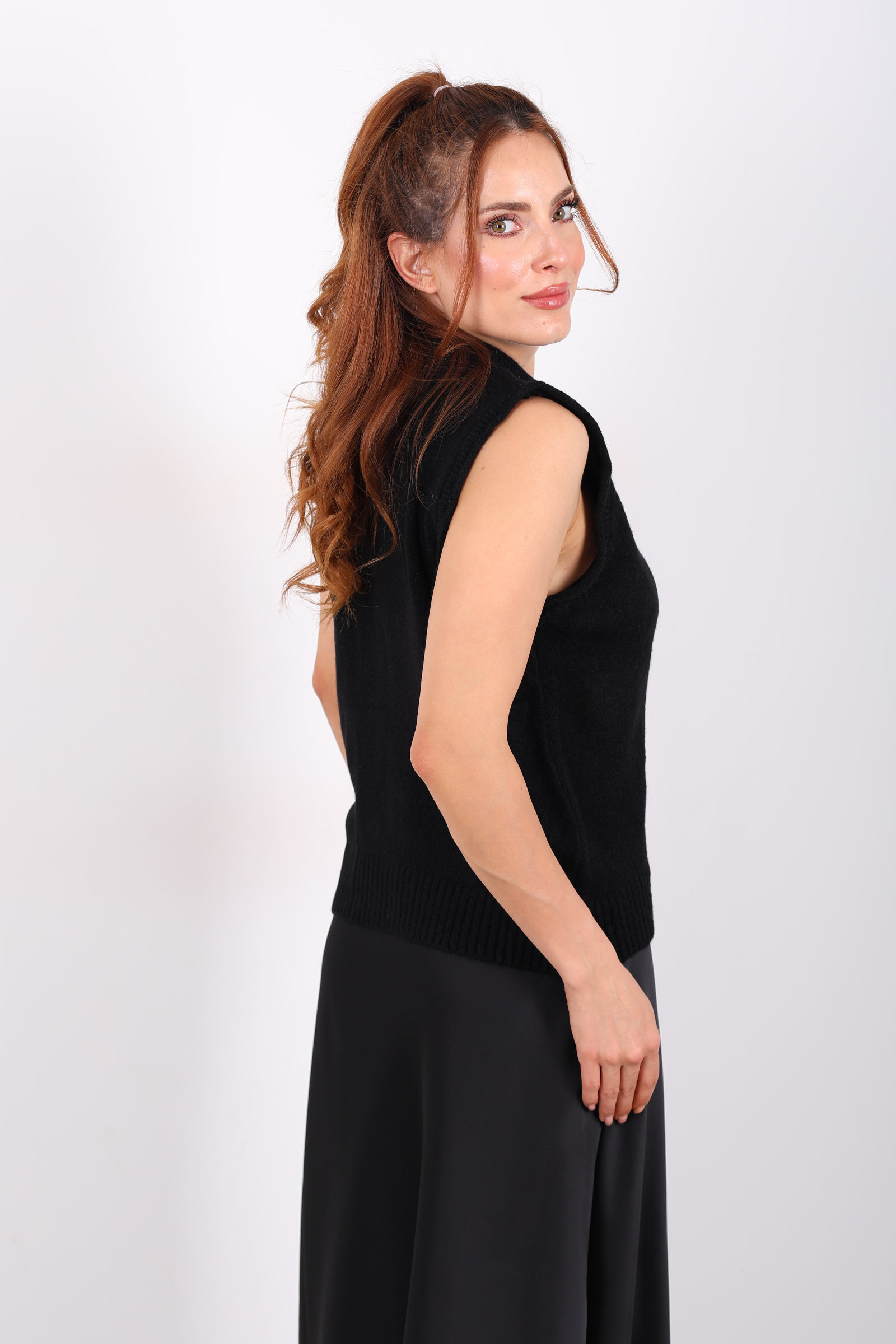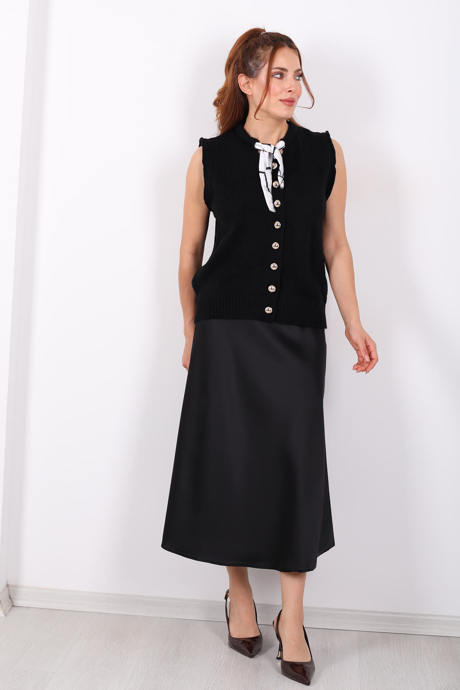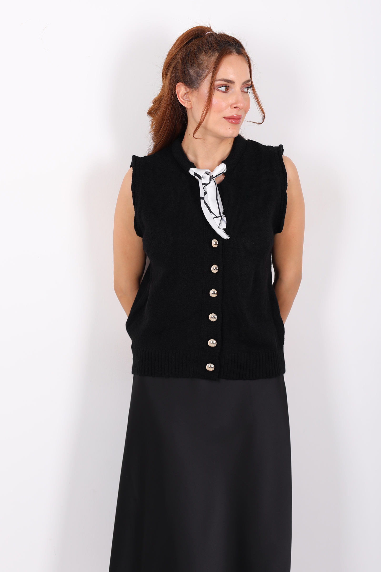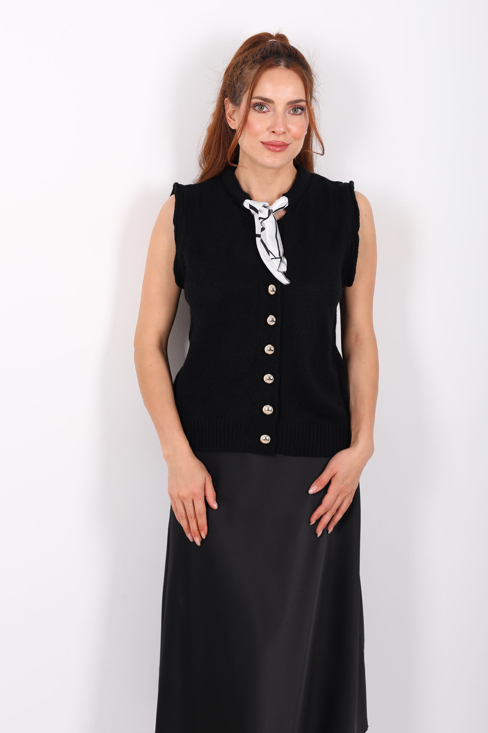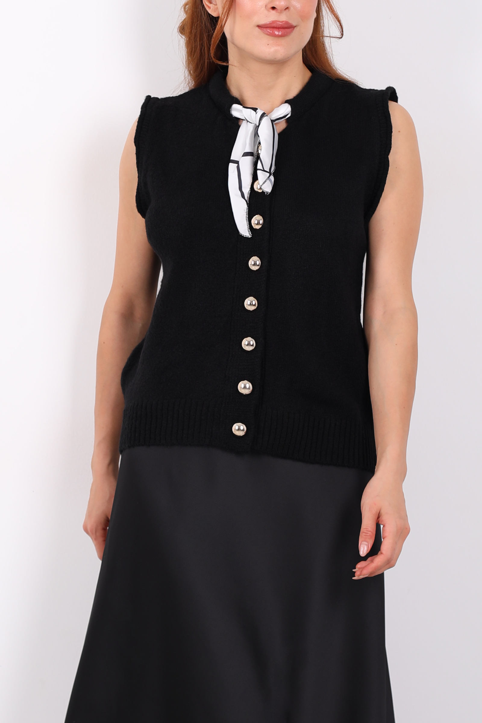 Fularlı Düğmeli Siyah Kadın Triko Yelek