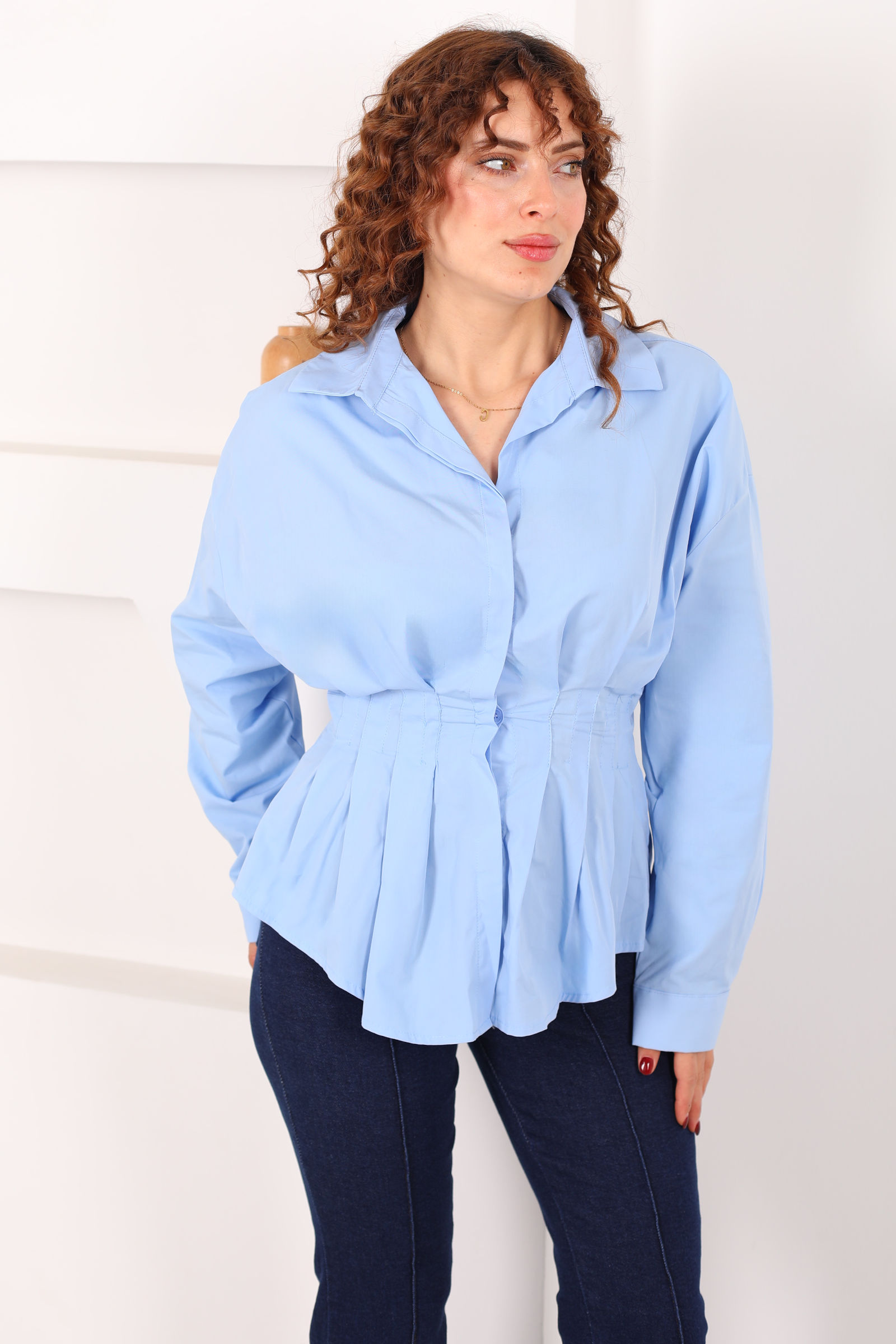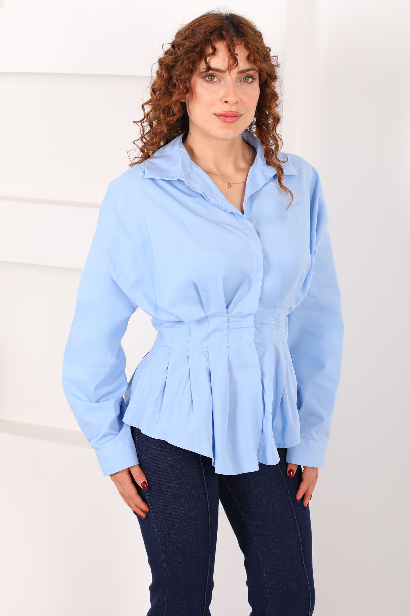 Gizli Düğmeli Belden Oturtmalı Kadın Bebe Mavi Pileli Gömlek