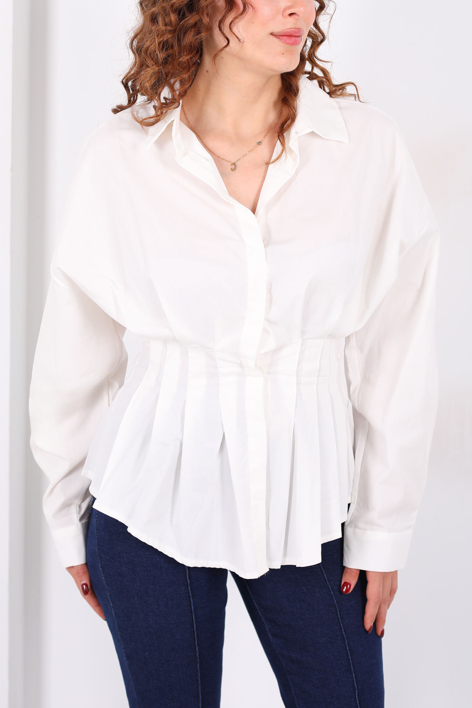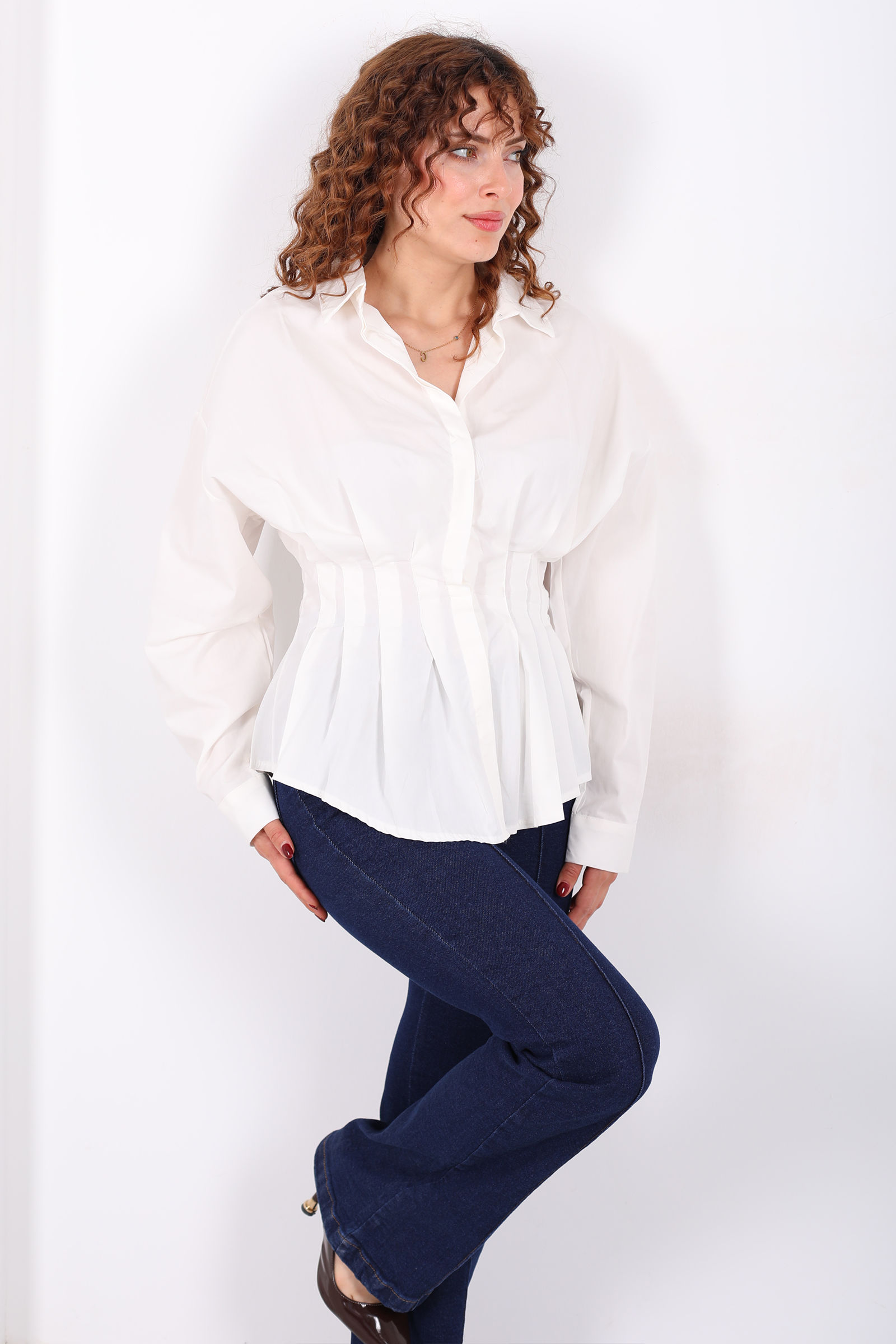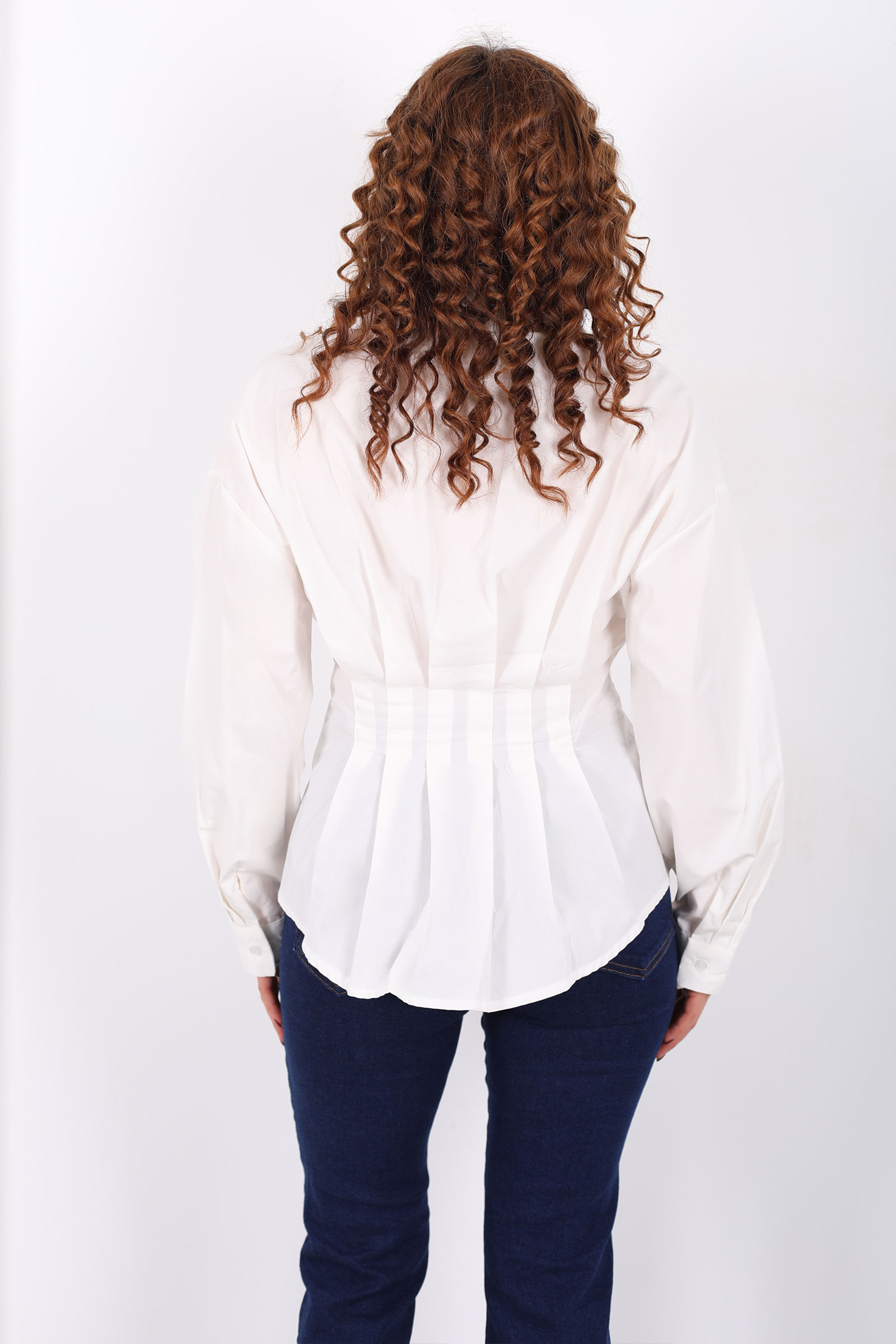 Gizli Düğmeli Belden Oturtmalı Kadın Ekru Pileli Gömlek