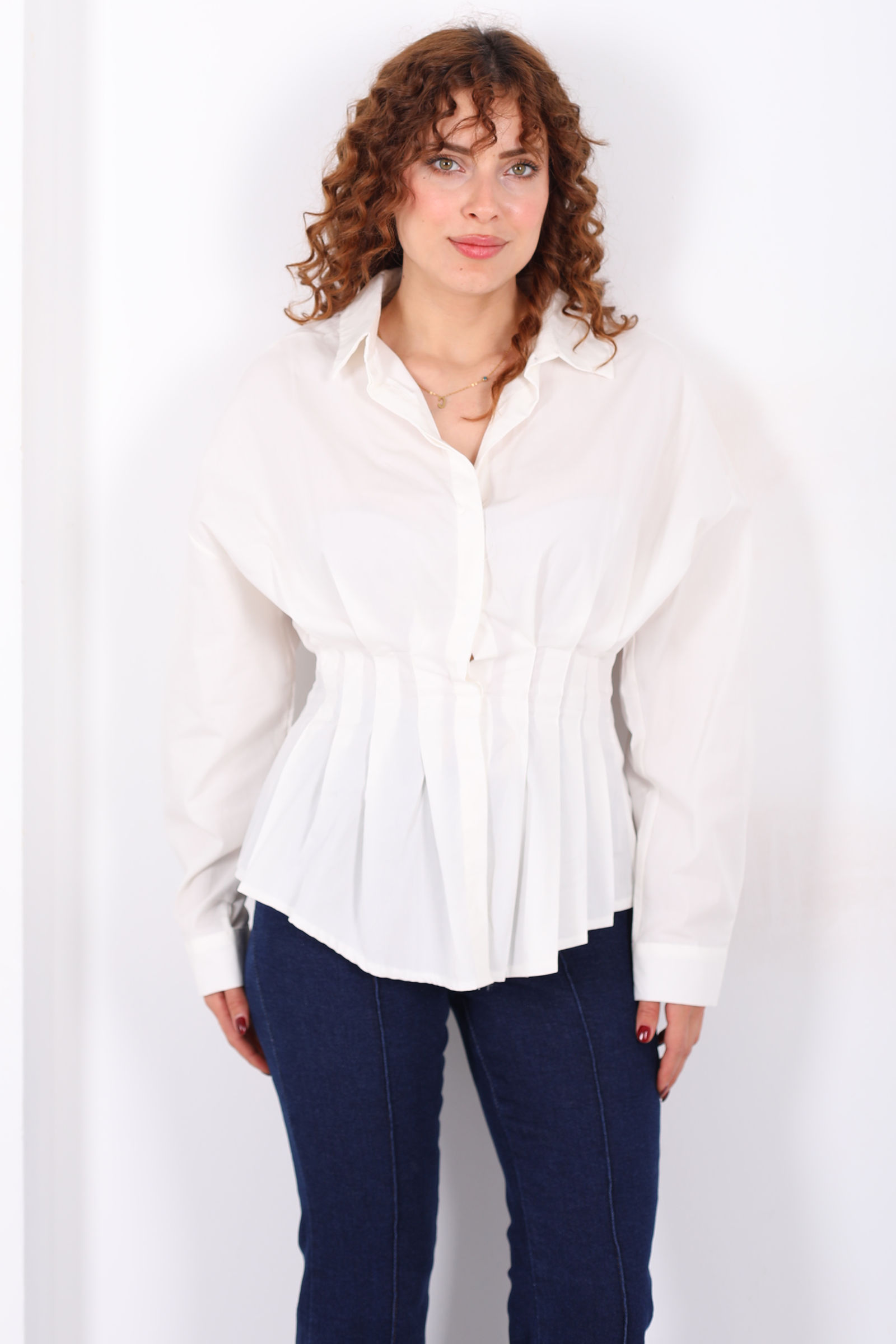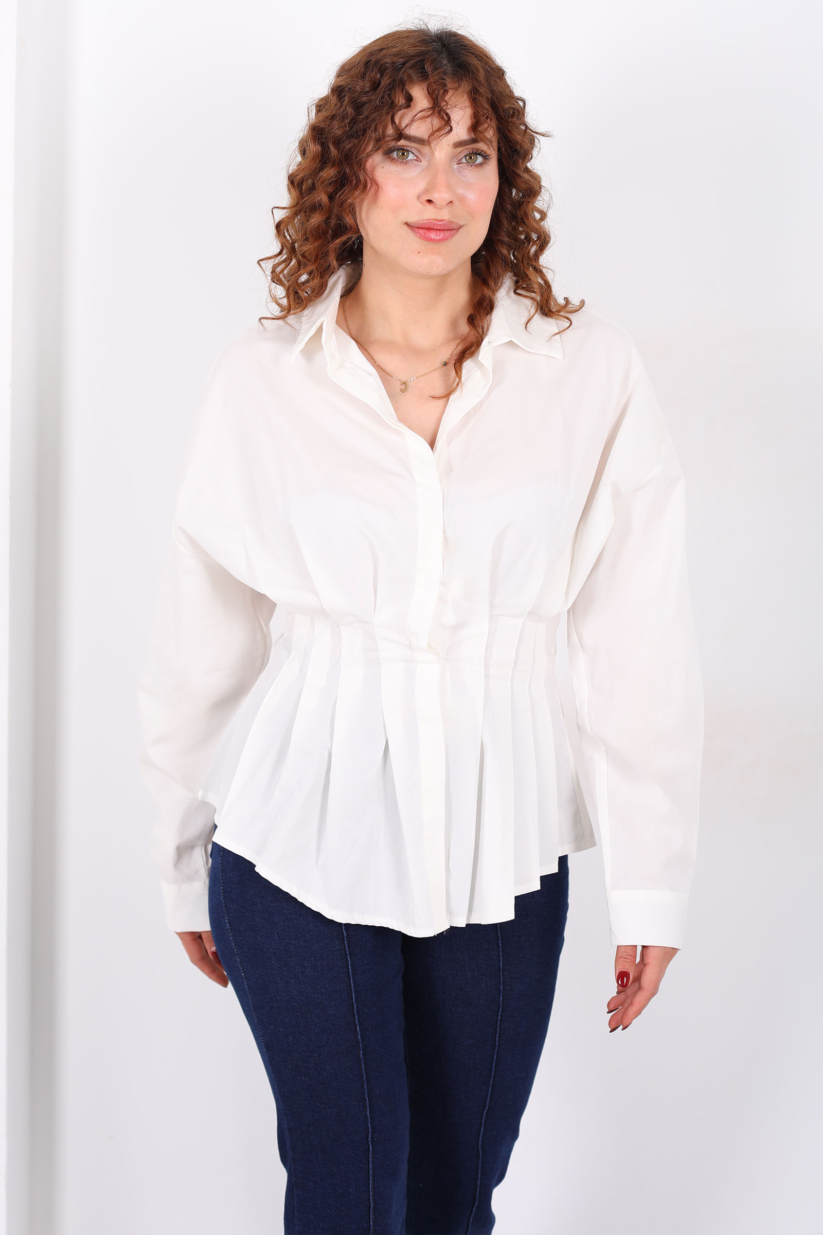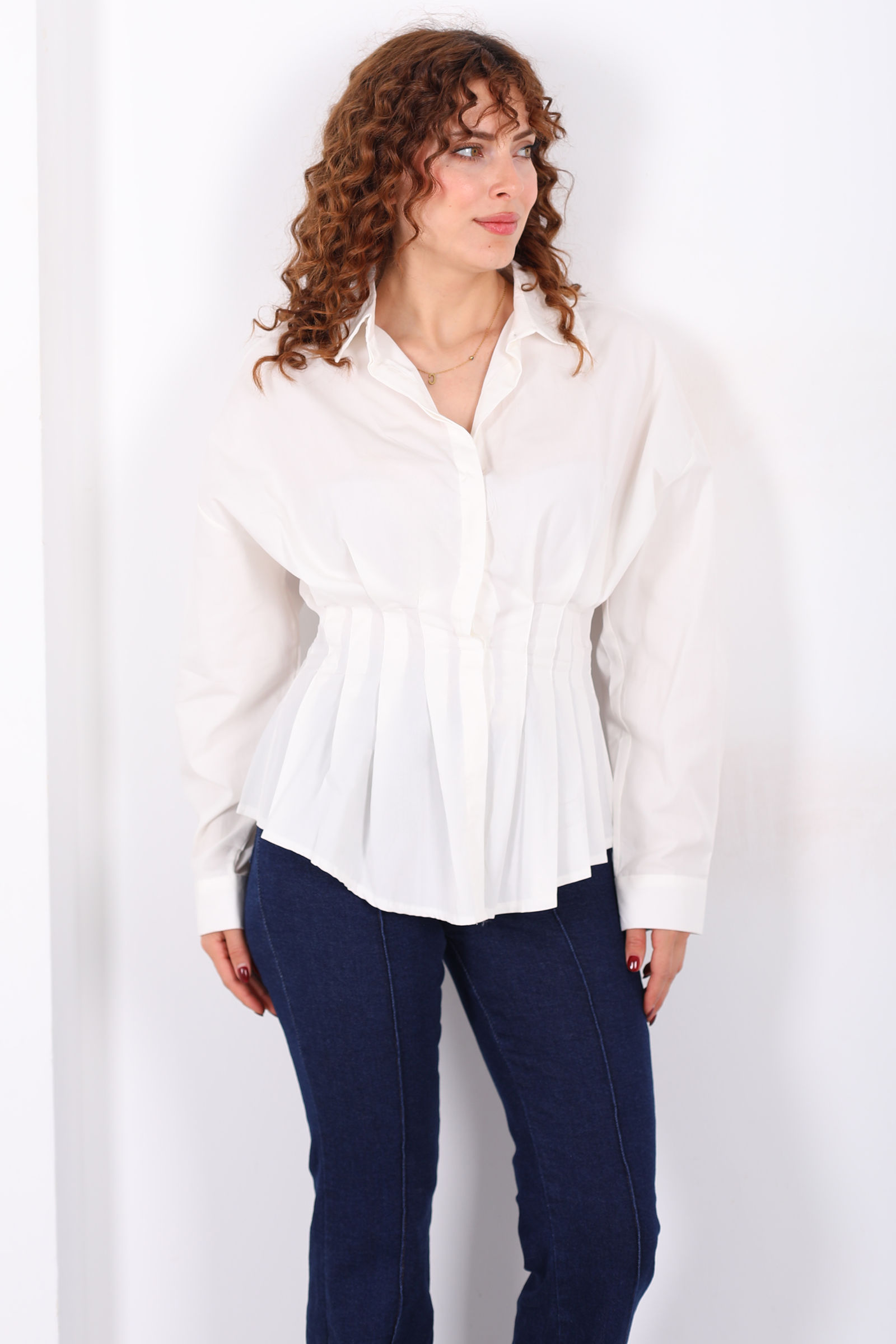Gizli Düğmeli Belden Oturtmalı Kadın Ekru Pileli Gömlek