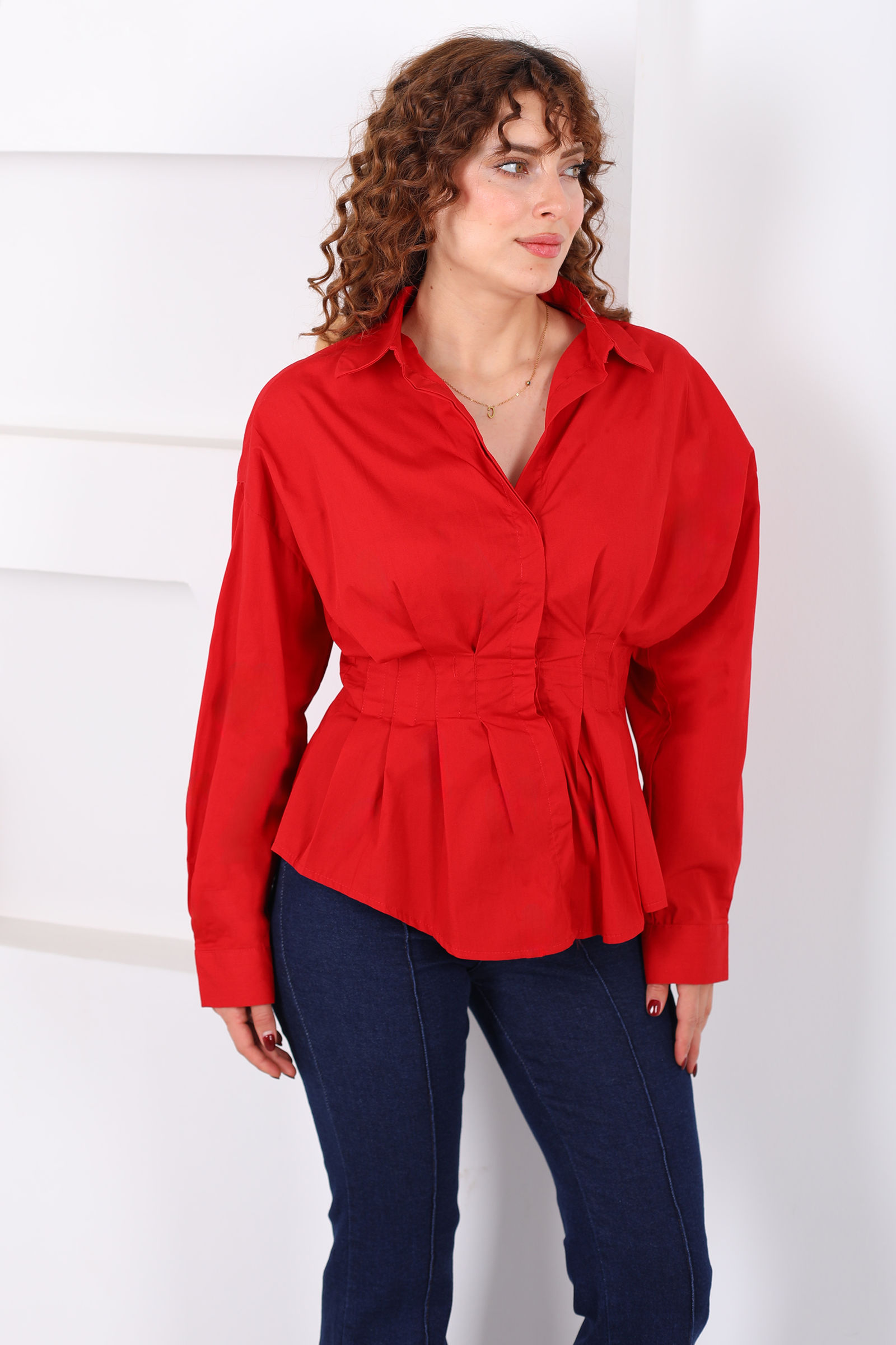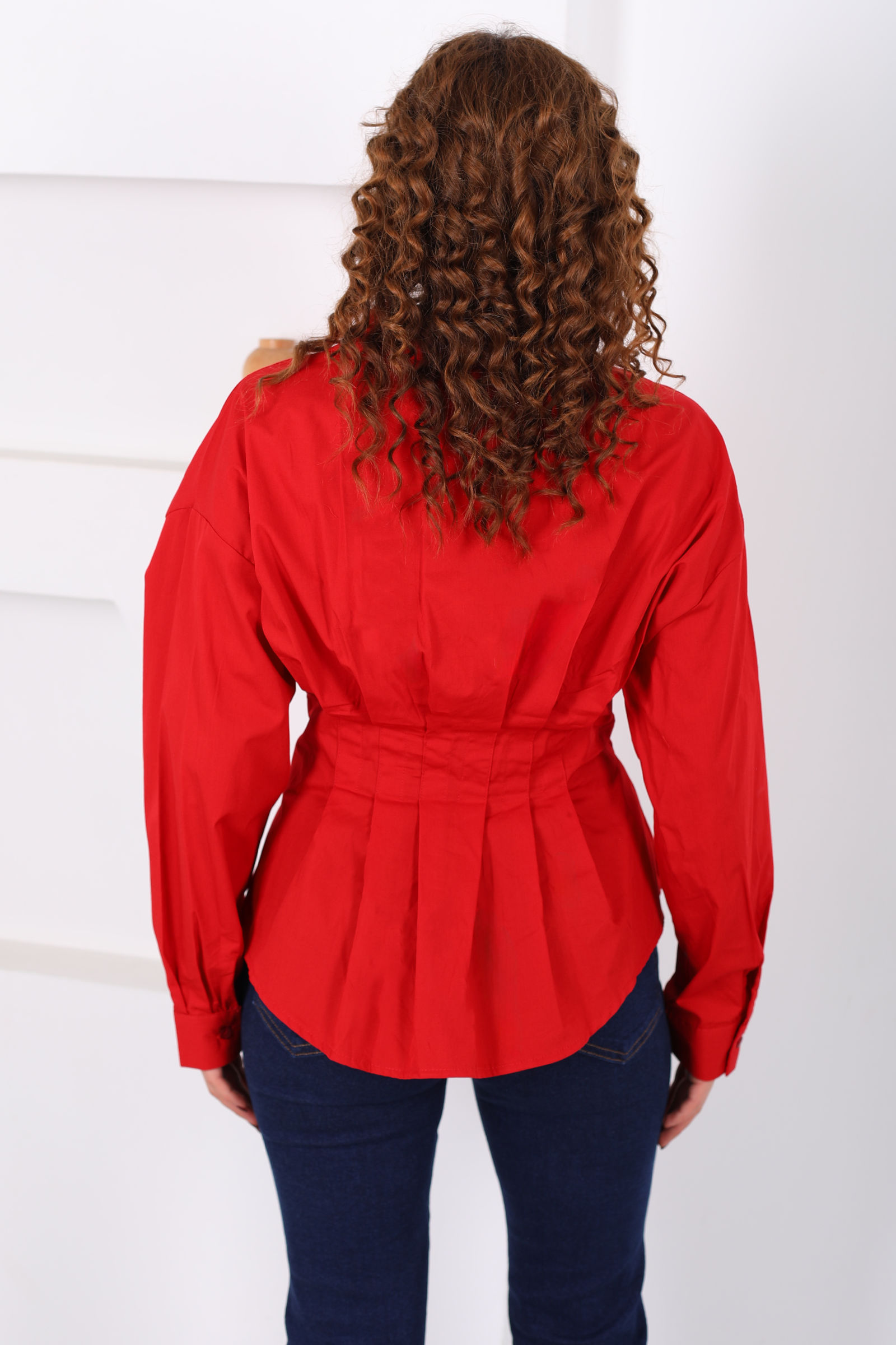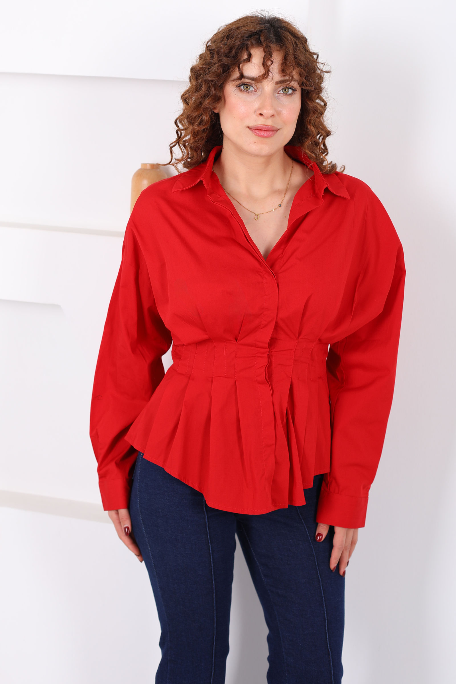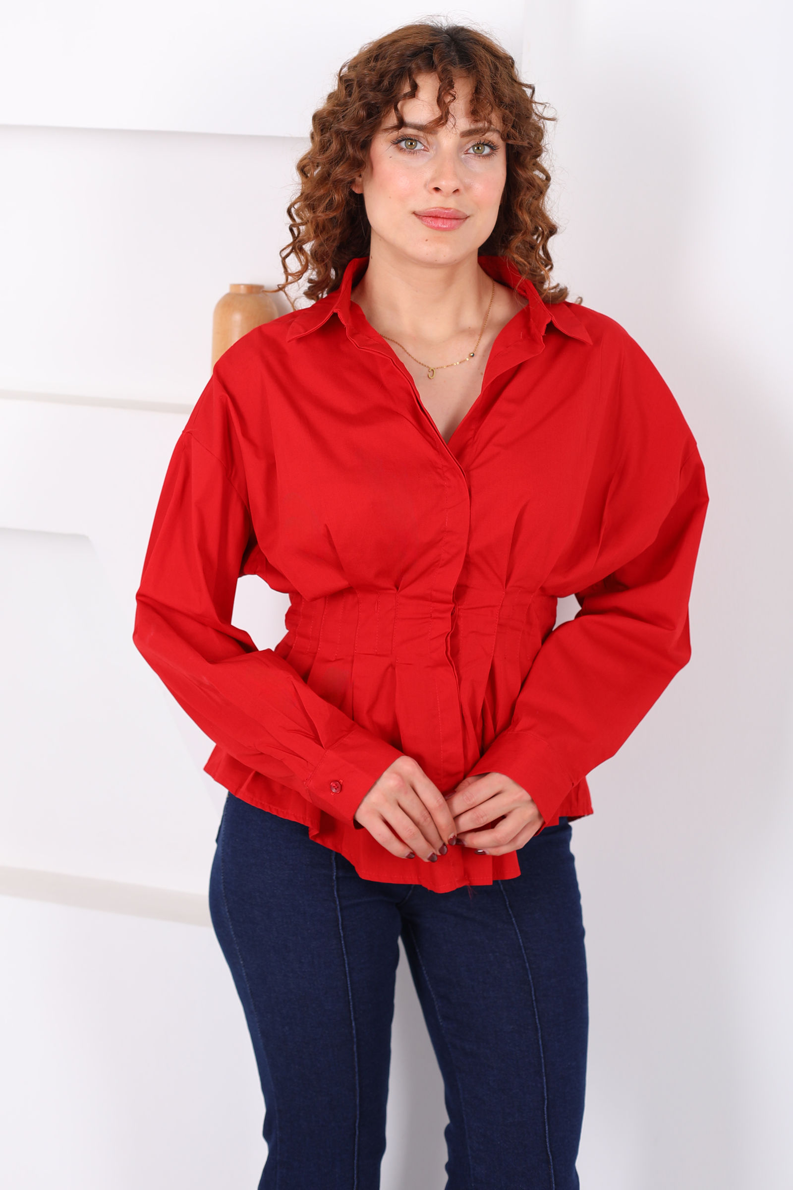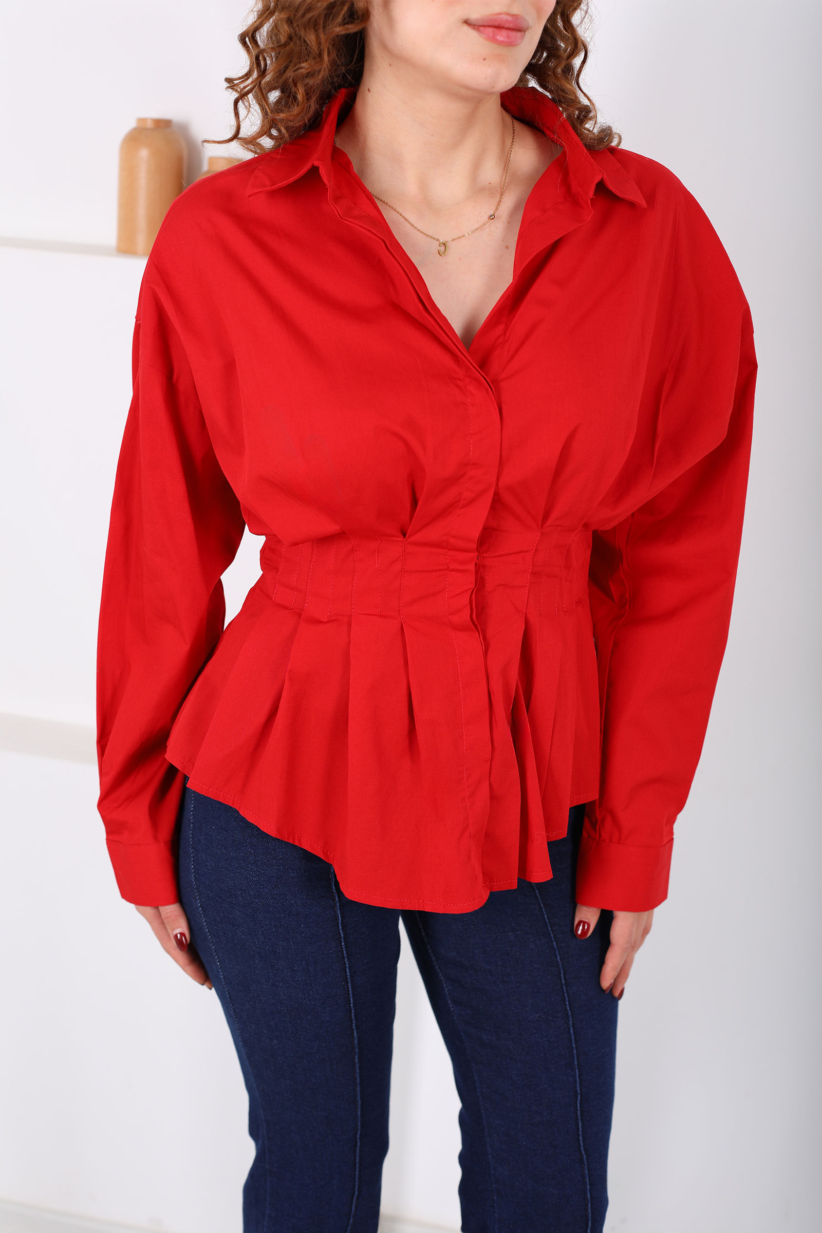 Gizli Düğmeli Belden Oturtmalı Kadın Kırmızı Pileli Gömlek