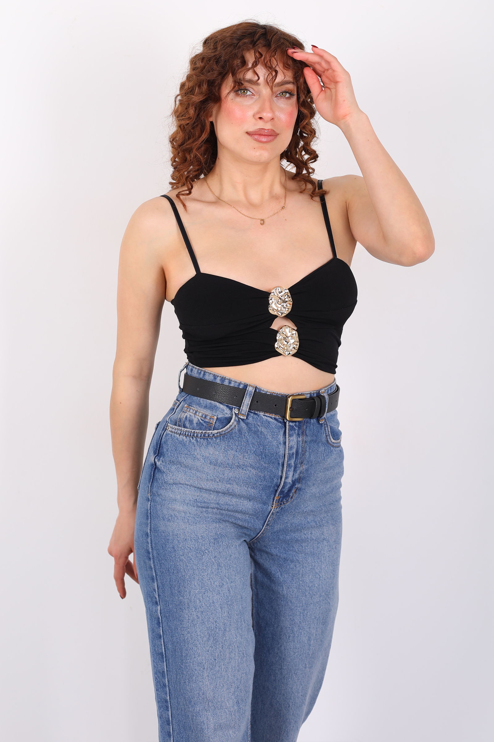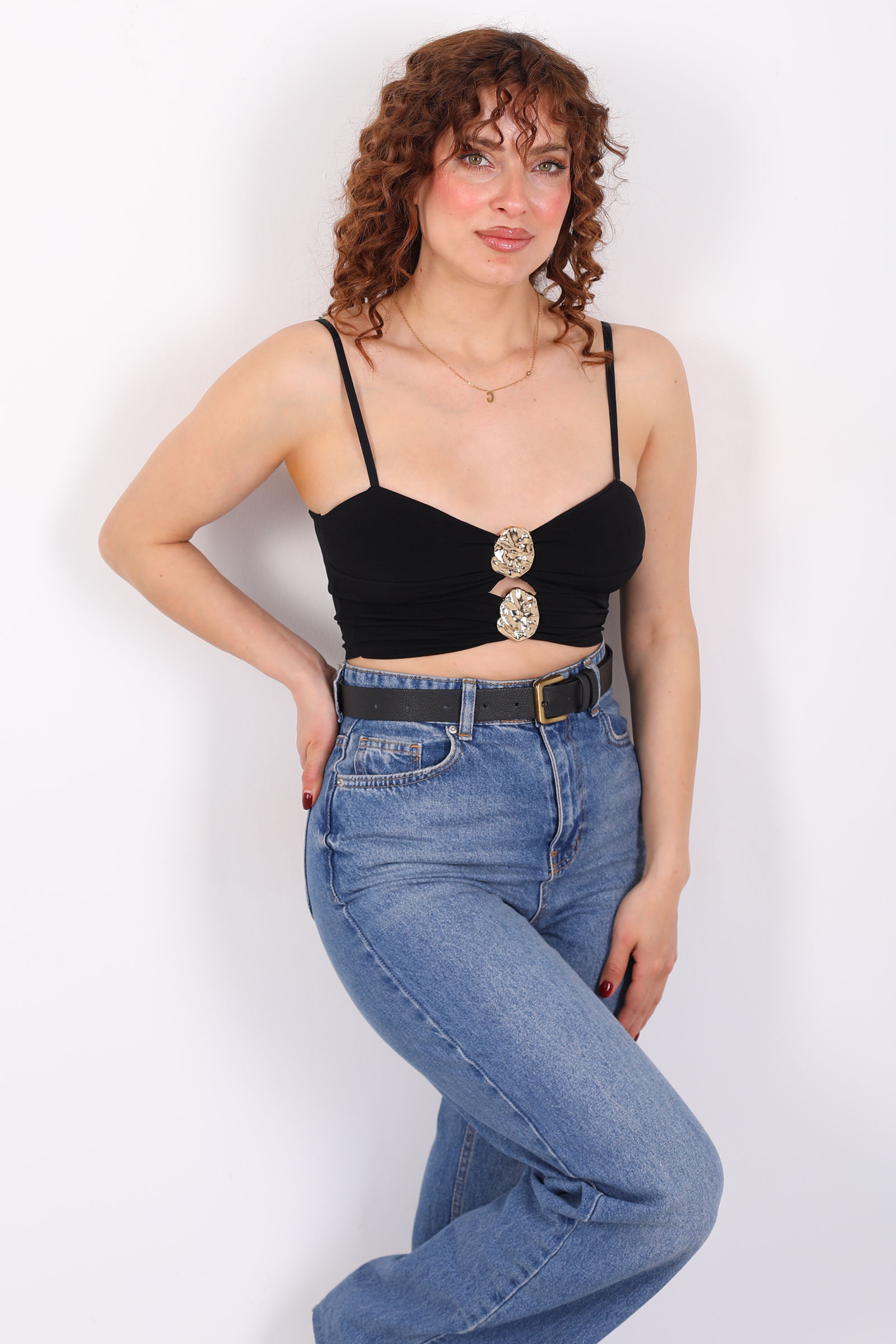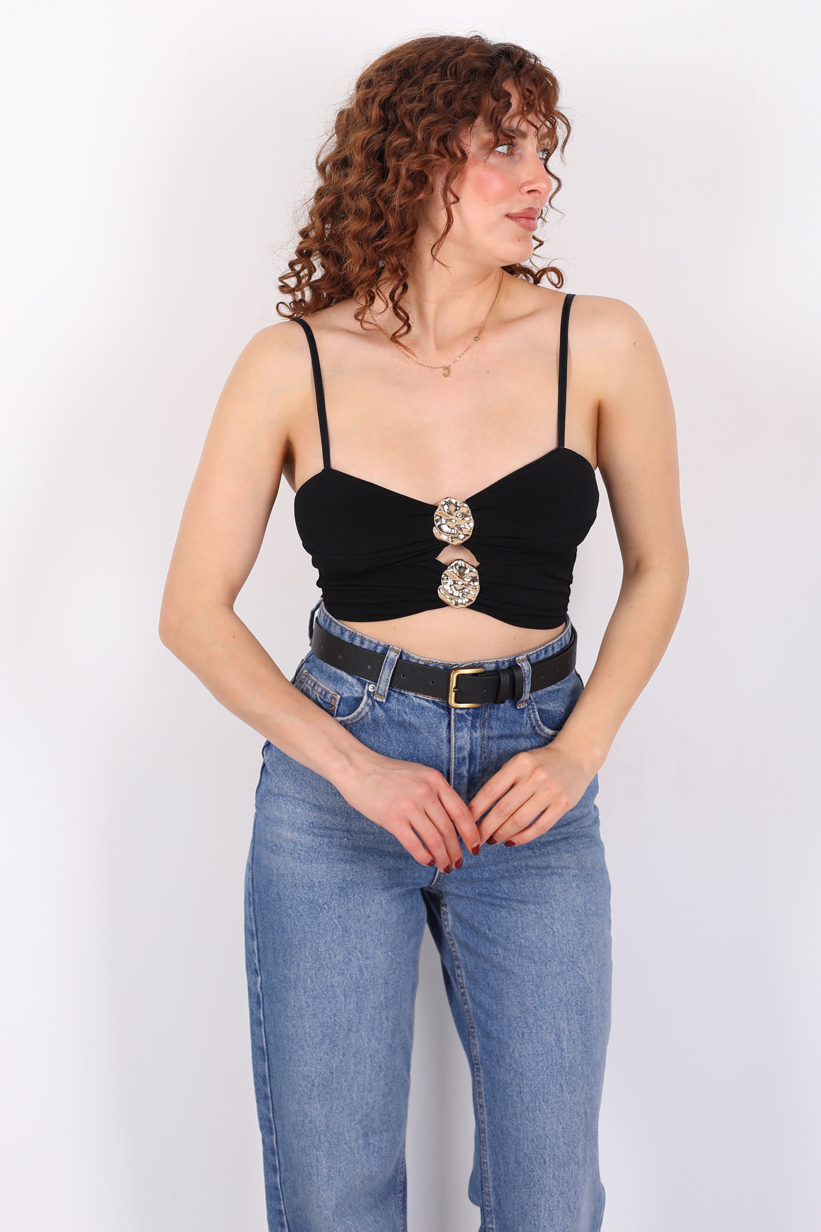 Bel Detaylı Aksesuarlı Siyah Kadın Sandy Crop