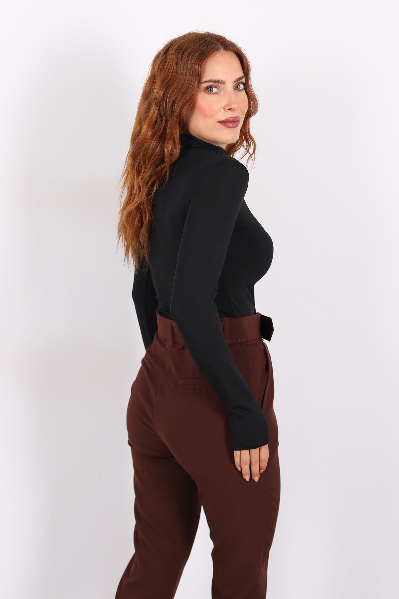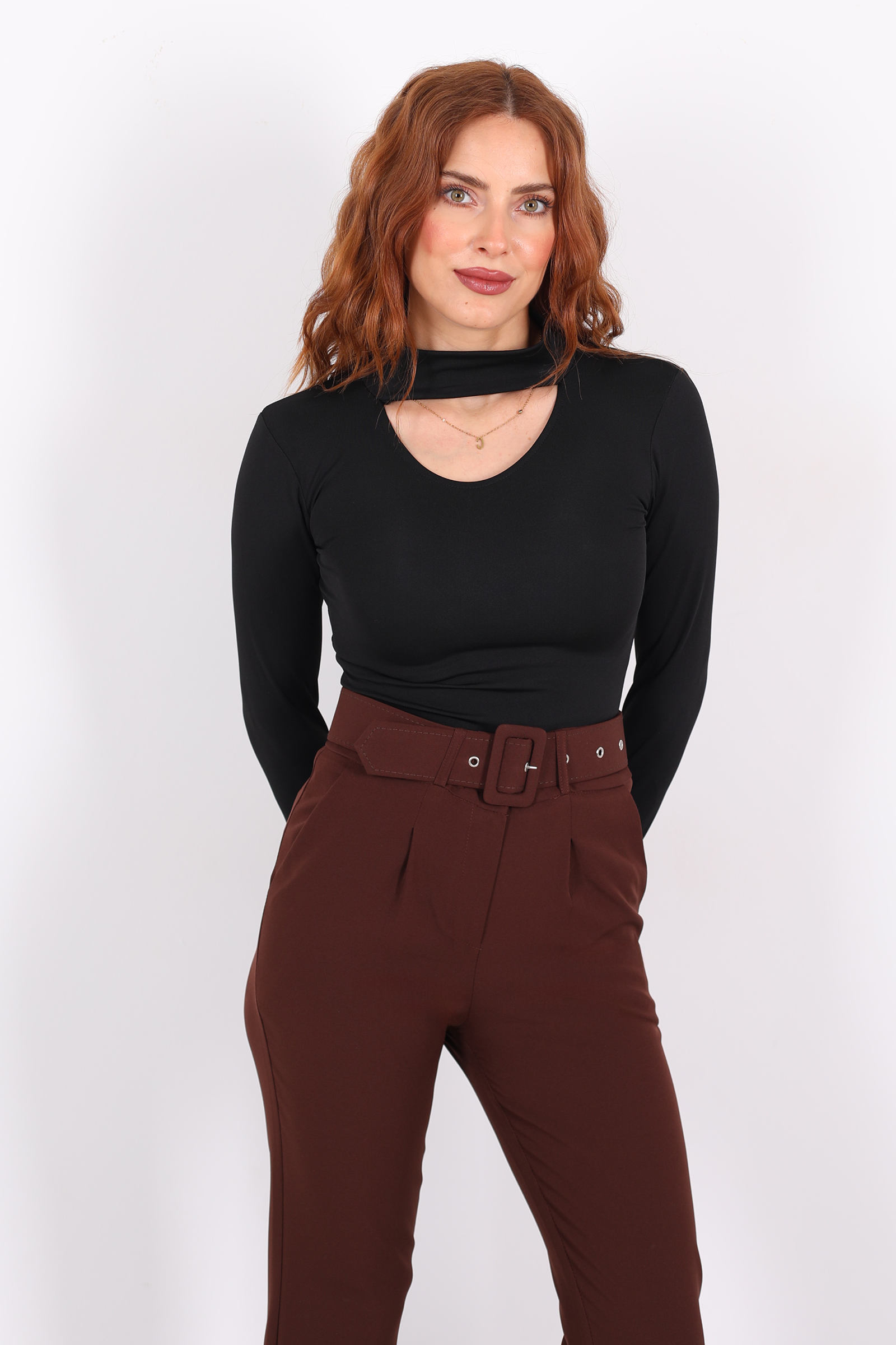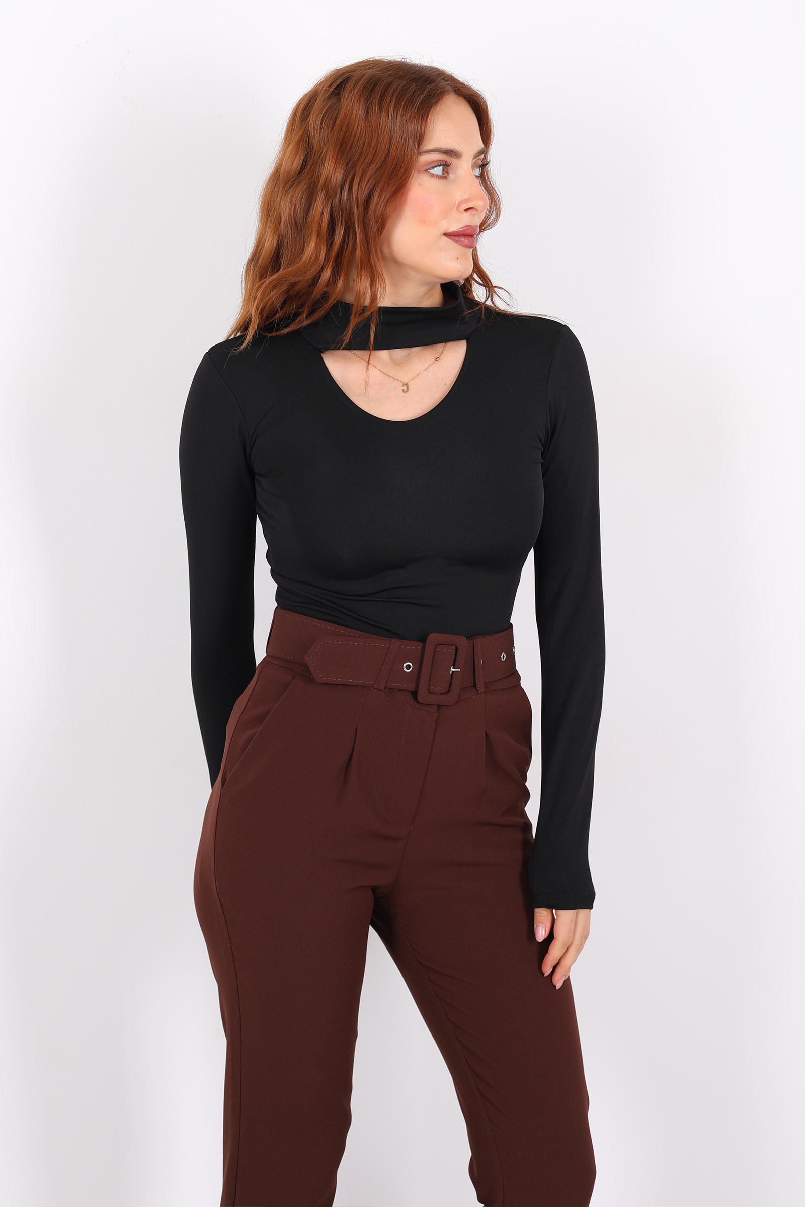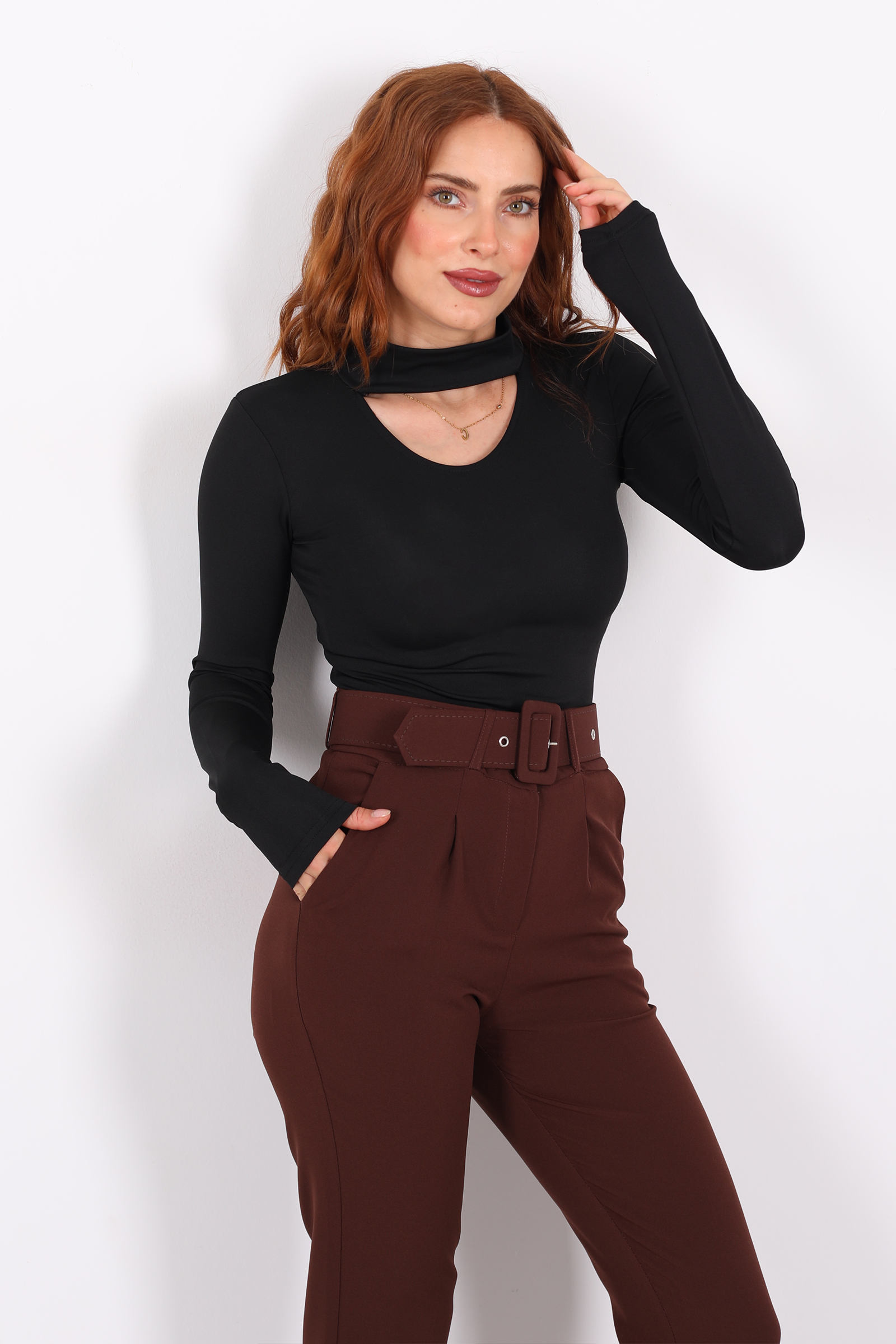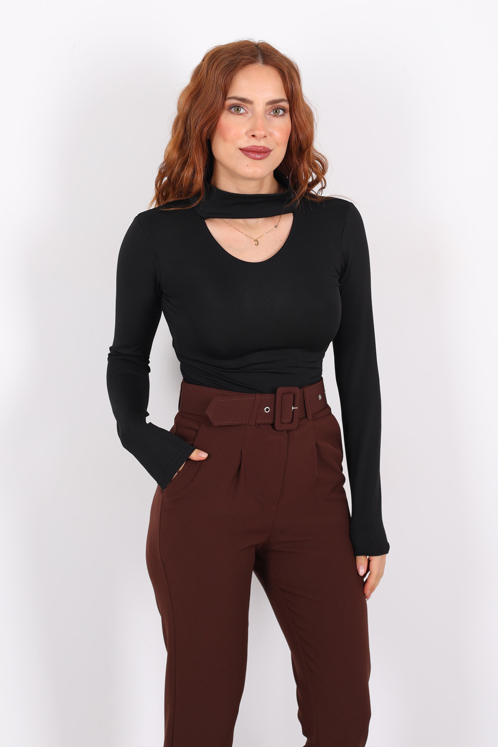 Siyahın zamansız zarafetini taşıyan bu bluz, balıkçı yaka ve dikkat çekici göğüs detayıyla klasik ve moderni ustalıkla bir araya getiriyor. Yaka yapısı boyun hattınızı zarafetle vurgularken, göğüs kısmındaki detaylar bluzun basit formuna ince ama etkili bir stil dokunuşu kazandırıyor.Siyah skinny pantolon ve tenis ayakkabı ile sade ve şehirli bir görünüm yakalayabilirsiniz.