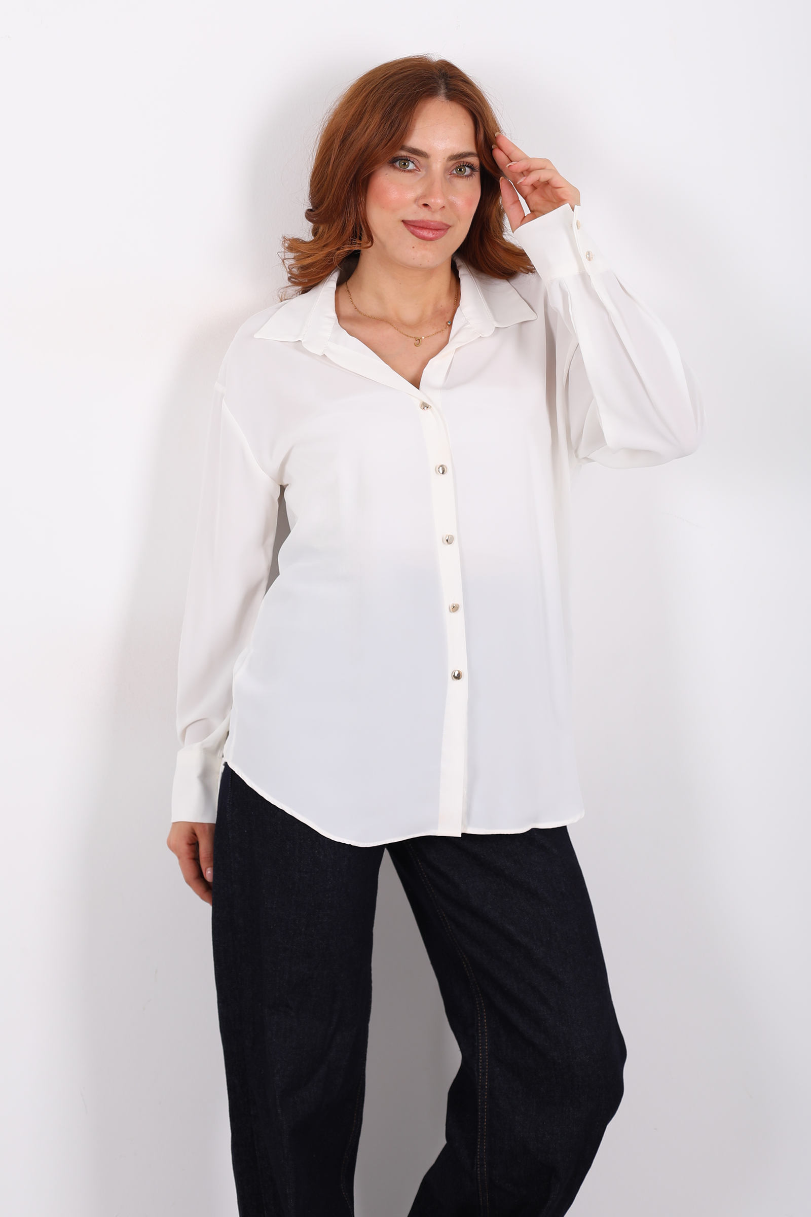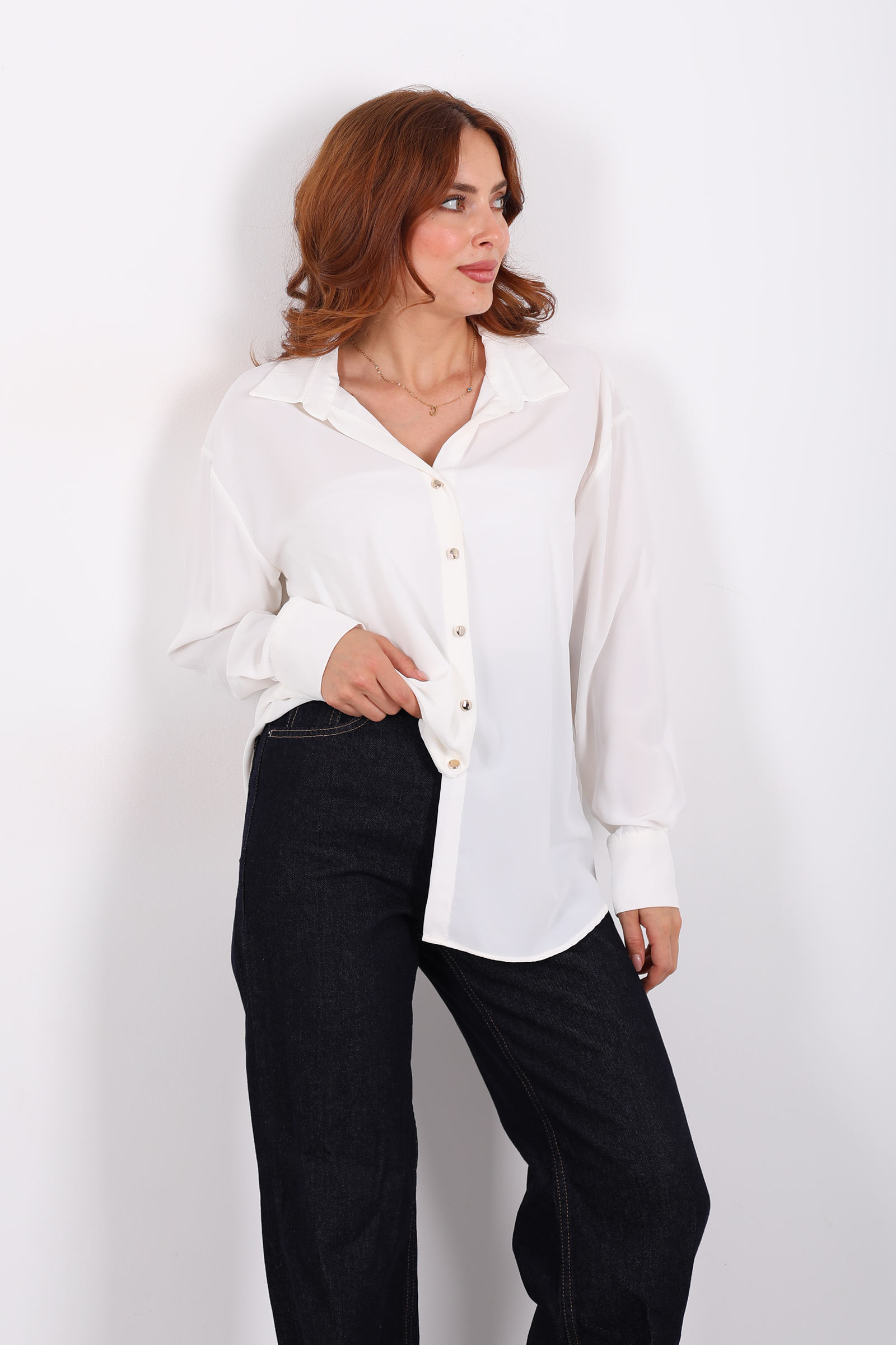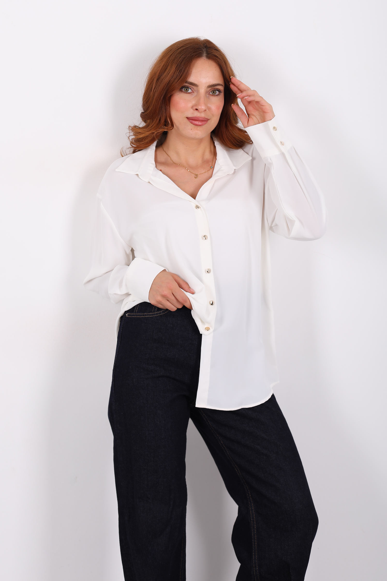 İpeksi dokusuyla ışığı yansıtan bu beyaz saten gömlek, altın düğmelerle zarafeti zirveye taşıyor. Parlak saten kumaşı, modern ve zarif bir görünüm sunarken, gömleğe hem lüks hem akıcı bir hava katıyor.Derin olmayan ama dikkat çekici V‑yakası, boyun hattınızı nazikçe vurguluyor ve altın düğmeler, gömleğin ön tarafında zarif bir ritim yaratıyor. Düğmeleri kapatıldığında klasik ve düzenli bir siluet oluşurken, birkaç düğme açık bırakılarak da daha rahat ve rahat akışlı bir stil yakalanabilir.