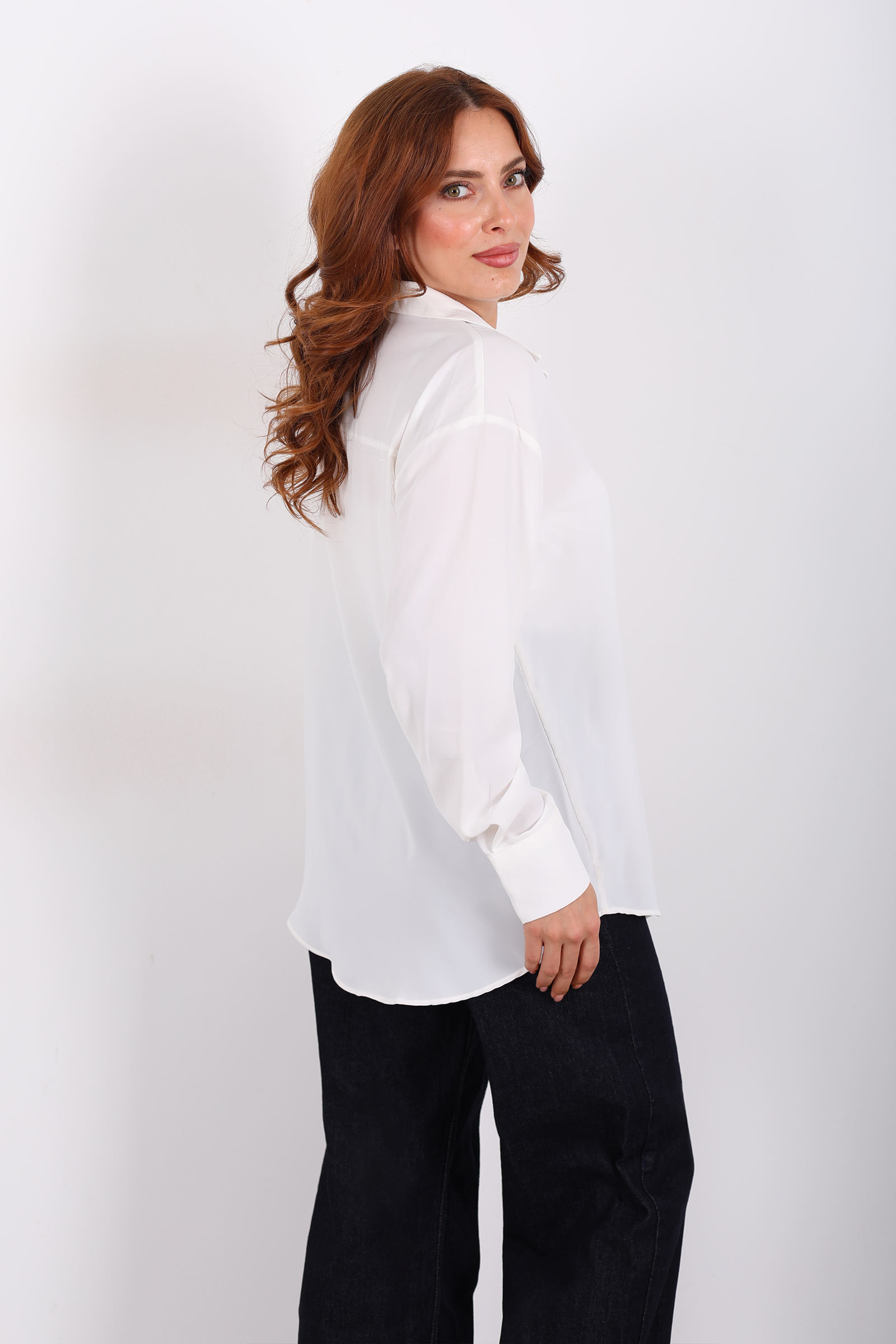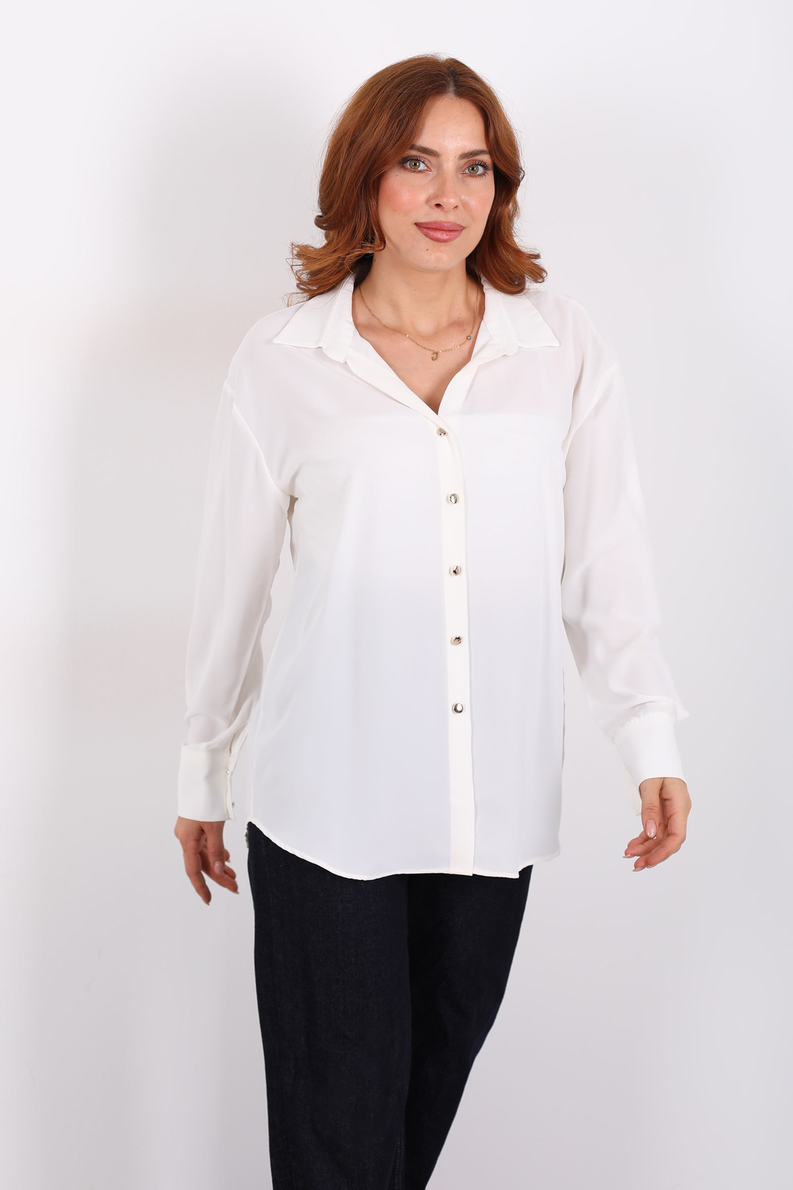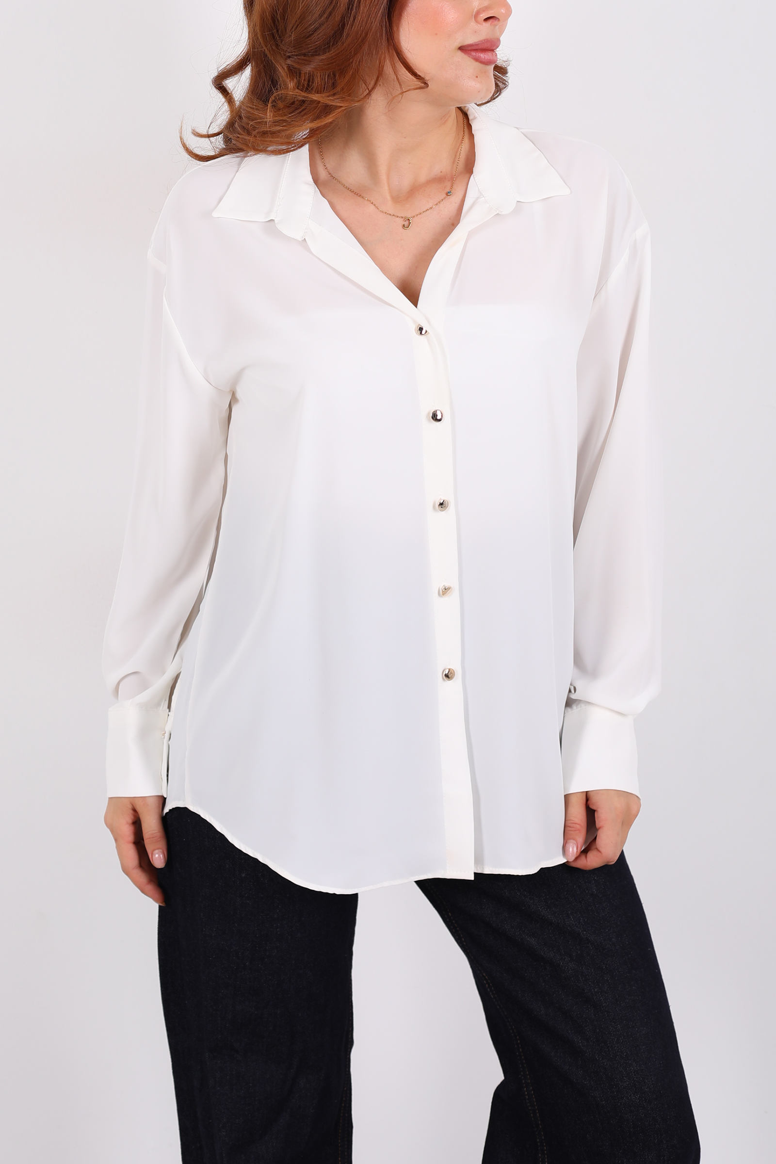 İpeksi dokusuyla ışığı yansıtan bu beyaz saten gömlek, altın düğmelerle zarafeti zirveye taşıyor. Parlak saten kumaşı, modern ve zarif bir görünüm sunarken, gömleğe hem lüks hem akıcı bir hava katıyor.Derin olmayan ama dikkat çekici V‑yakası, boyun hattınızı nazikçe vurguluyor ve altın düğmeler, gömleğin ön tarafında zarif bir ritim yaratıyor. Düğmeleri kapatıldığında klasik ve düzenli bir siluet oluşurken, birkaç düğme açık bırakılarak da daha rahat ve rahat akışlı bir stil yakalanabilir.