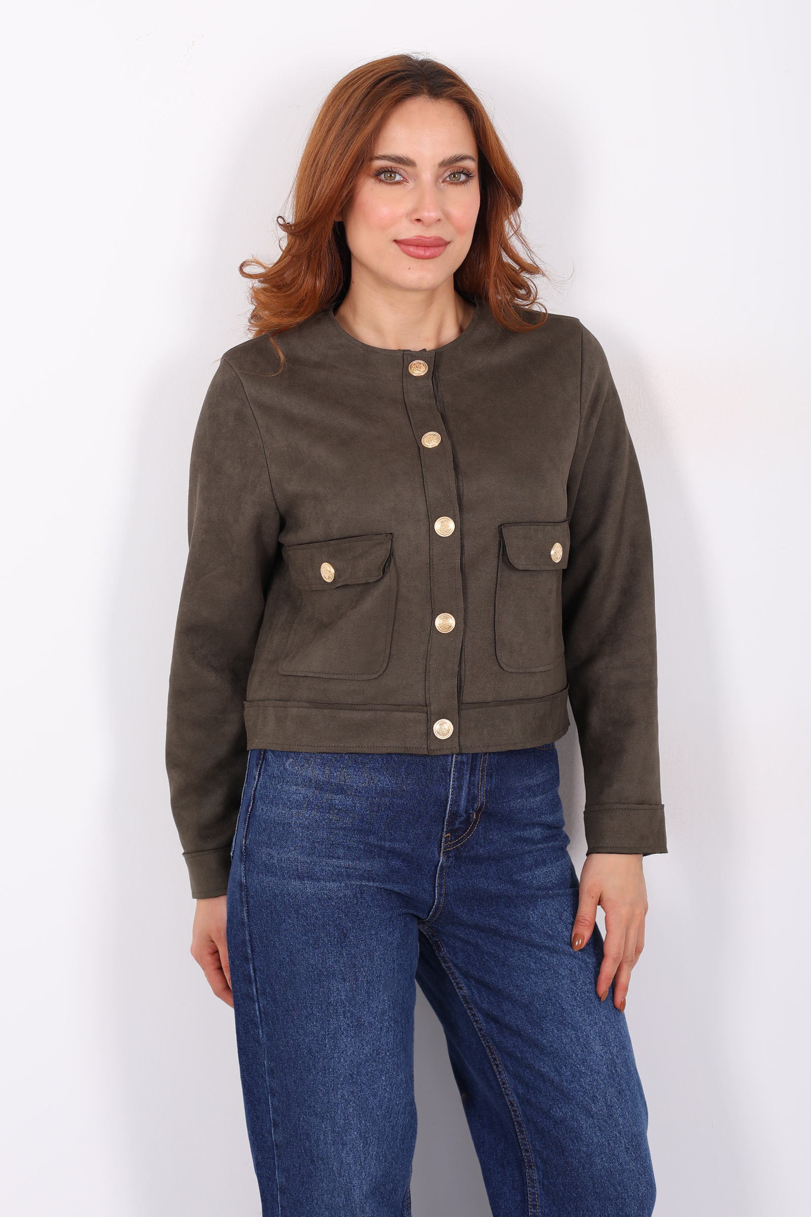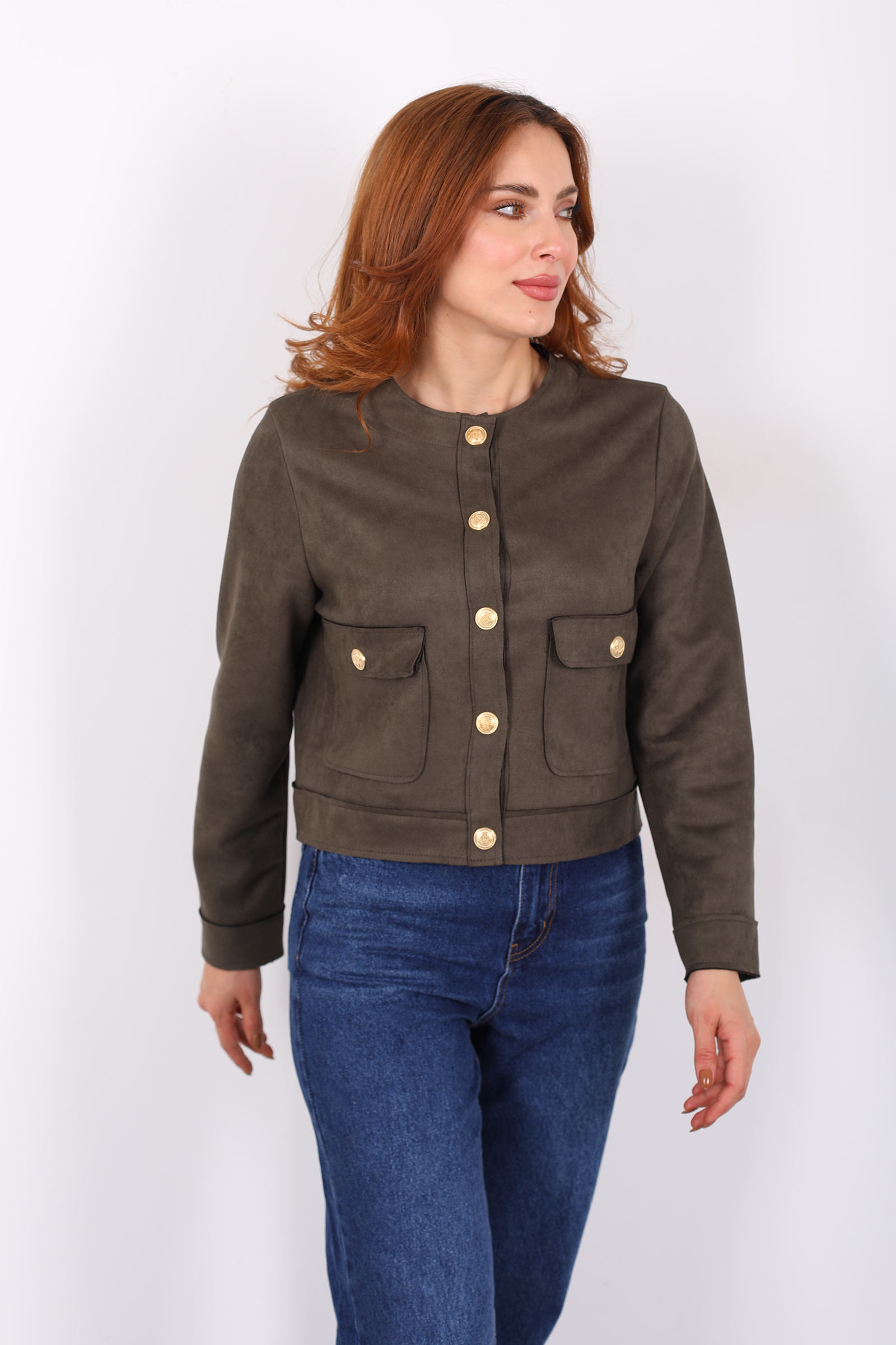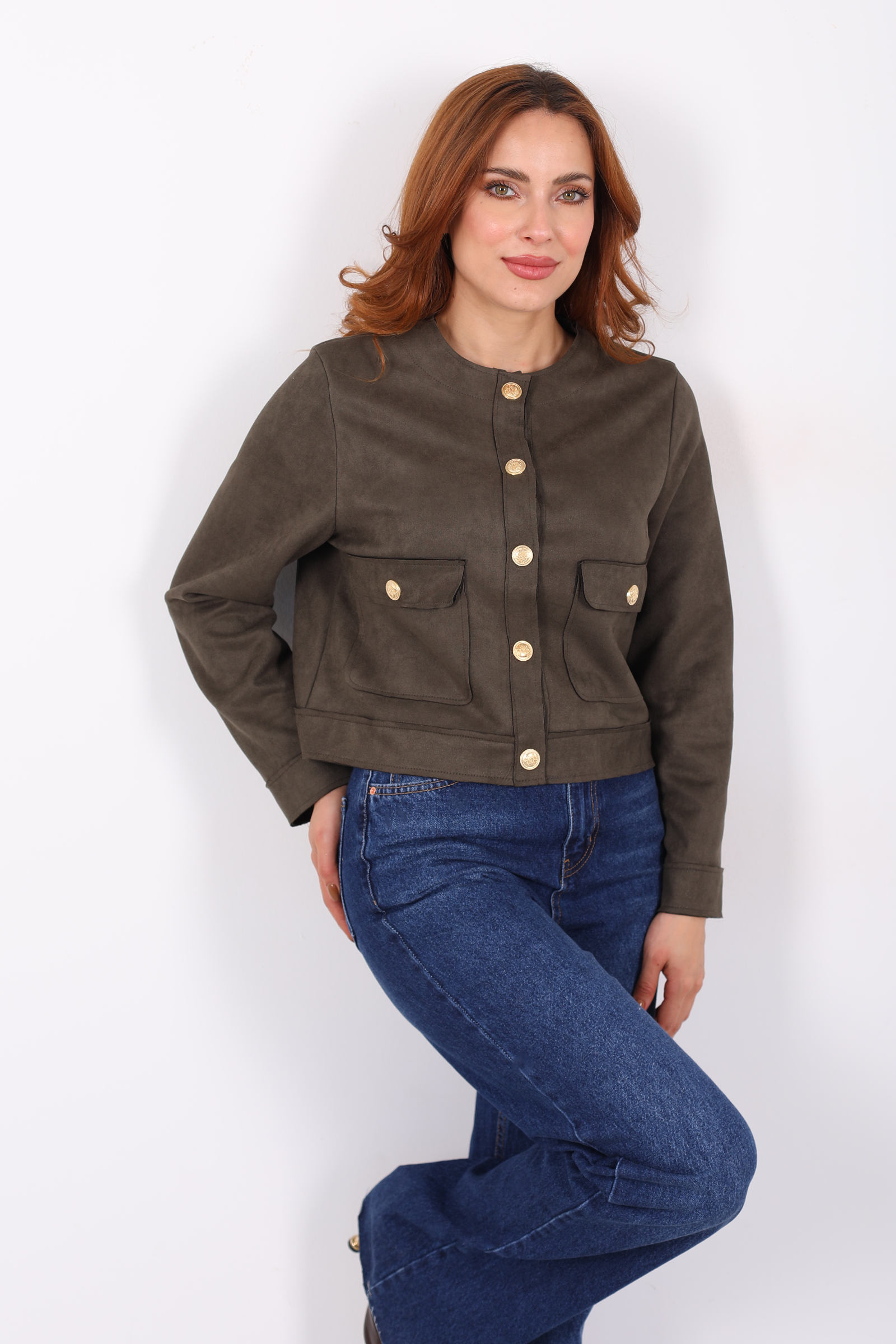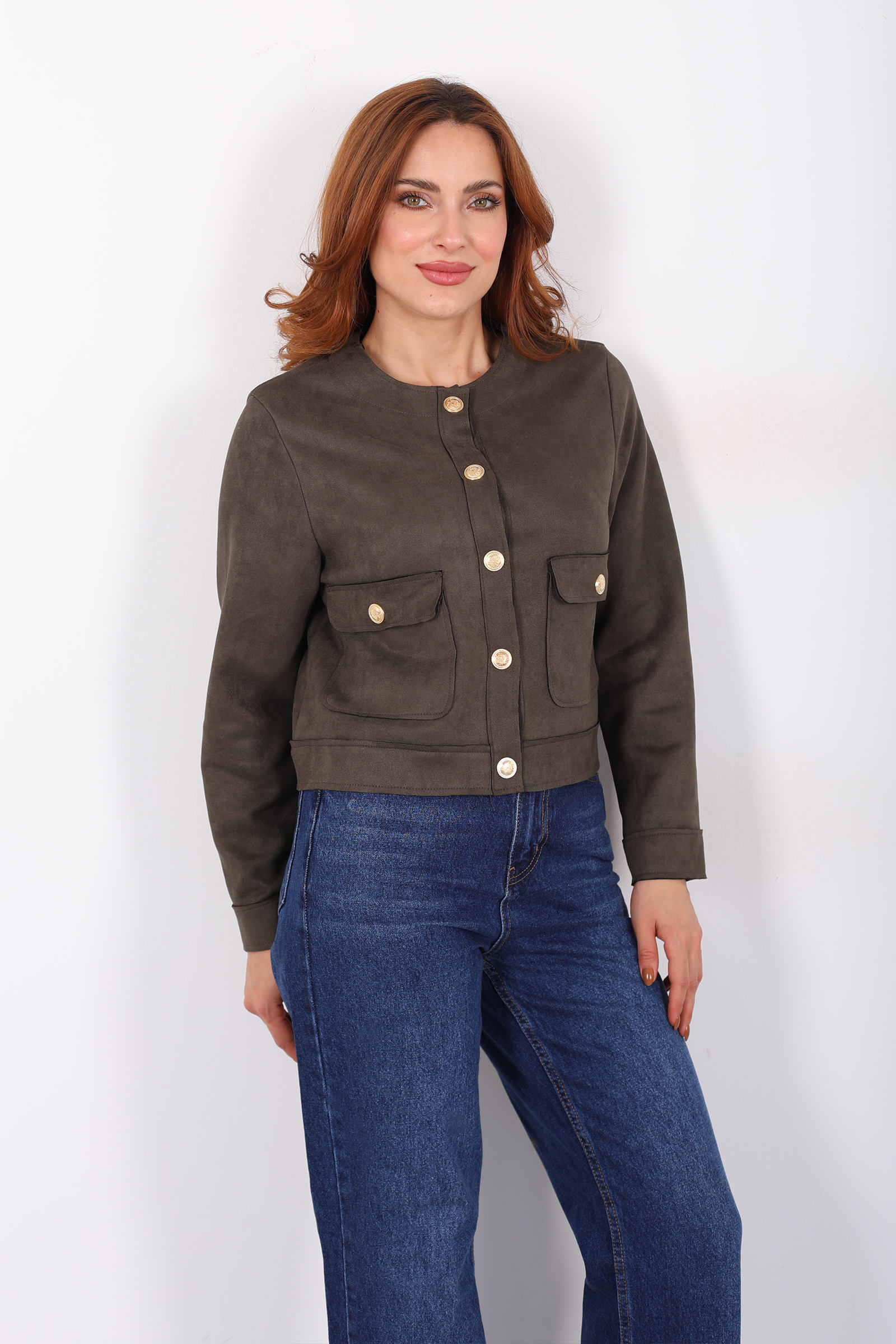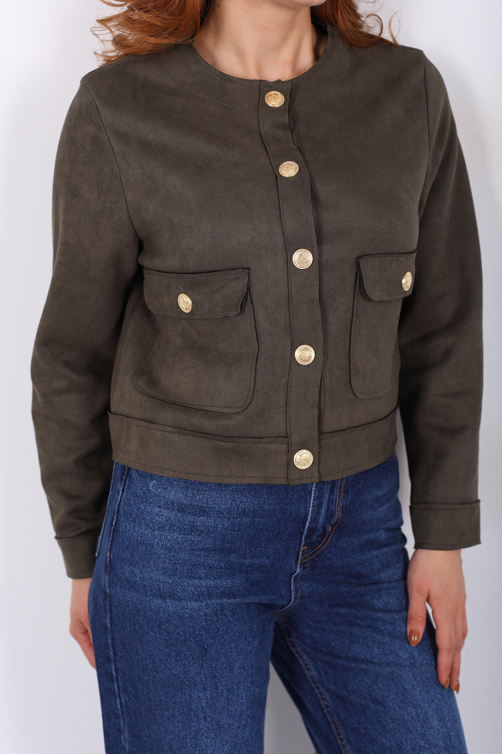 Gold Düğmeli Çift Cepli Haki Kadın Süet Ceket