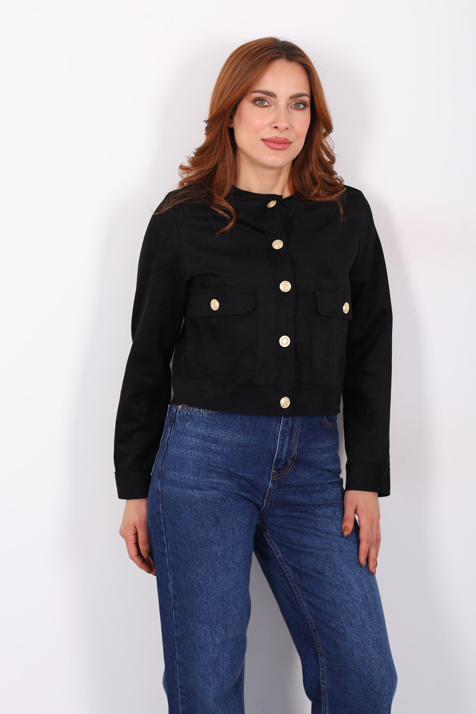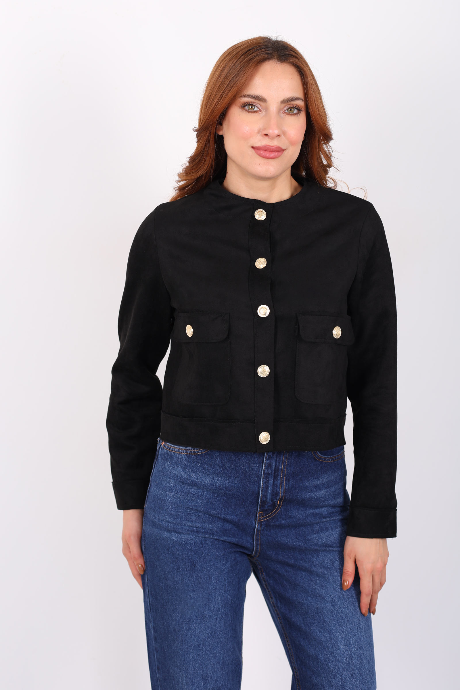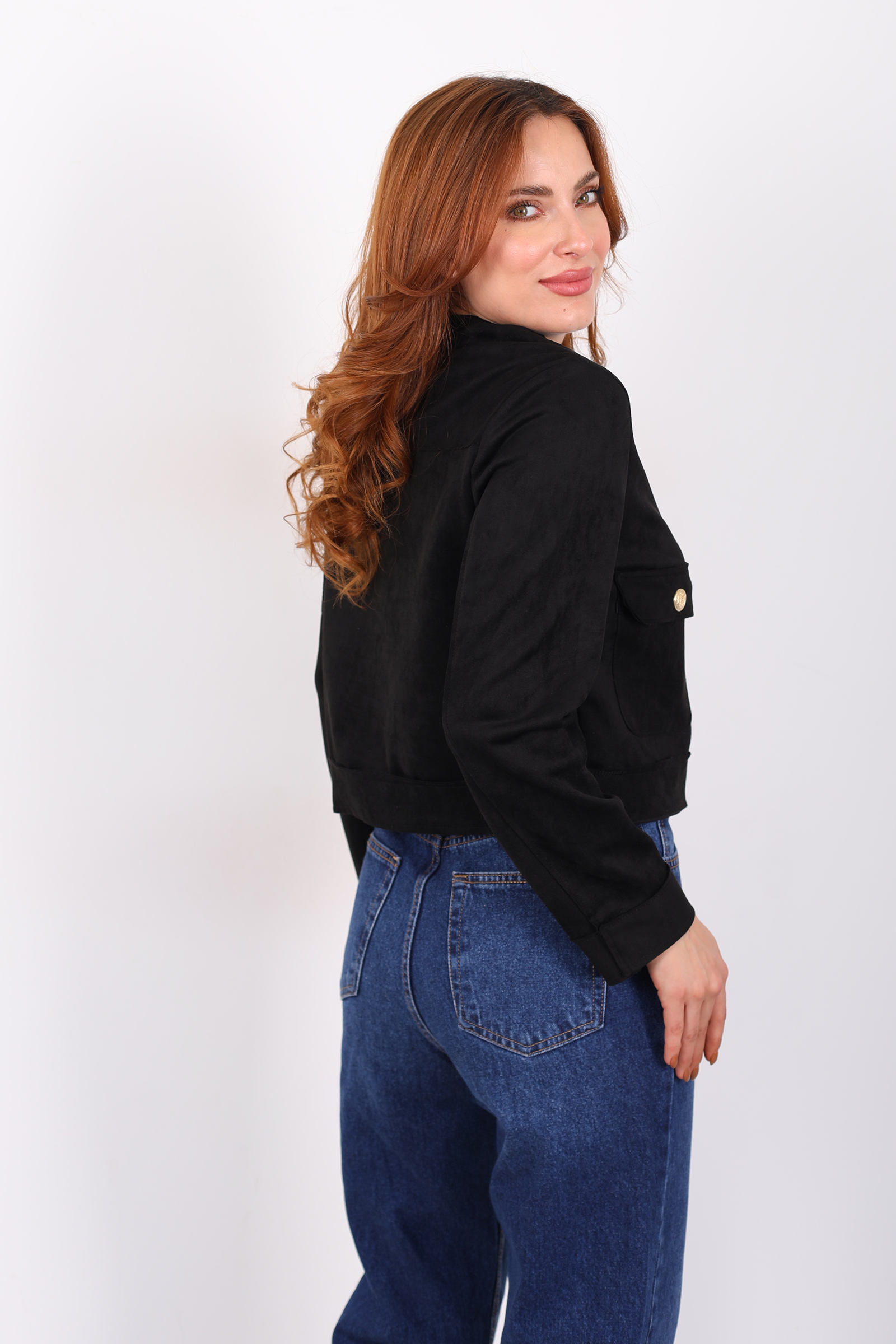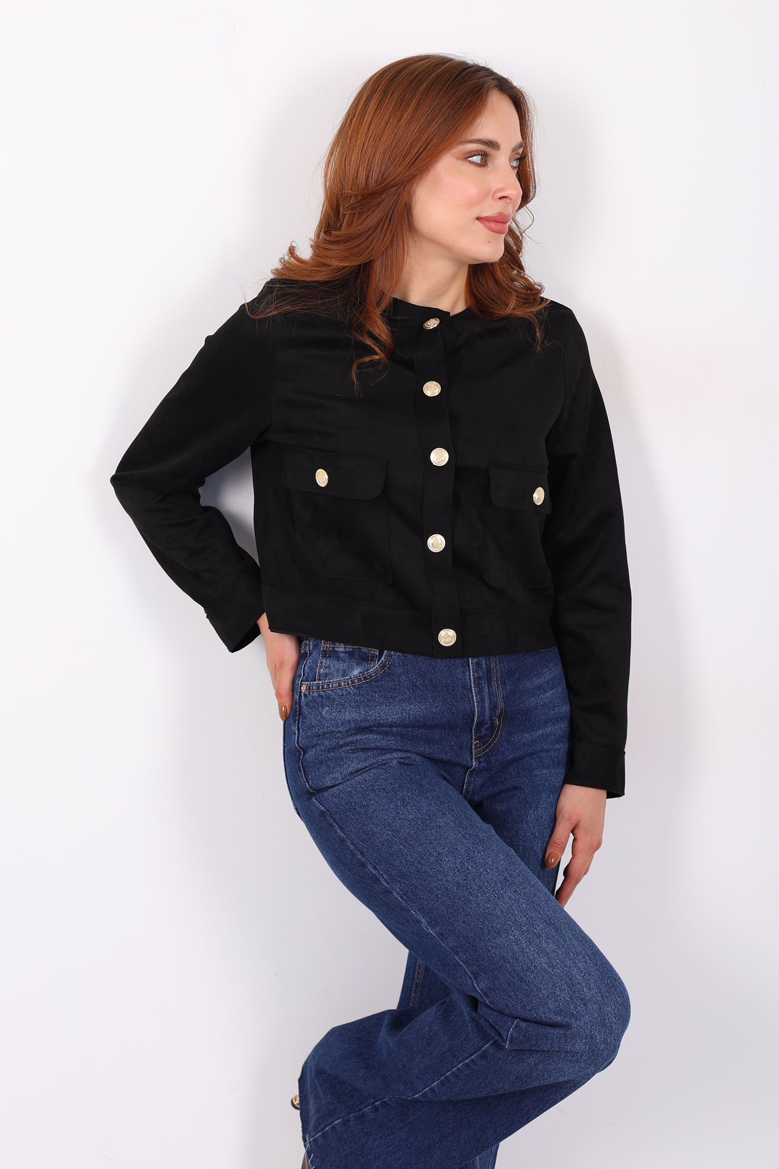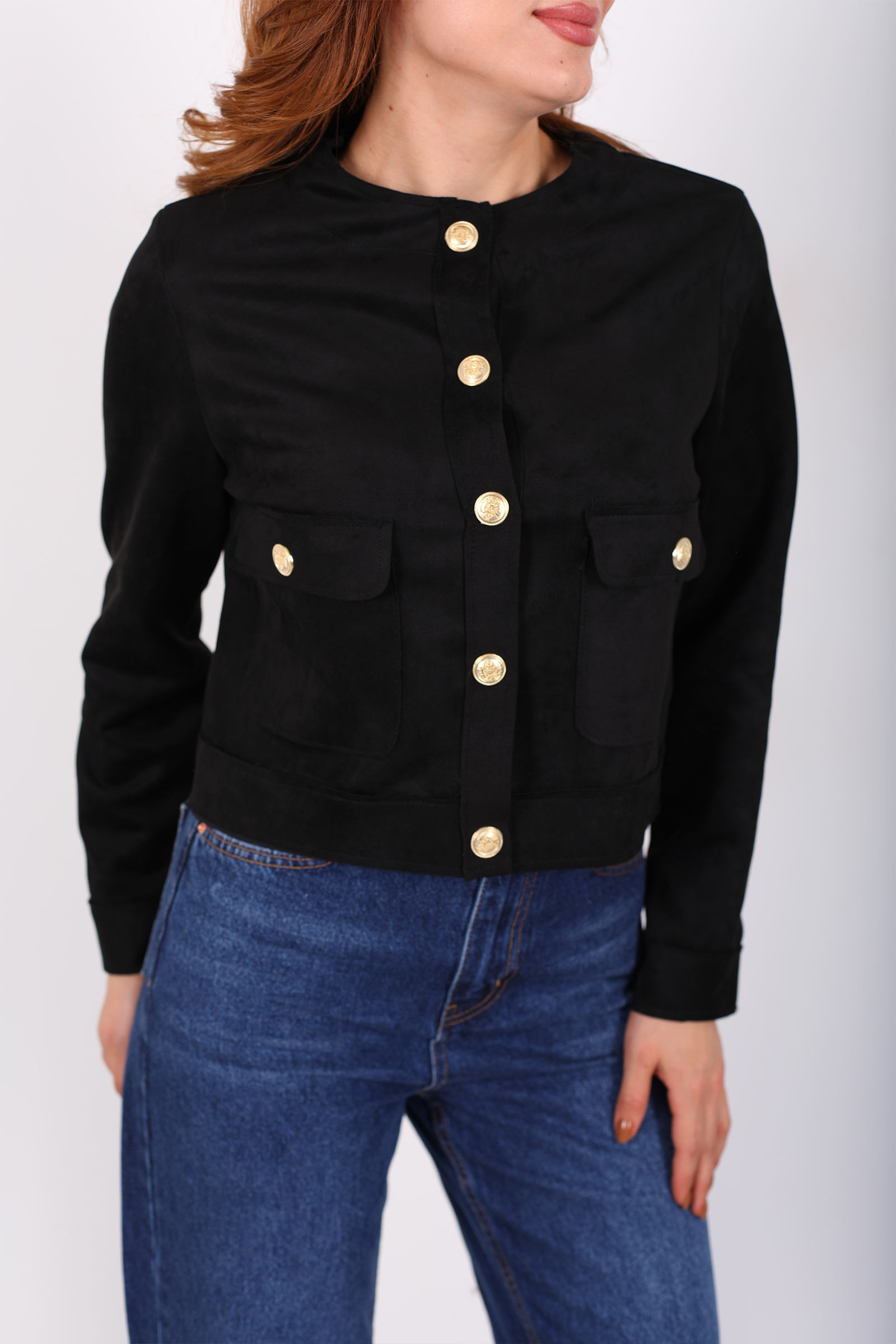 Gold Düğmeli Çift Cepli Siyah Kadın Süet Ceket