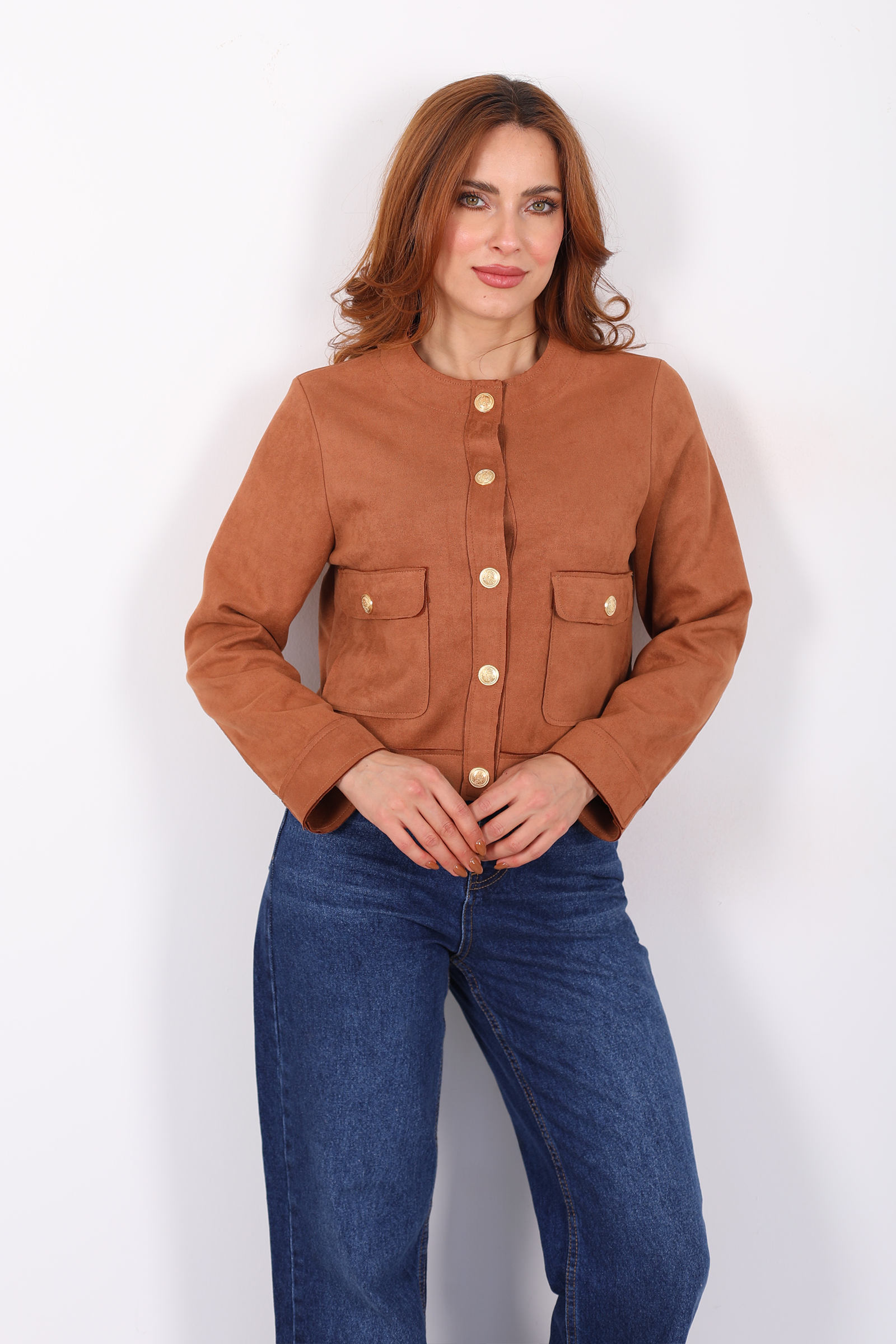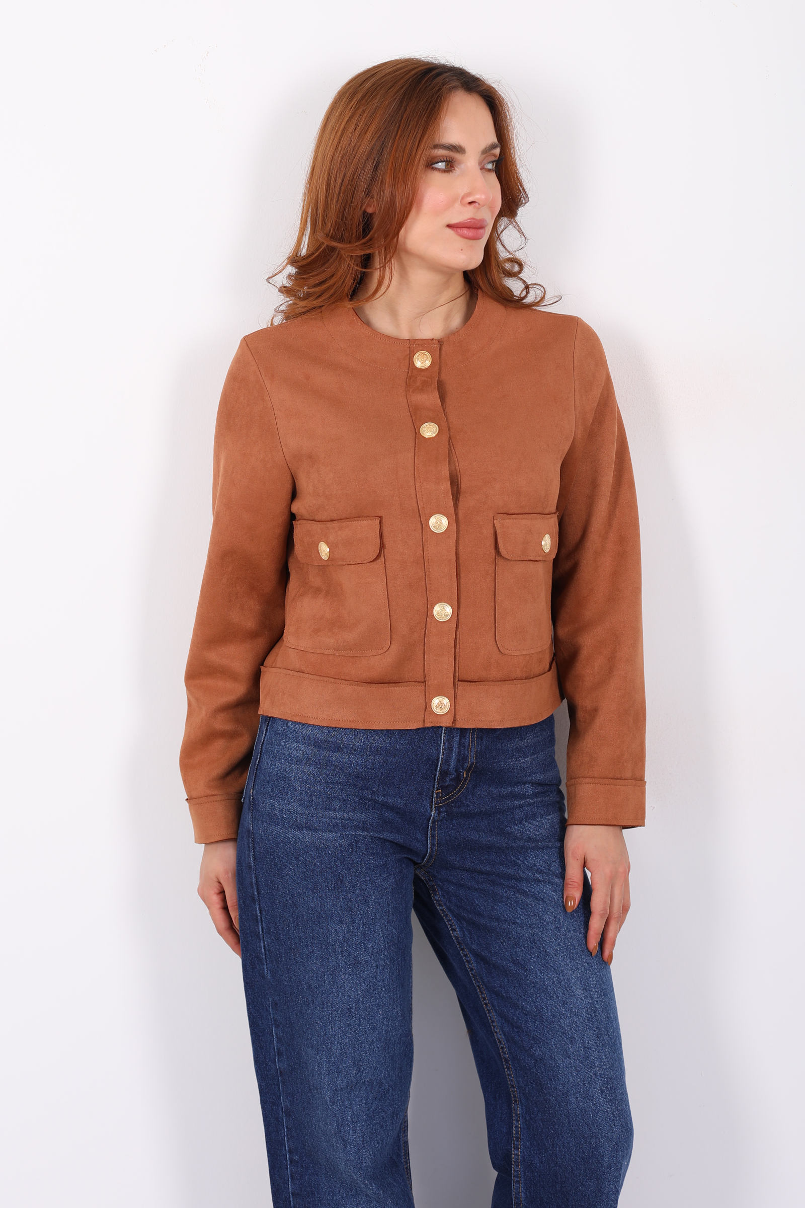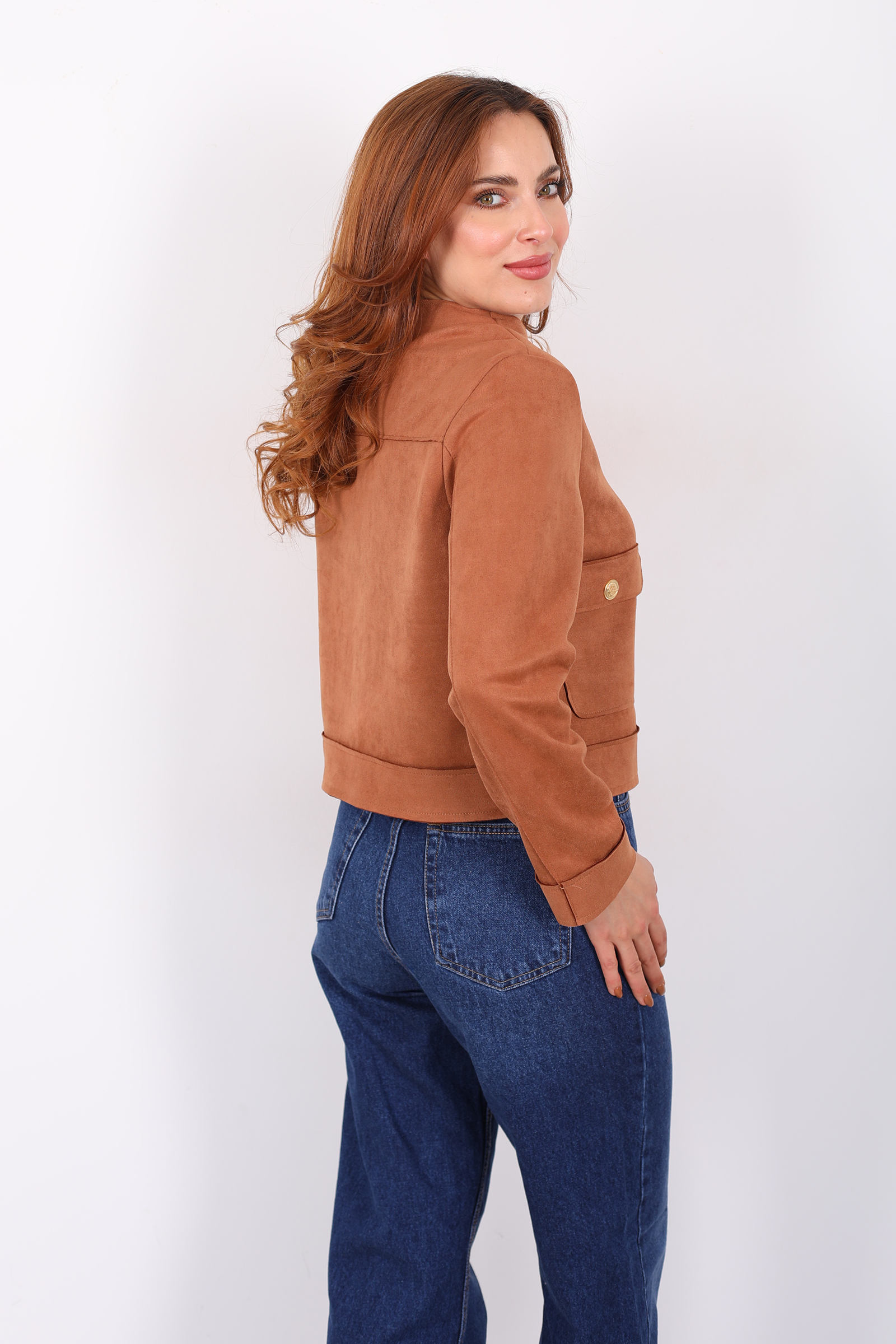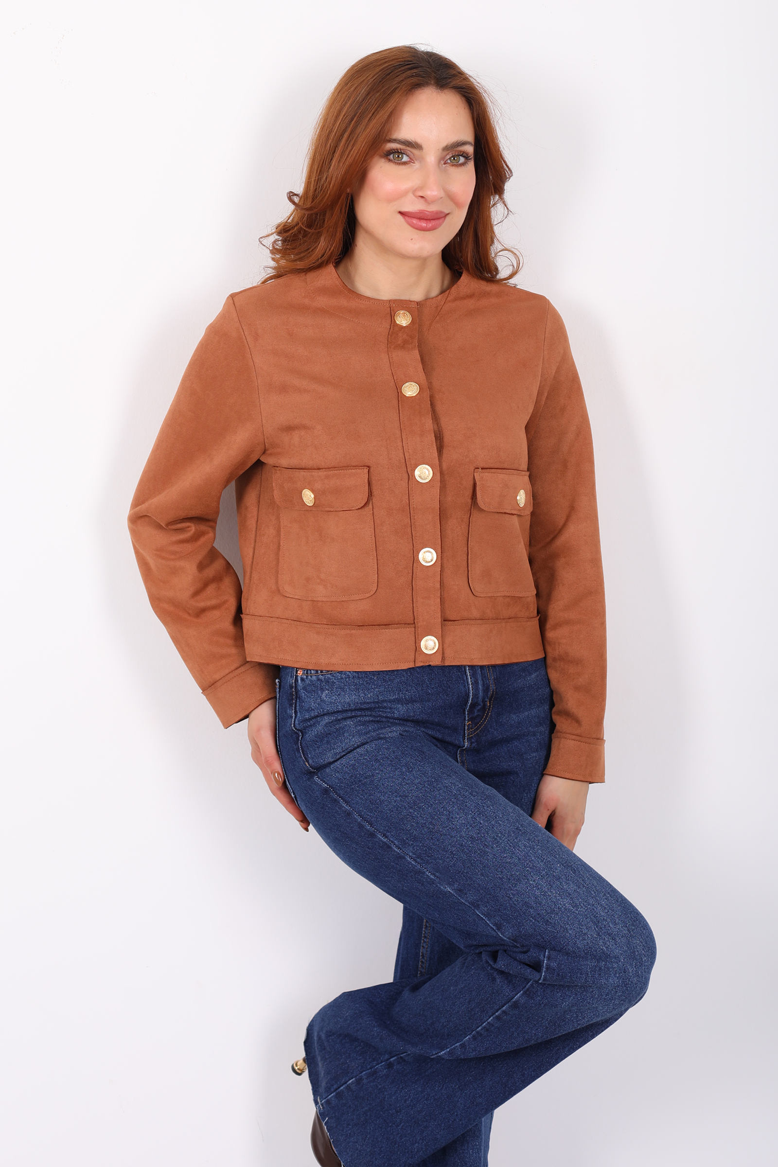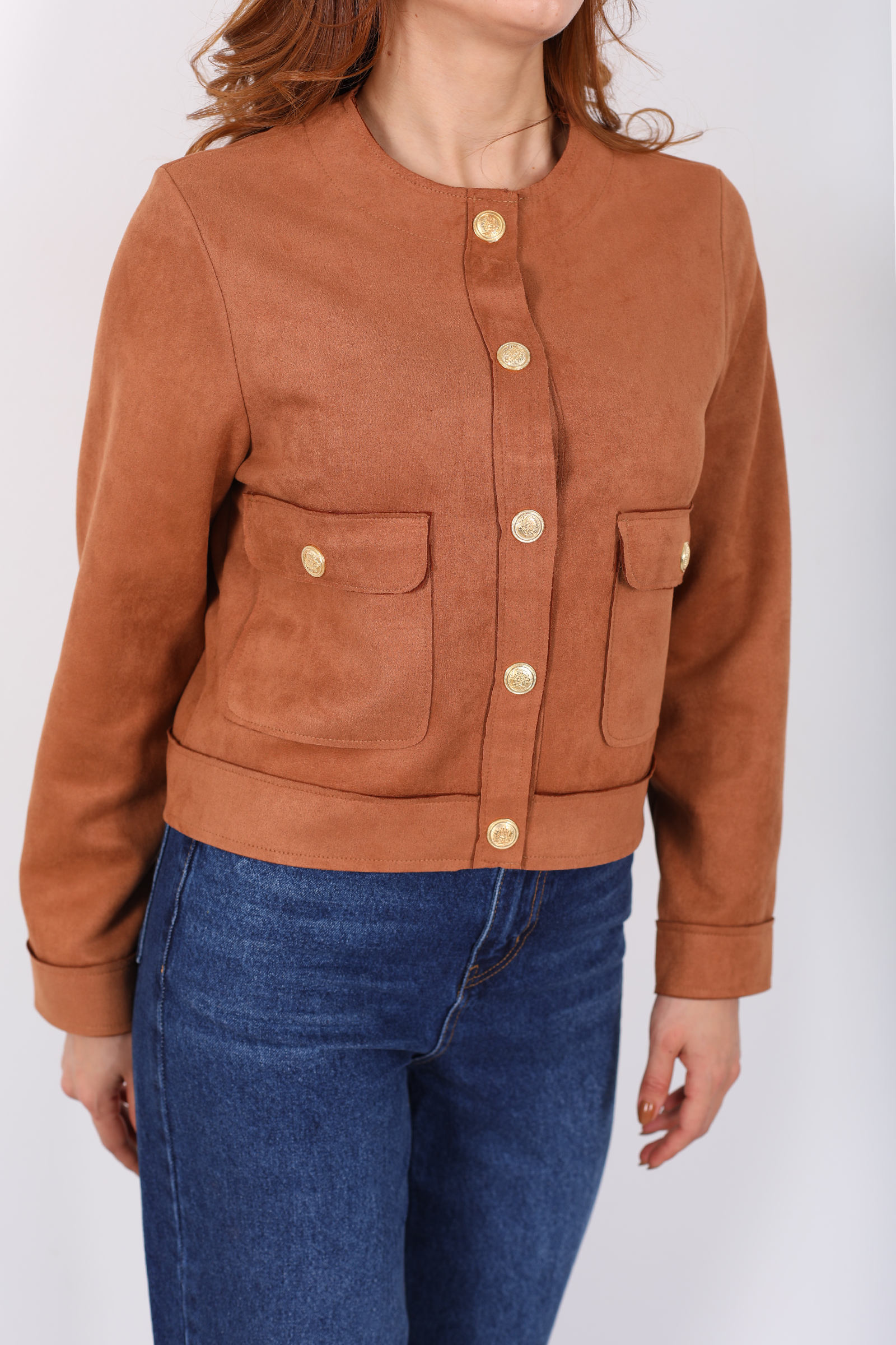 Sıcak taba tonu ve gold düğme detaylarıyla öne çıkan bu süet ceket, çift cepli tasarımıyla hem şık hem fonksiyonel bir görünüm sunuyor. Yumuşak süet dokusu gün boyu konfor sağlarken, modern kesimi feminen bir siluet yaratır. Jean, pantolon veya eteklerle kombinlendiğinde gündelik veya özel günlerde öne çıkan çok yönlü bir parça. Gardırobunuzun stil sahibi ve dikkat çeken öğelerinden biri.