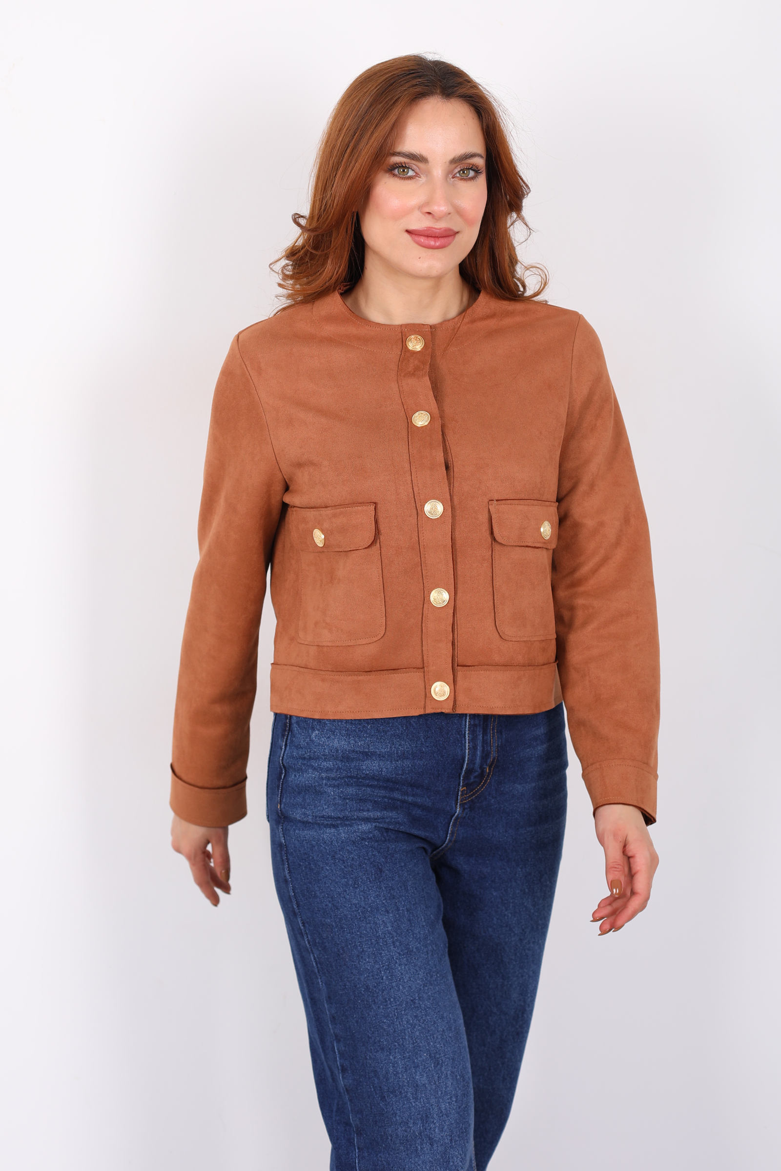 Gold Düğmeli Çift Cepli Taba Kadın Süet Ceket