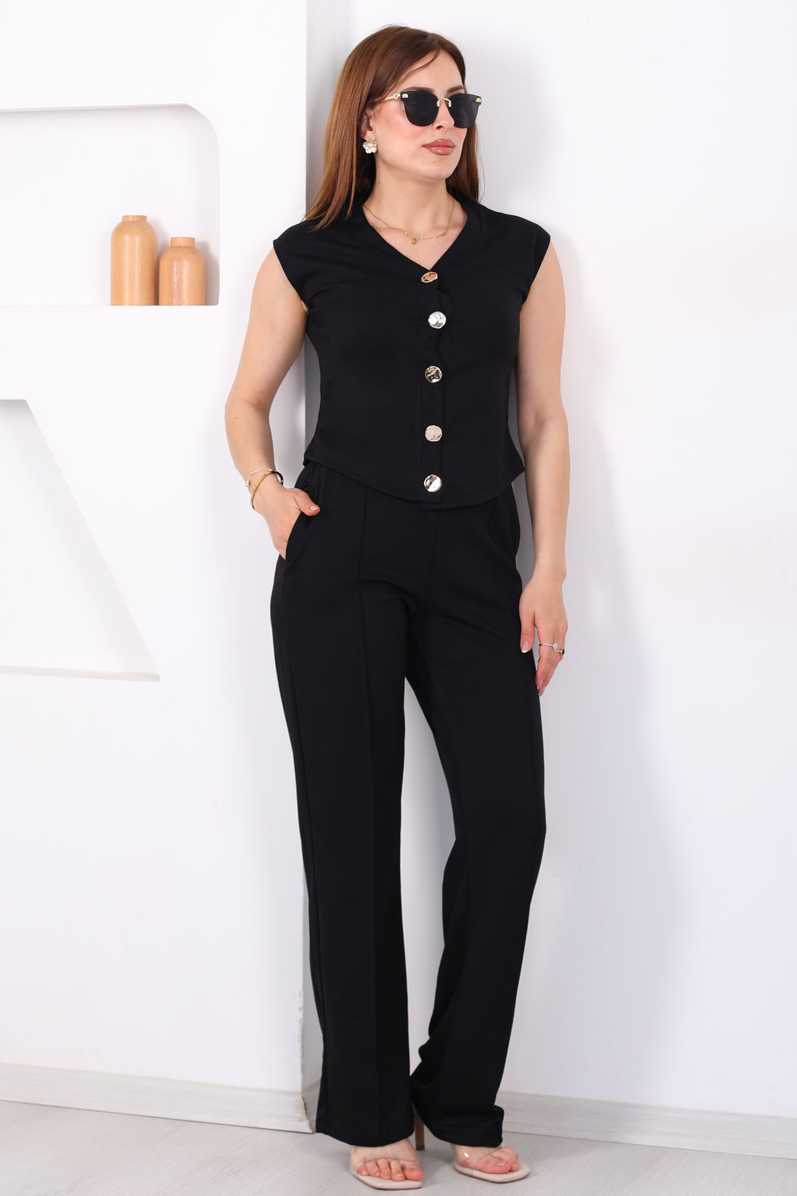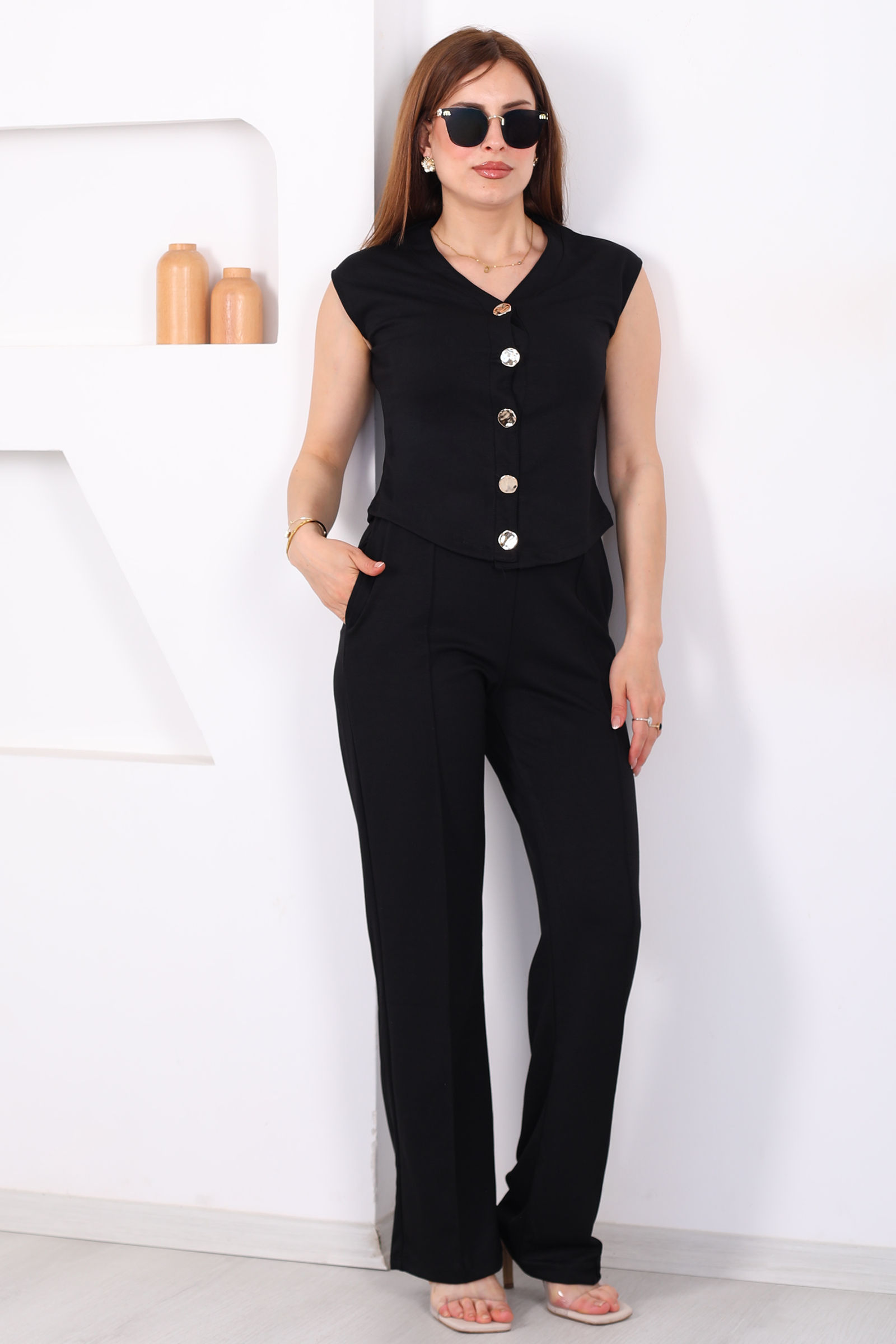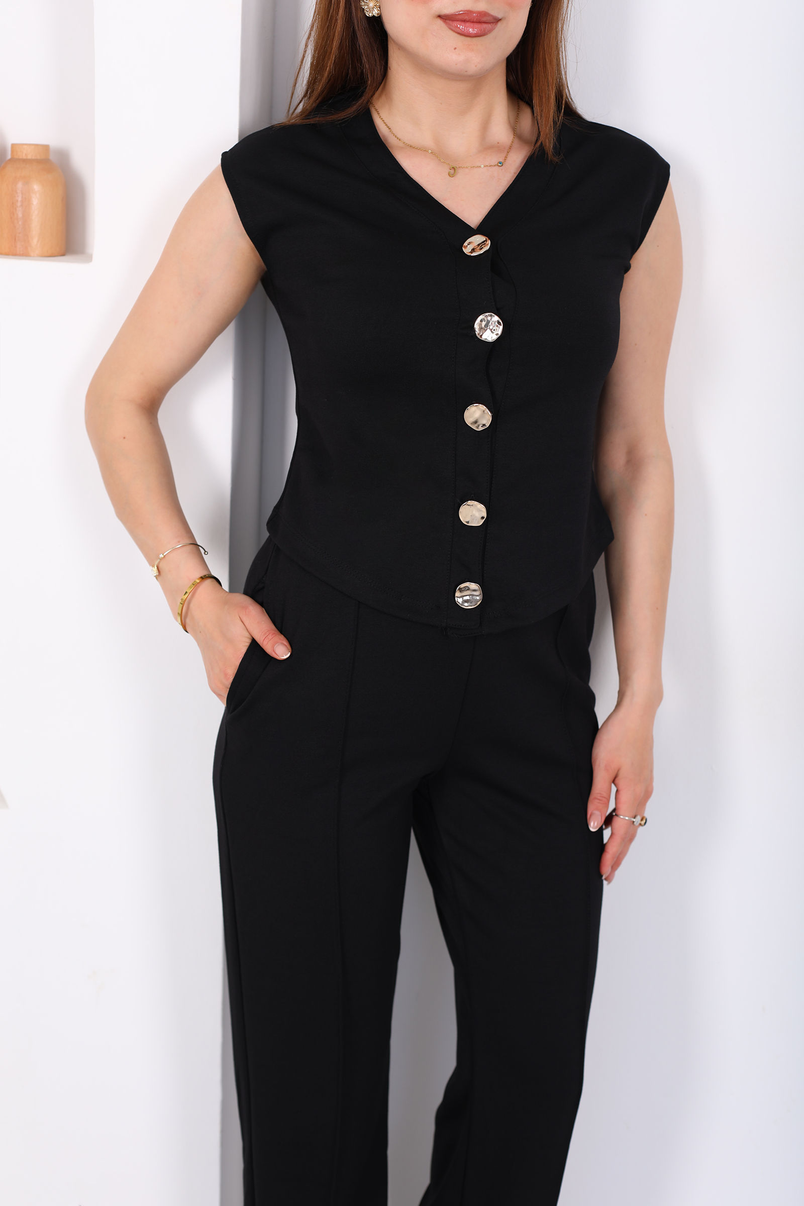 Gold Düğmeli Çimalı Kadın Siyah Modal Pantolon Takım