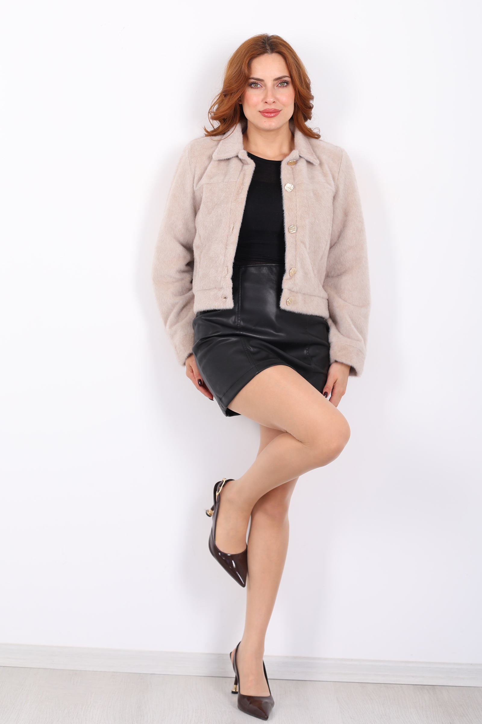 Gold Düğmeli Tay Tüyü Taş Rengi Kadın Ceket