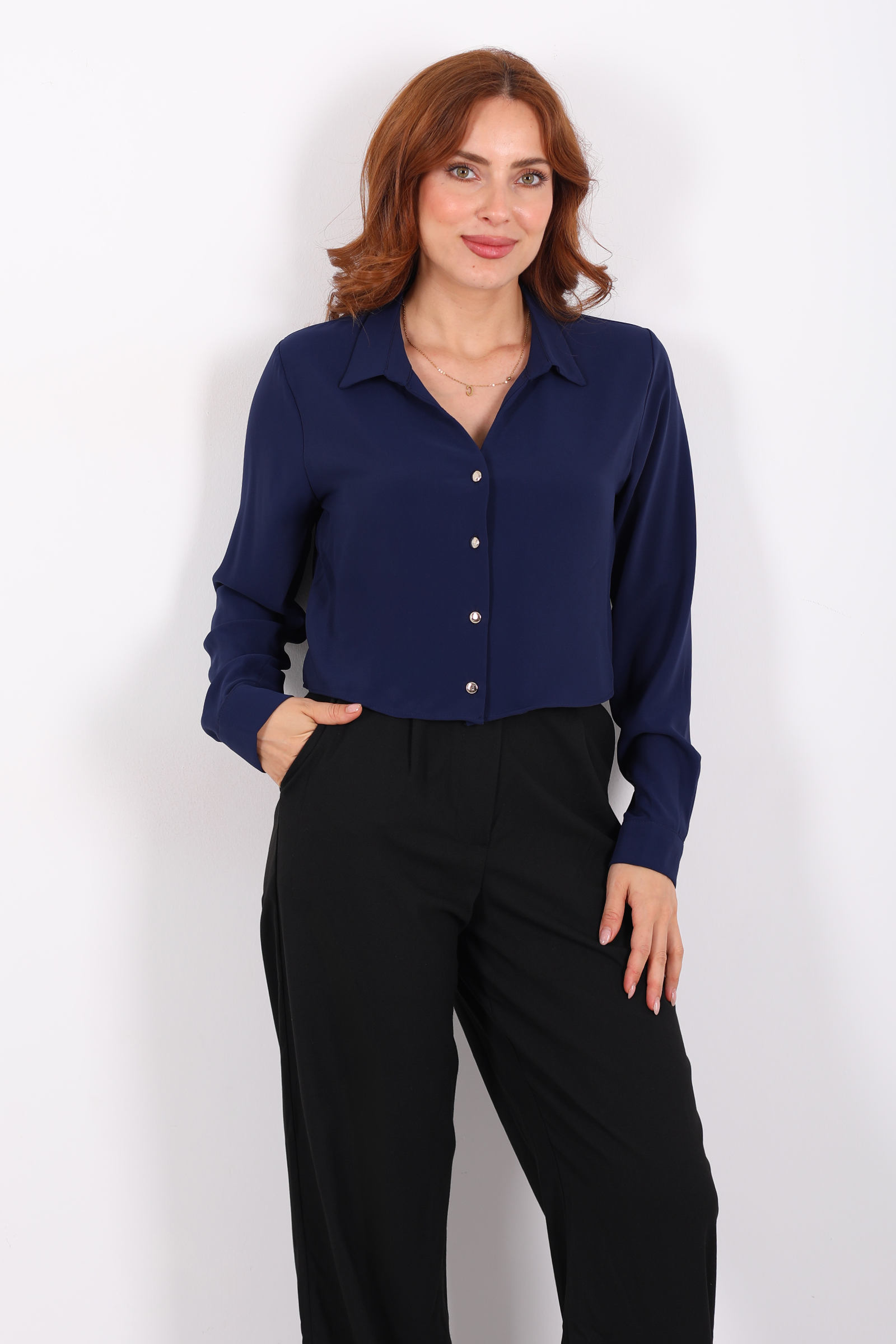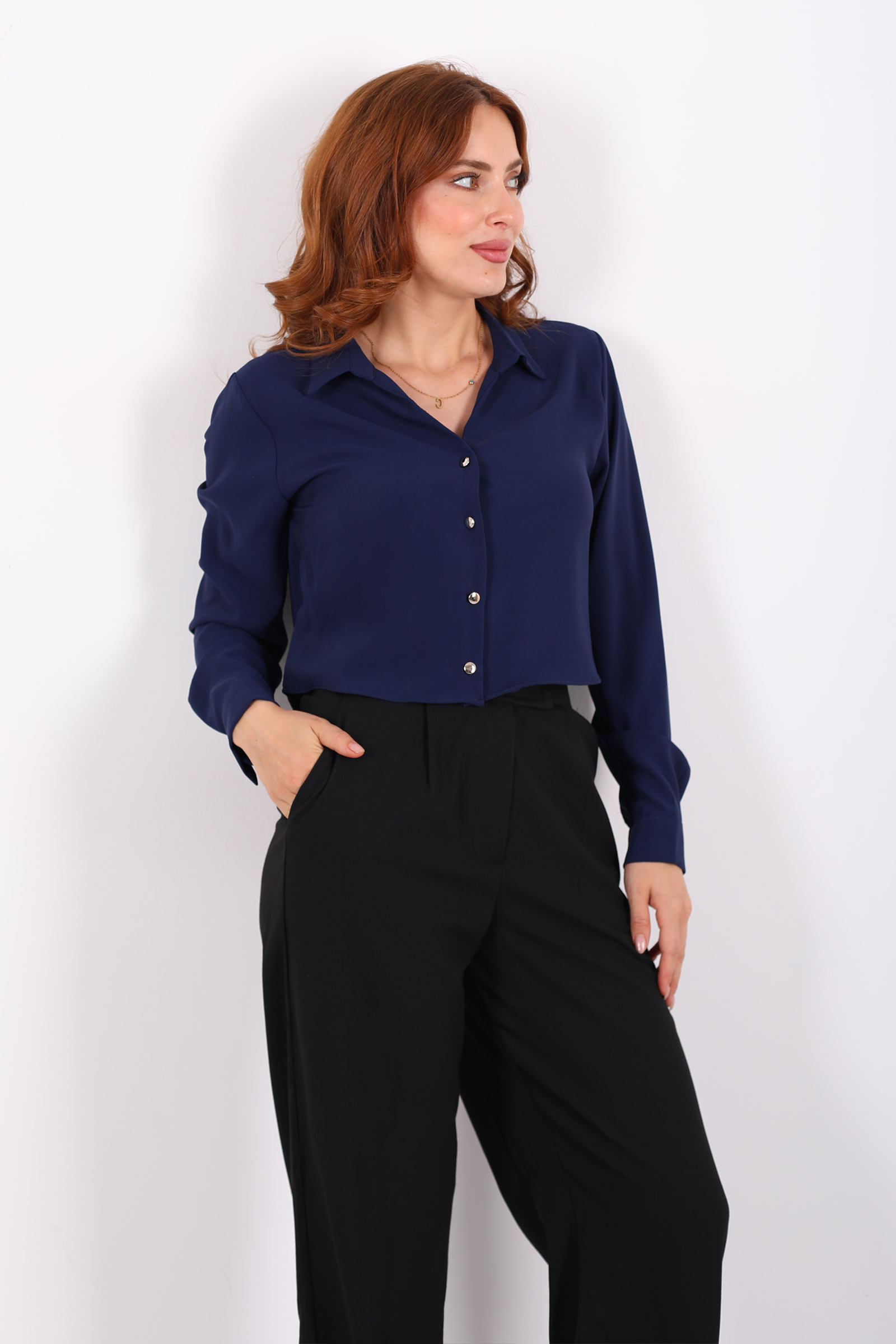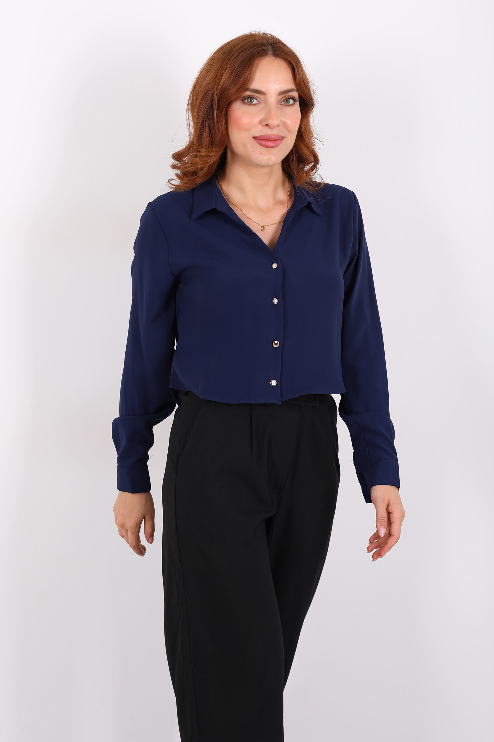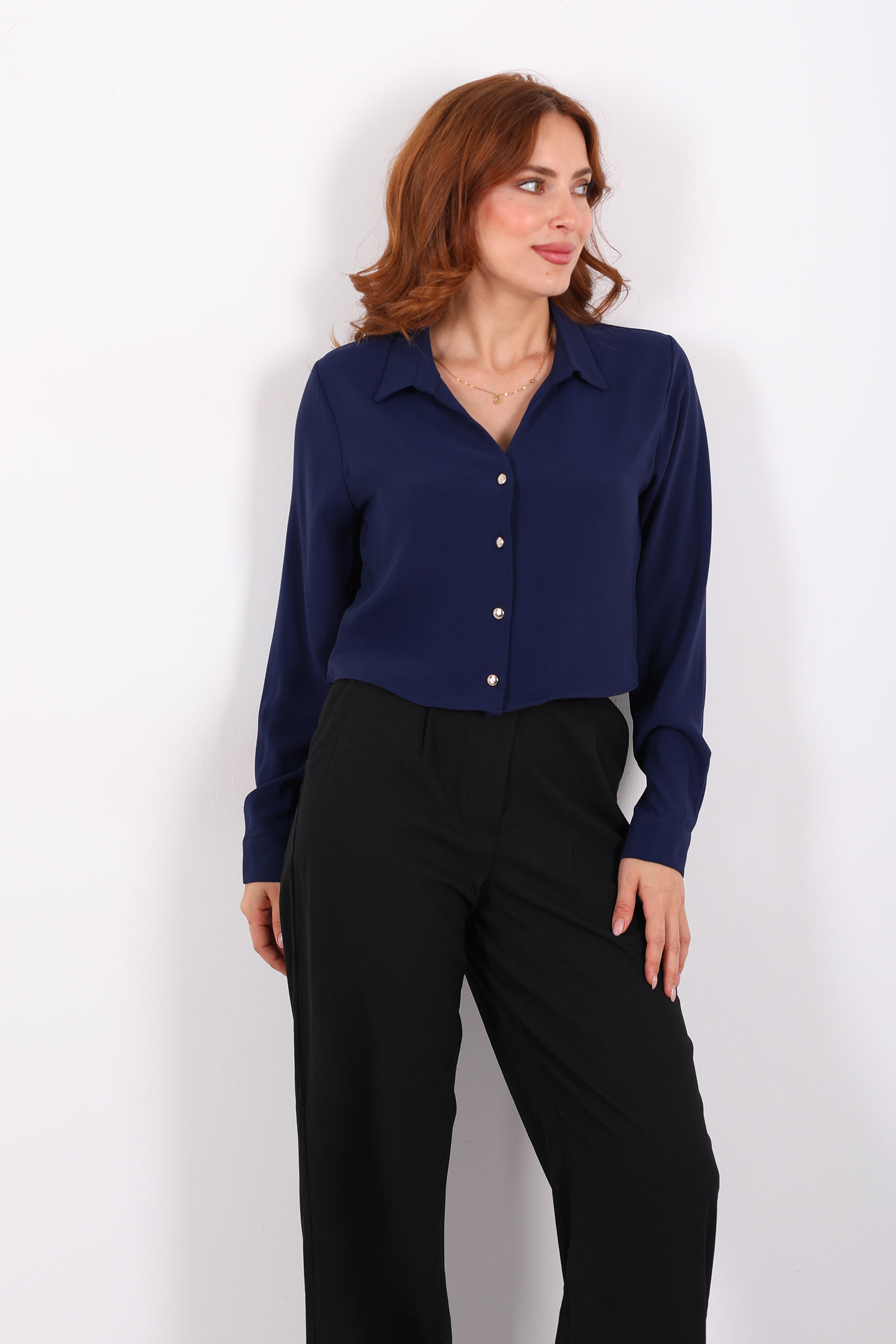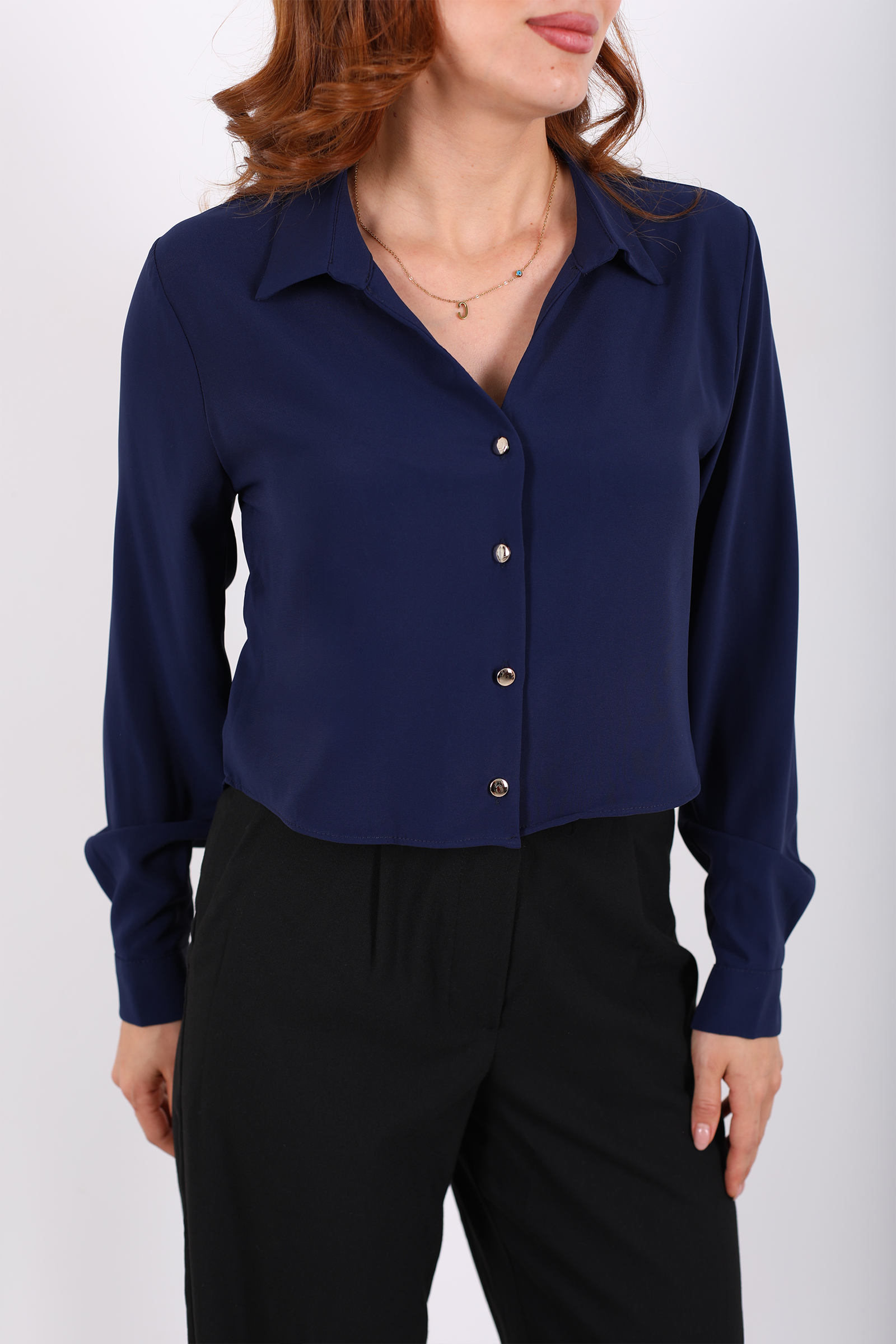Gold Düğmeli Viskon Lacivert Kadın Crop Gömlek