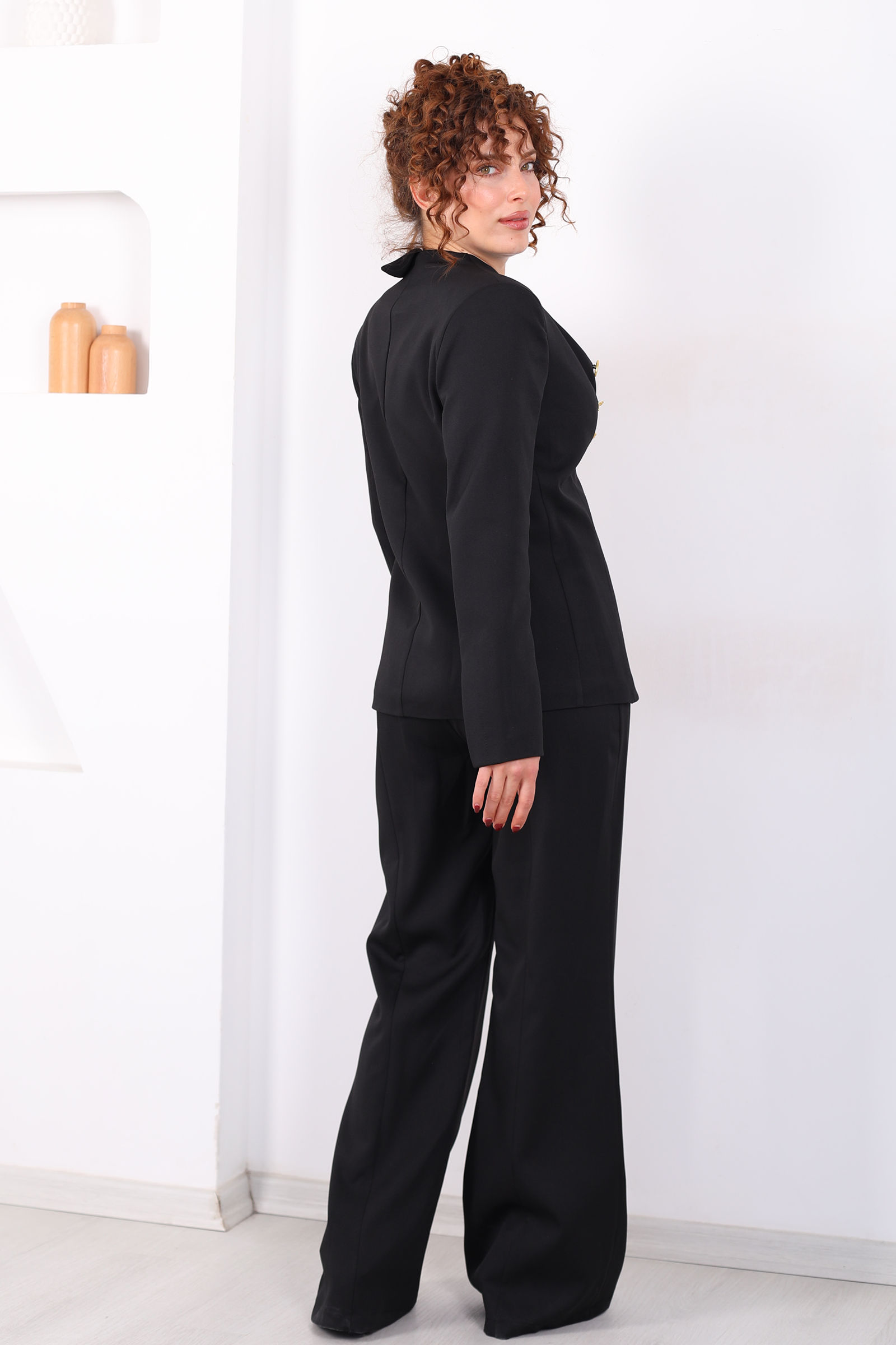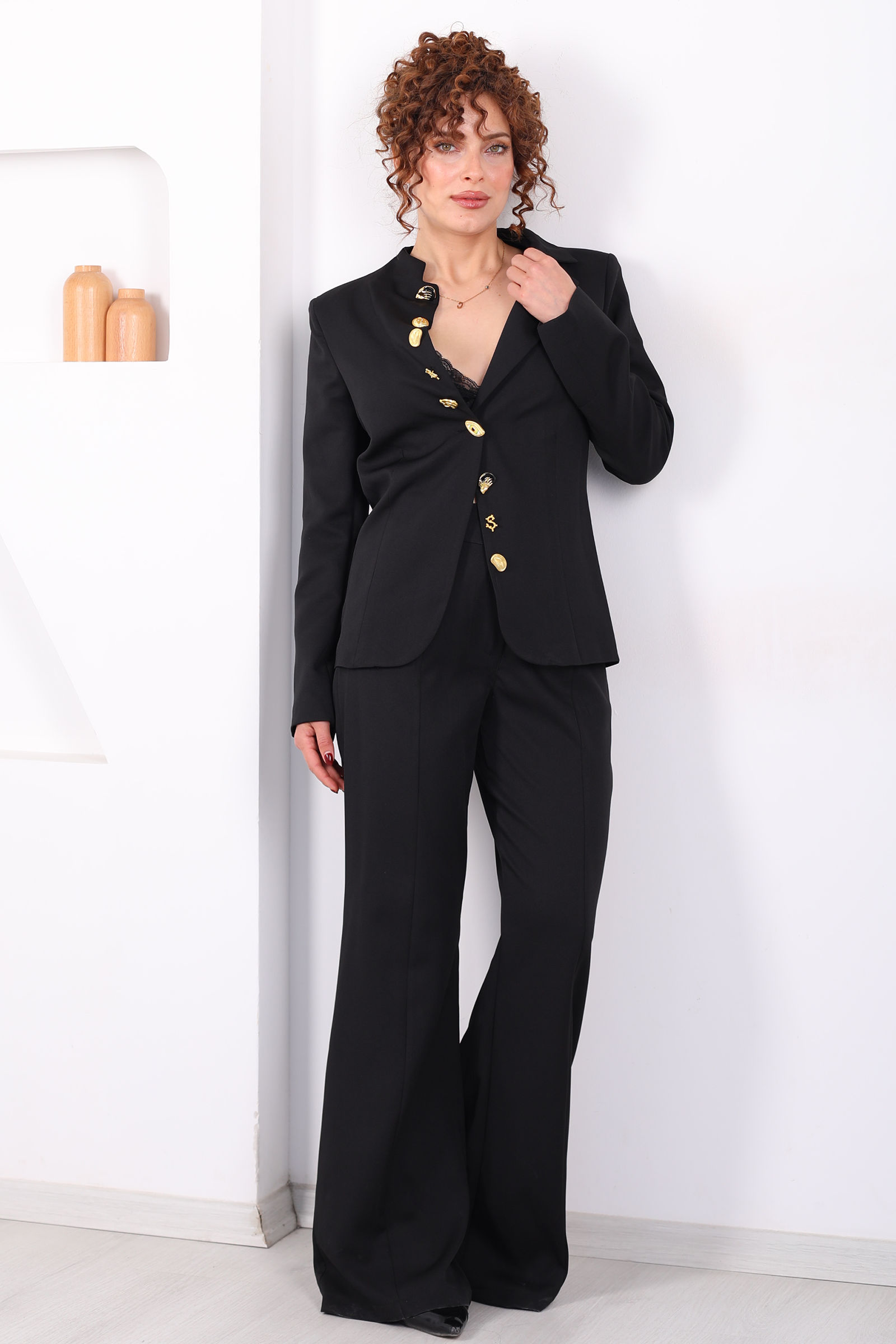 Gold Tasarım Düğme Detaylı Kadın Siyah Blazer Ceket Pantolon Takım