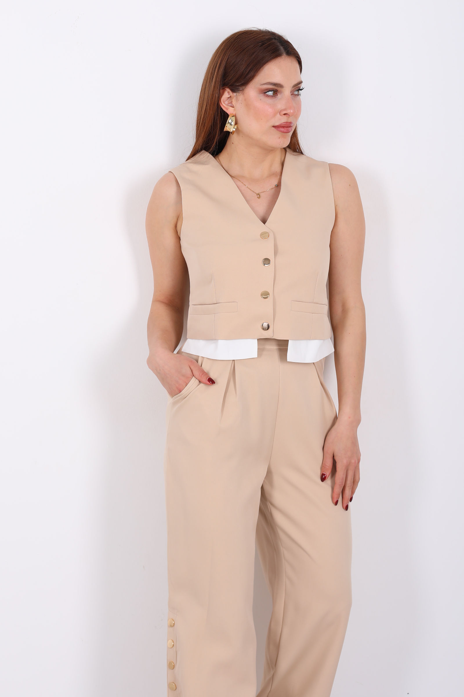 Gömlek Garnili Çıtçıtlı Kadın Bej Yelek Pantolon Takım
