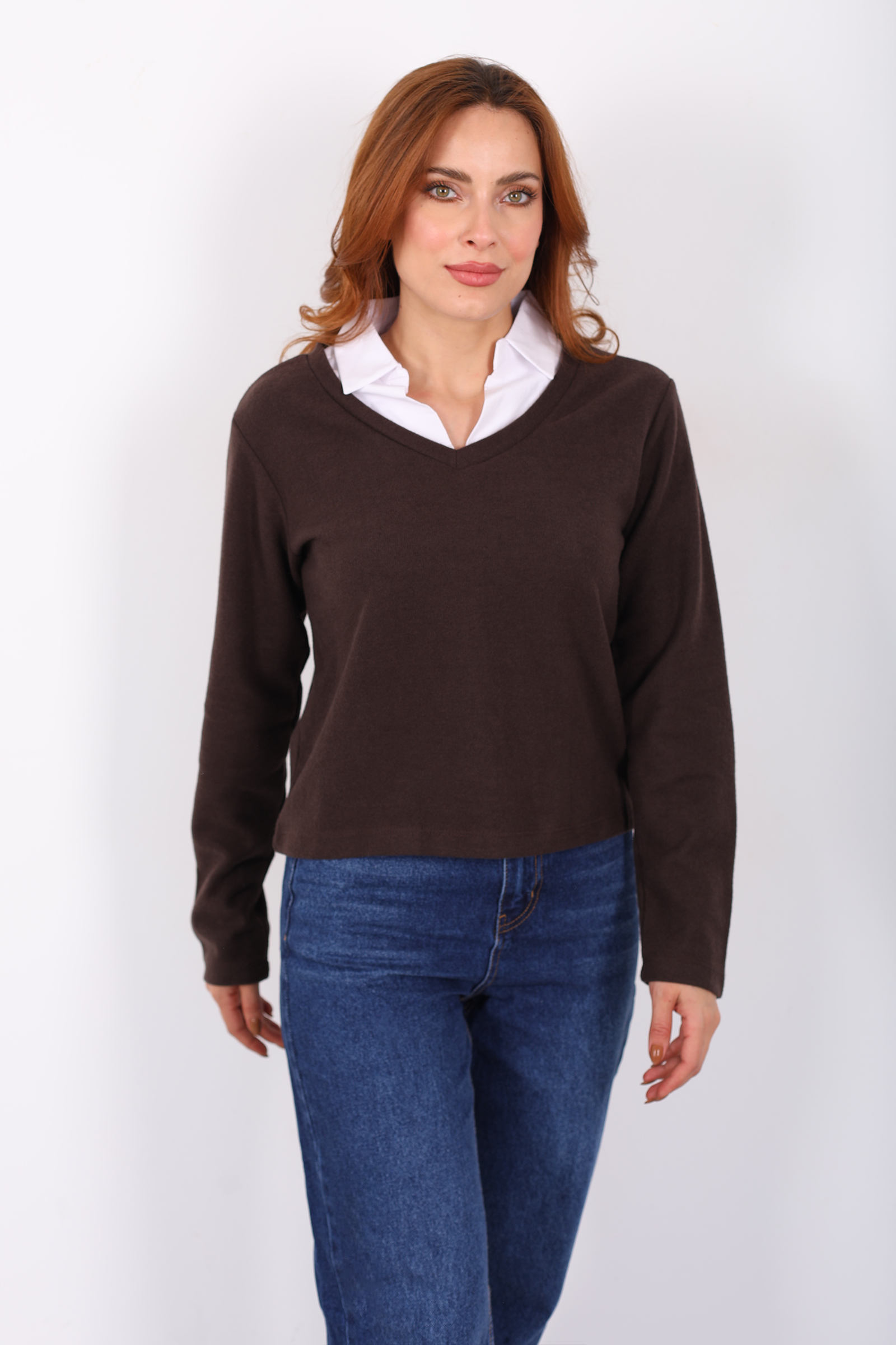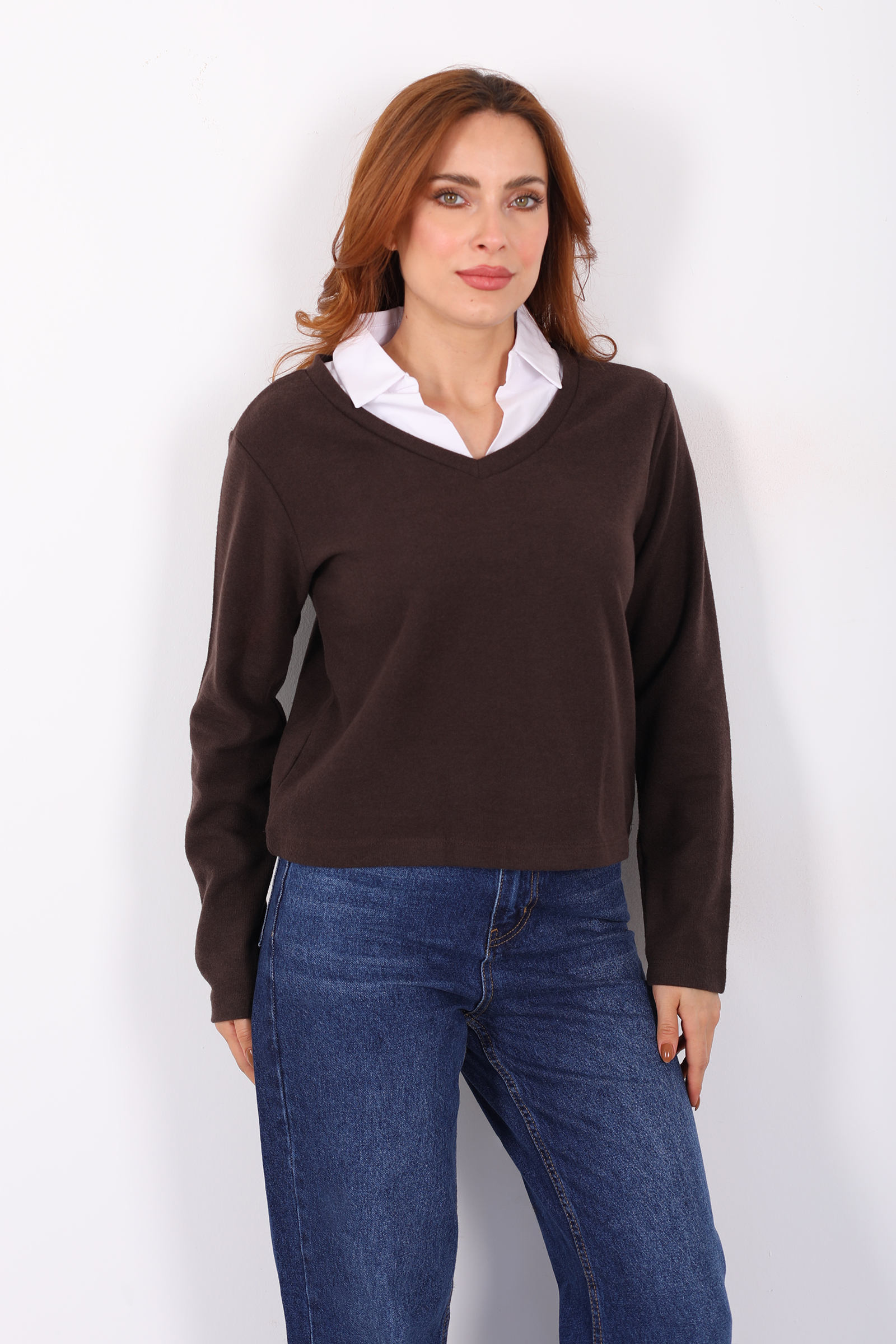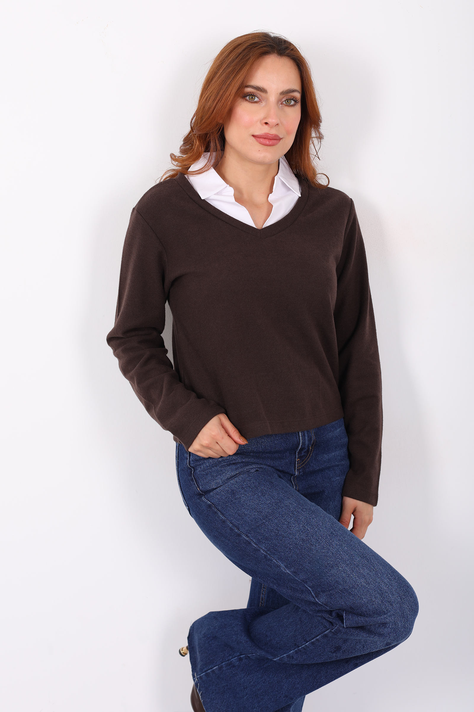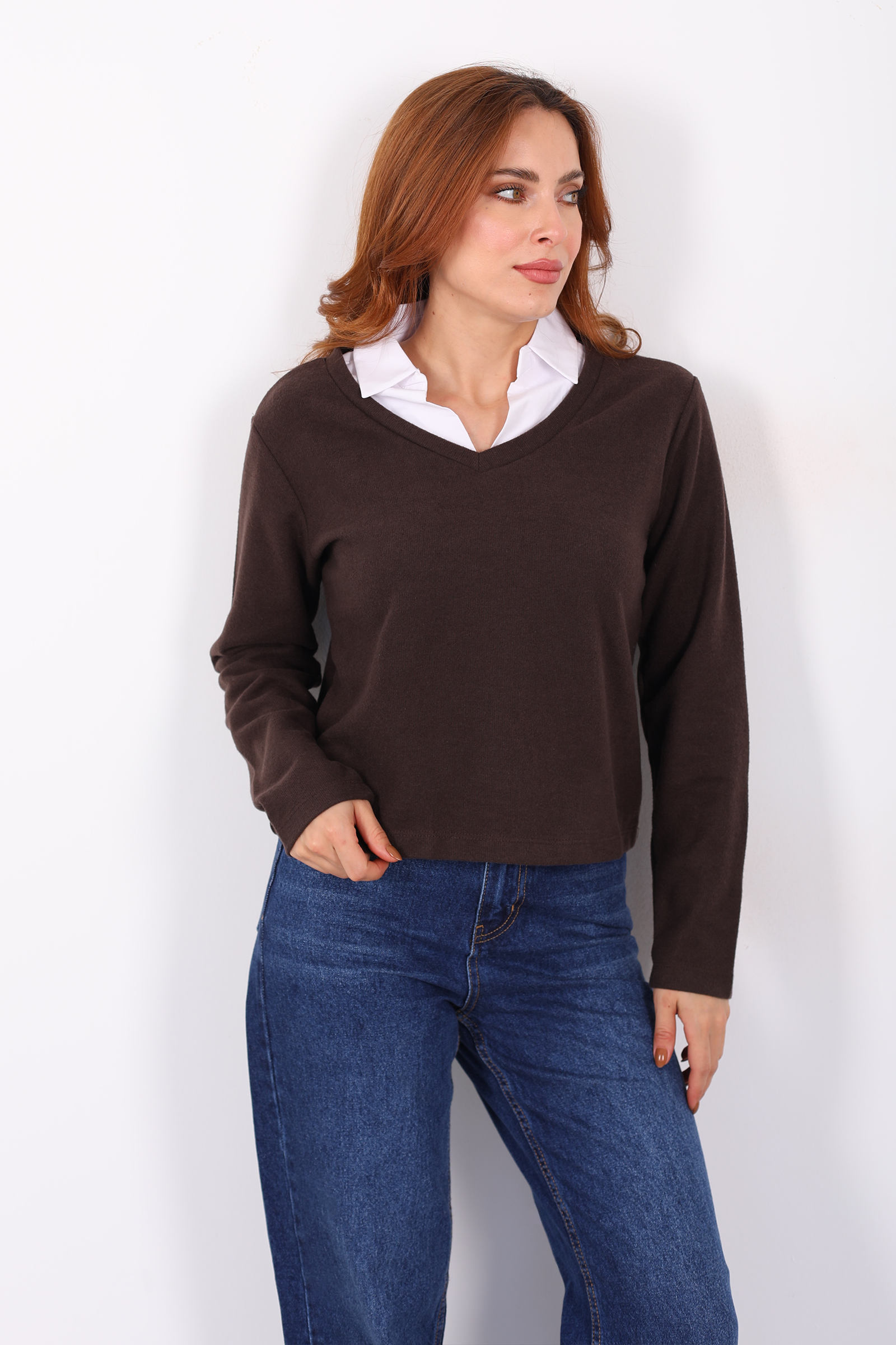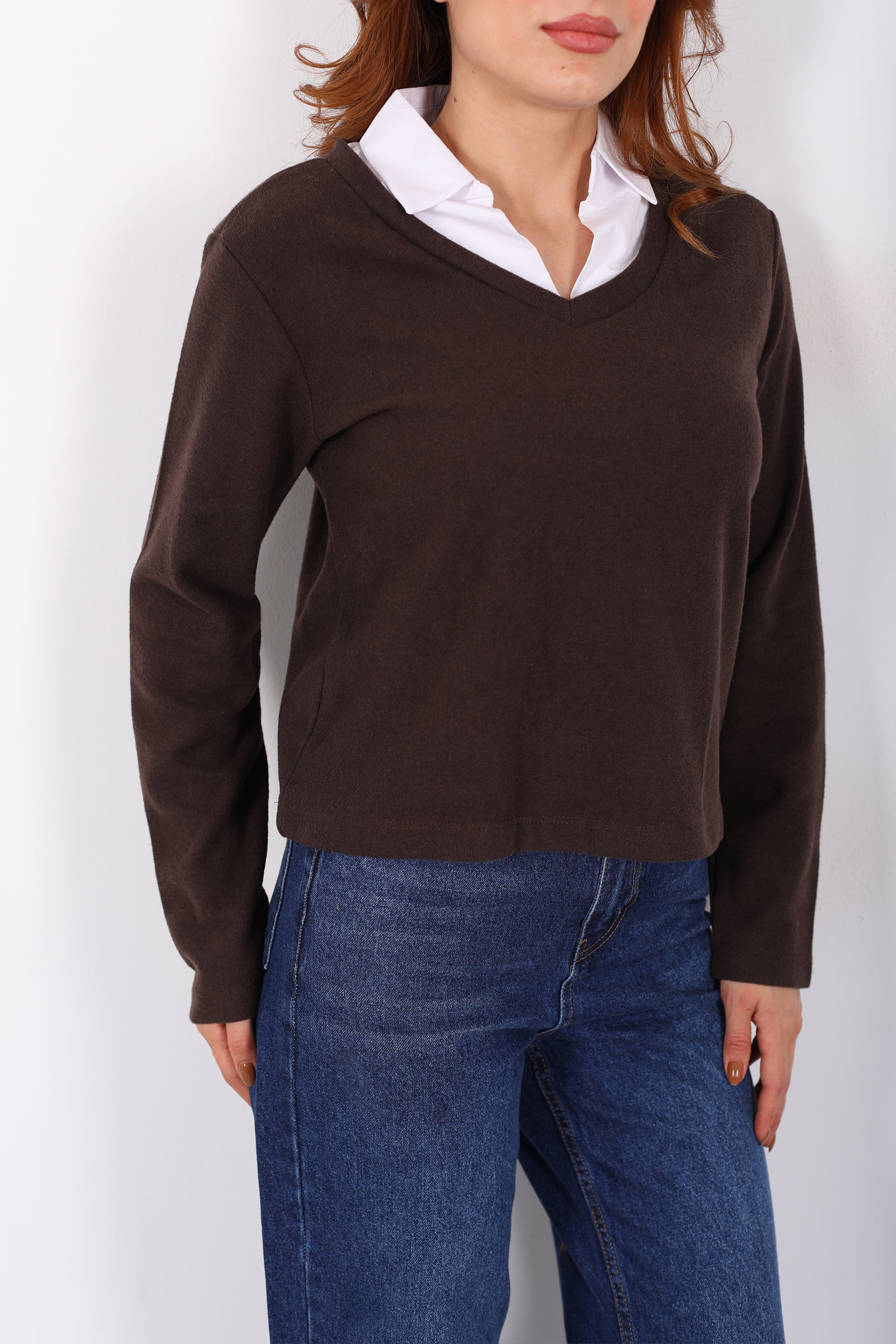 Gömlek Garnili Selanik Kadın Kahverengi Bluz