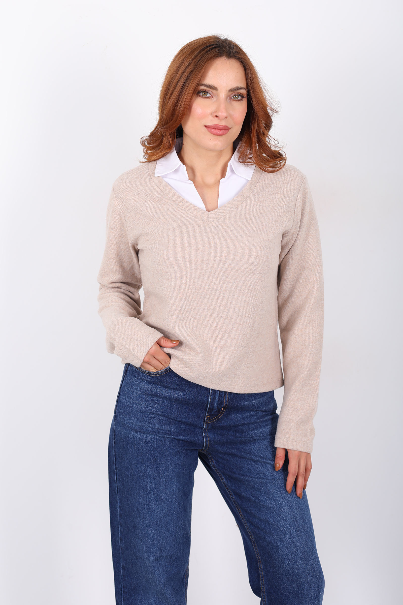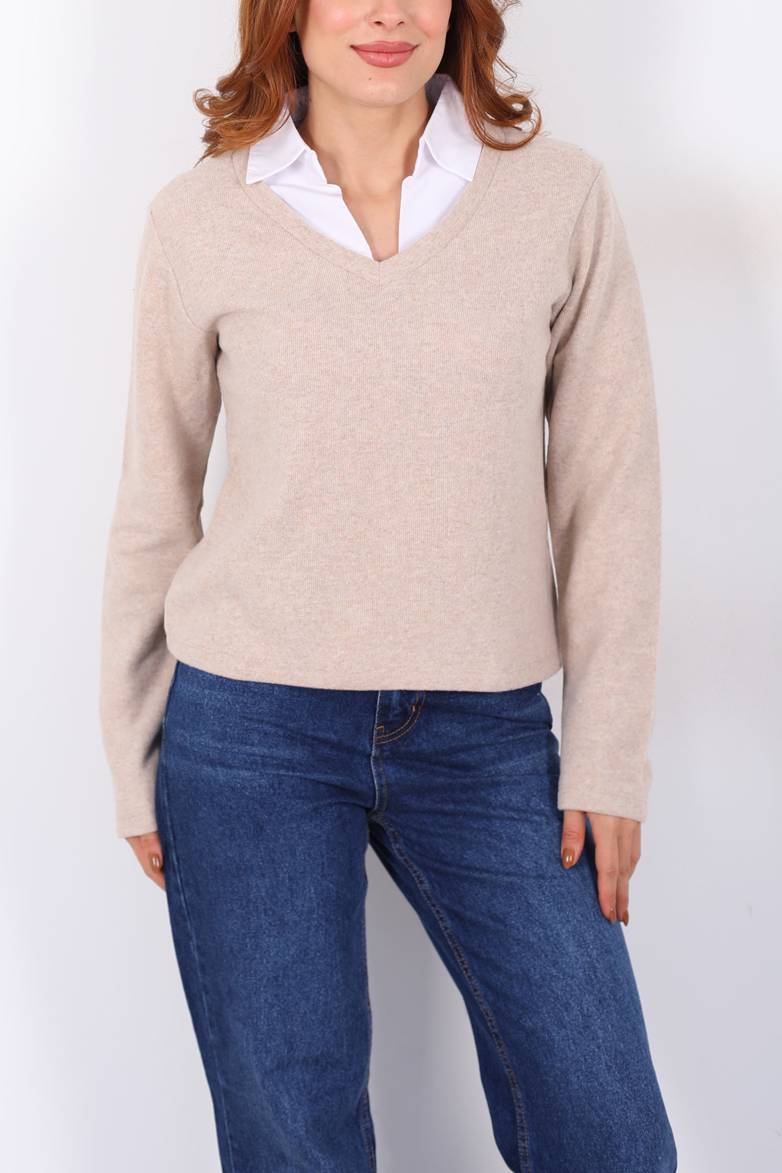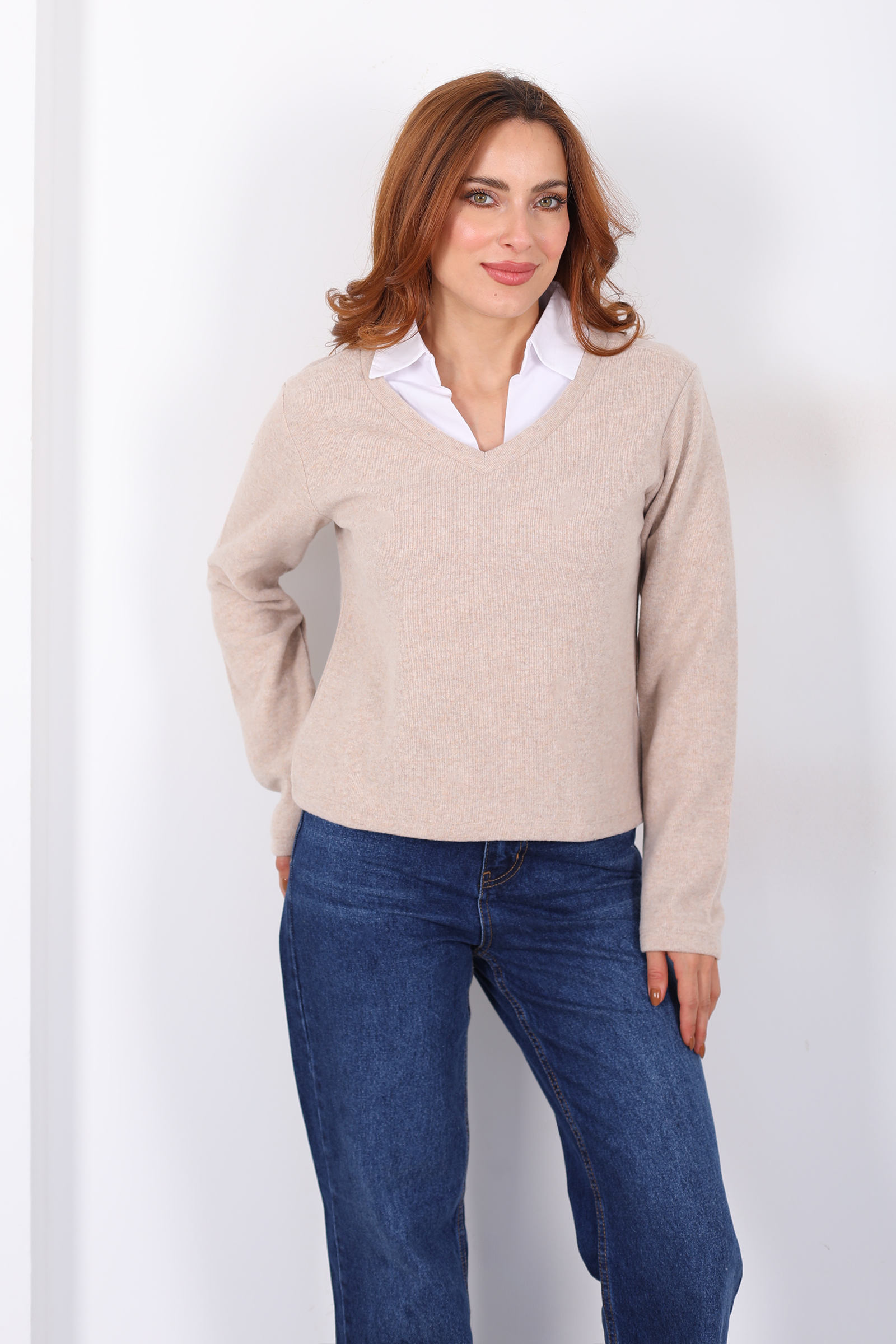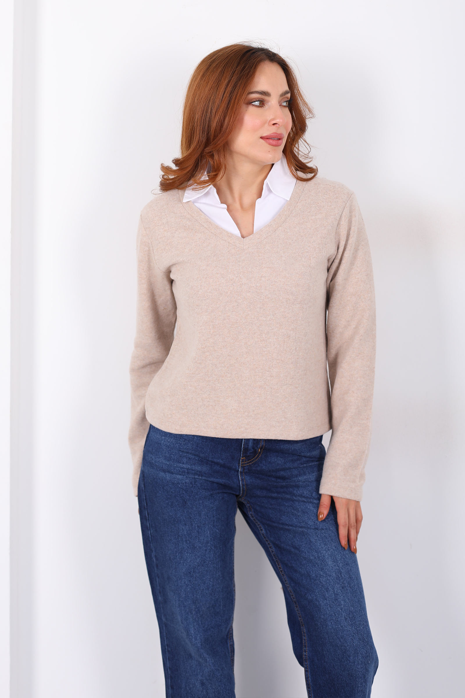 Gömlek Garnili Selanik Kadın Taş Rengi Bluz