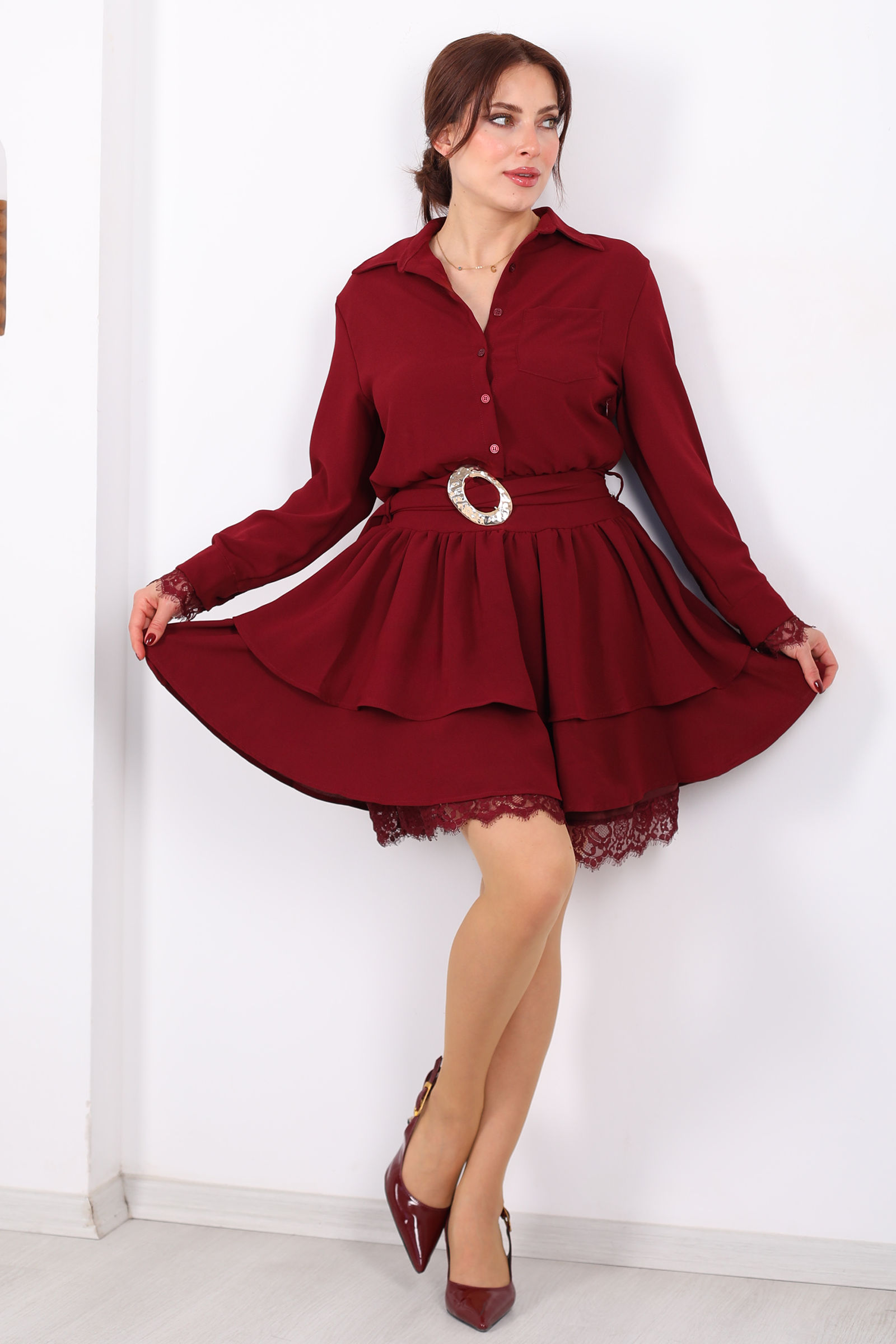 Gömlek Yaka Dantel Detaylı Katlı Bordo Kadın Mini Elbise