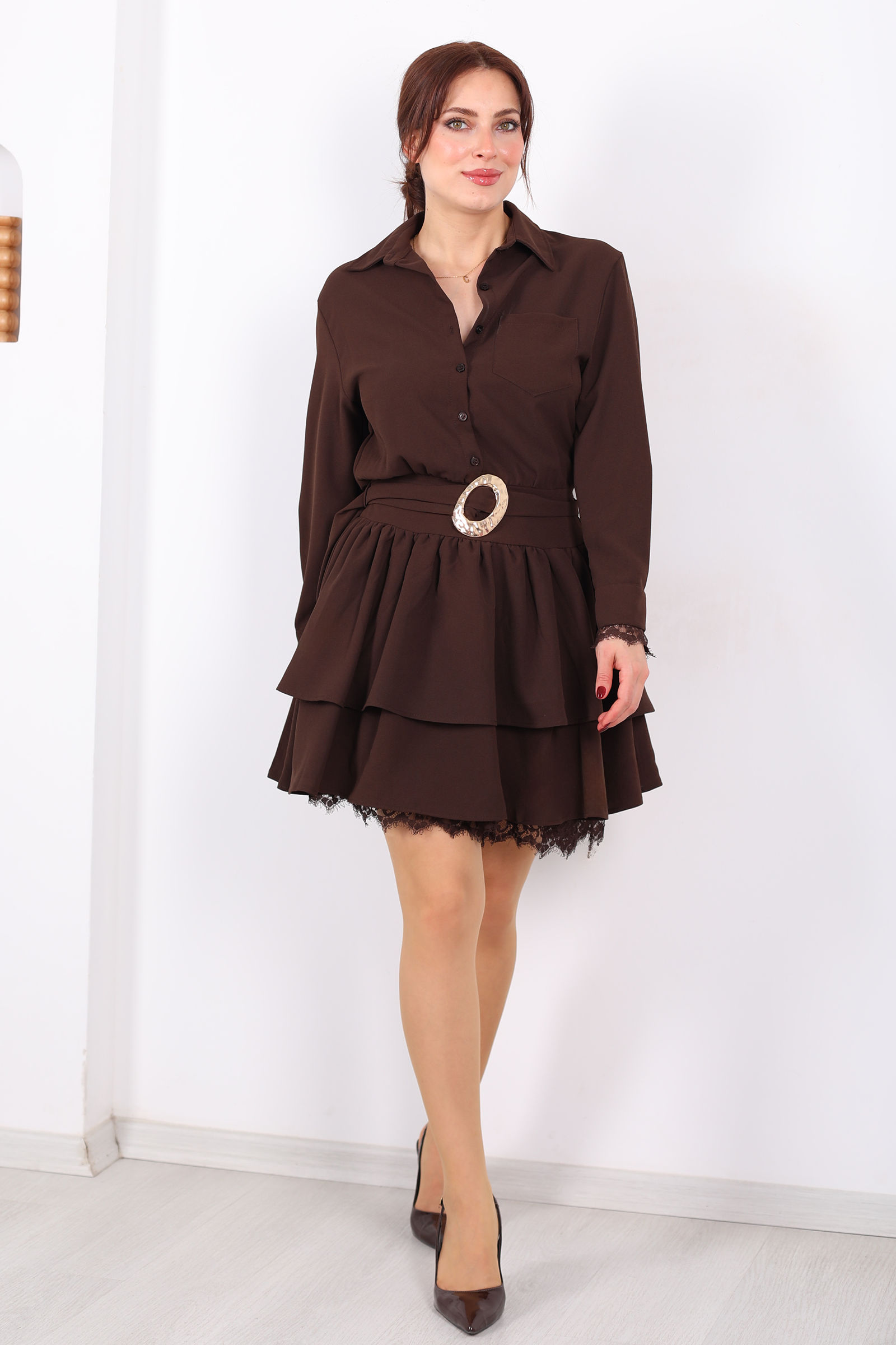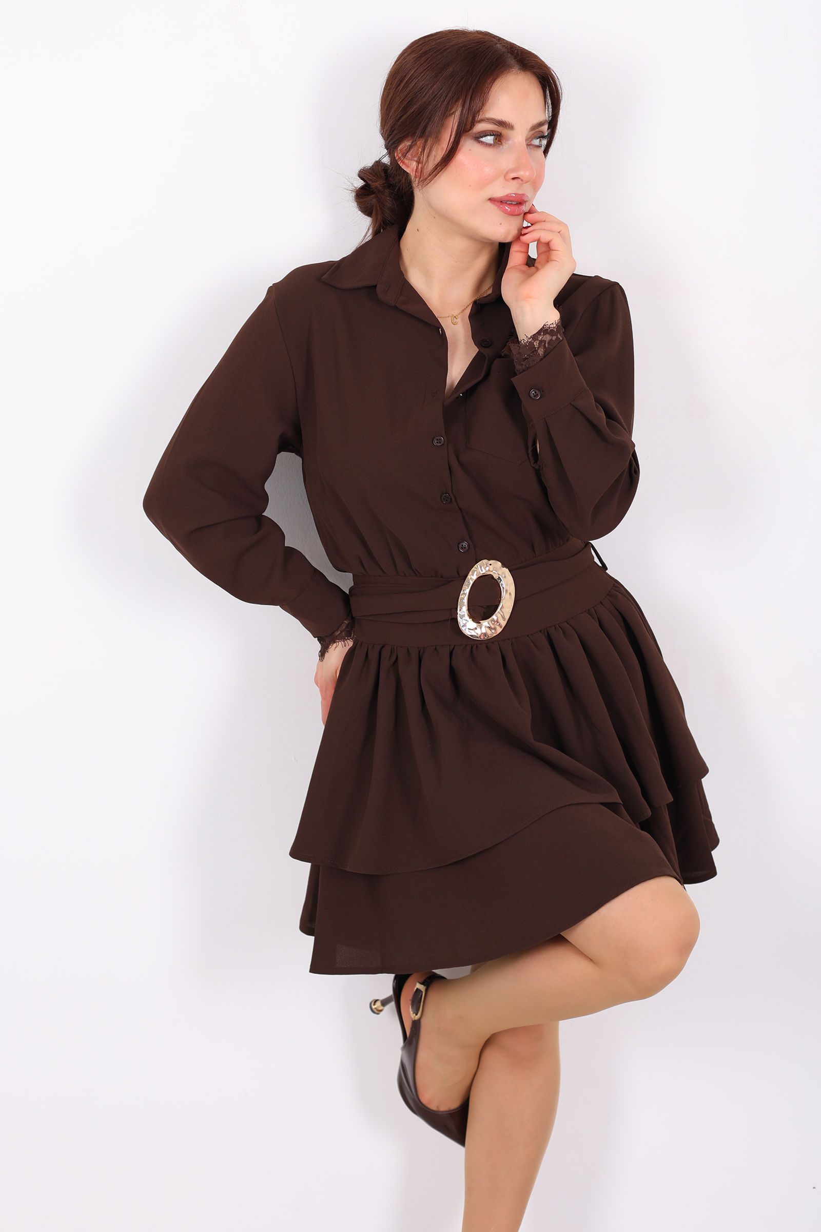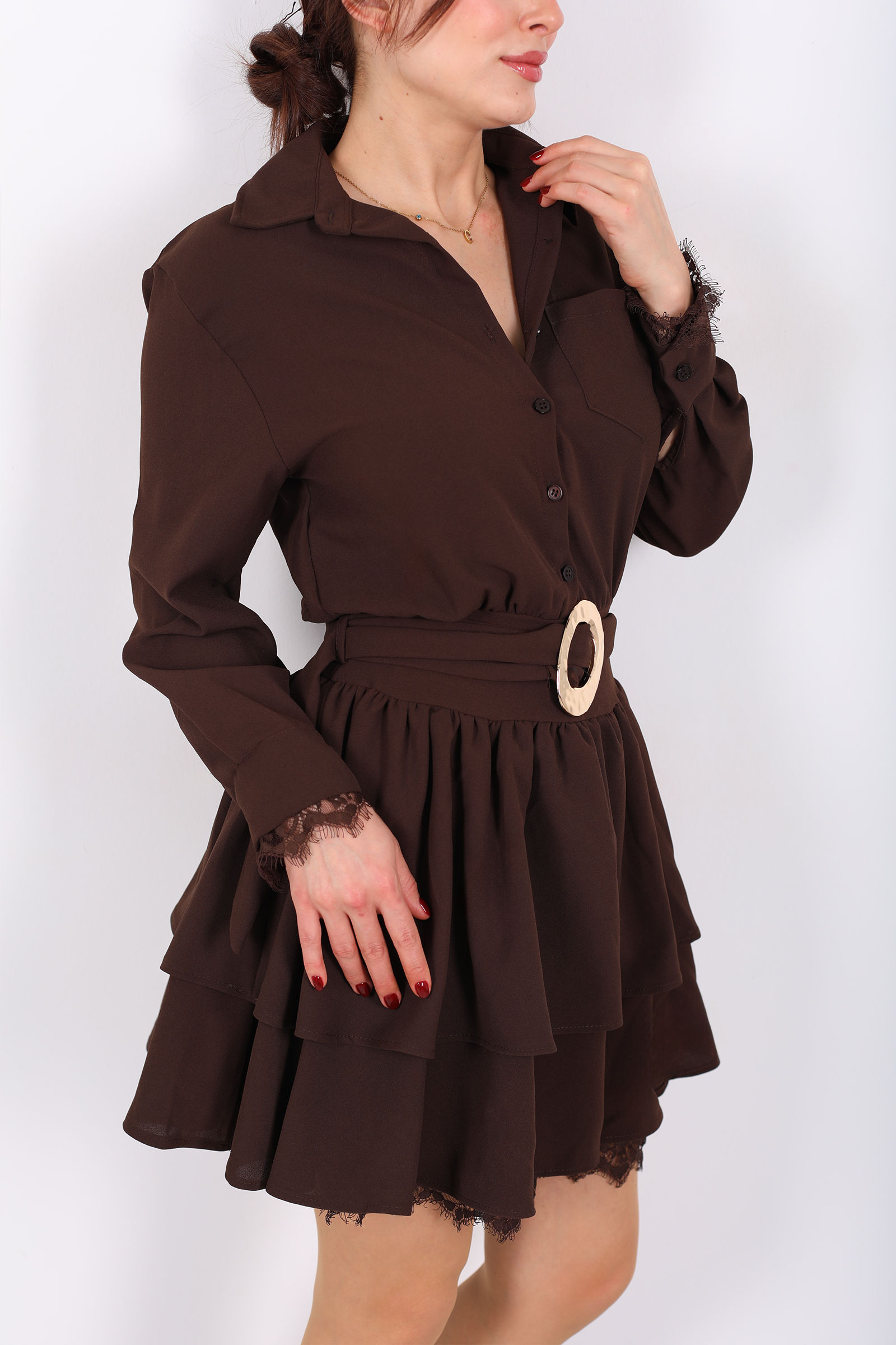 Gömlek Yaka Dantel Detaylı Katlı Kahverengi Kadın Mini Elbise