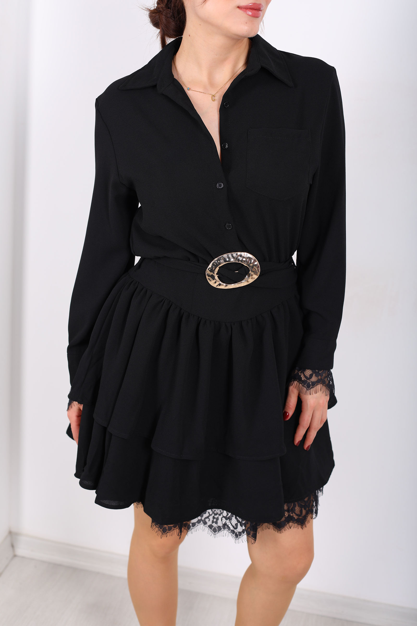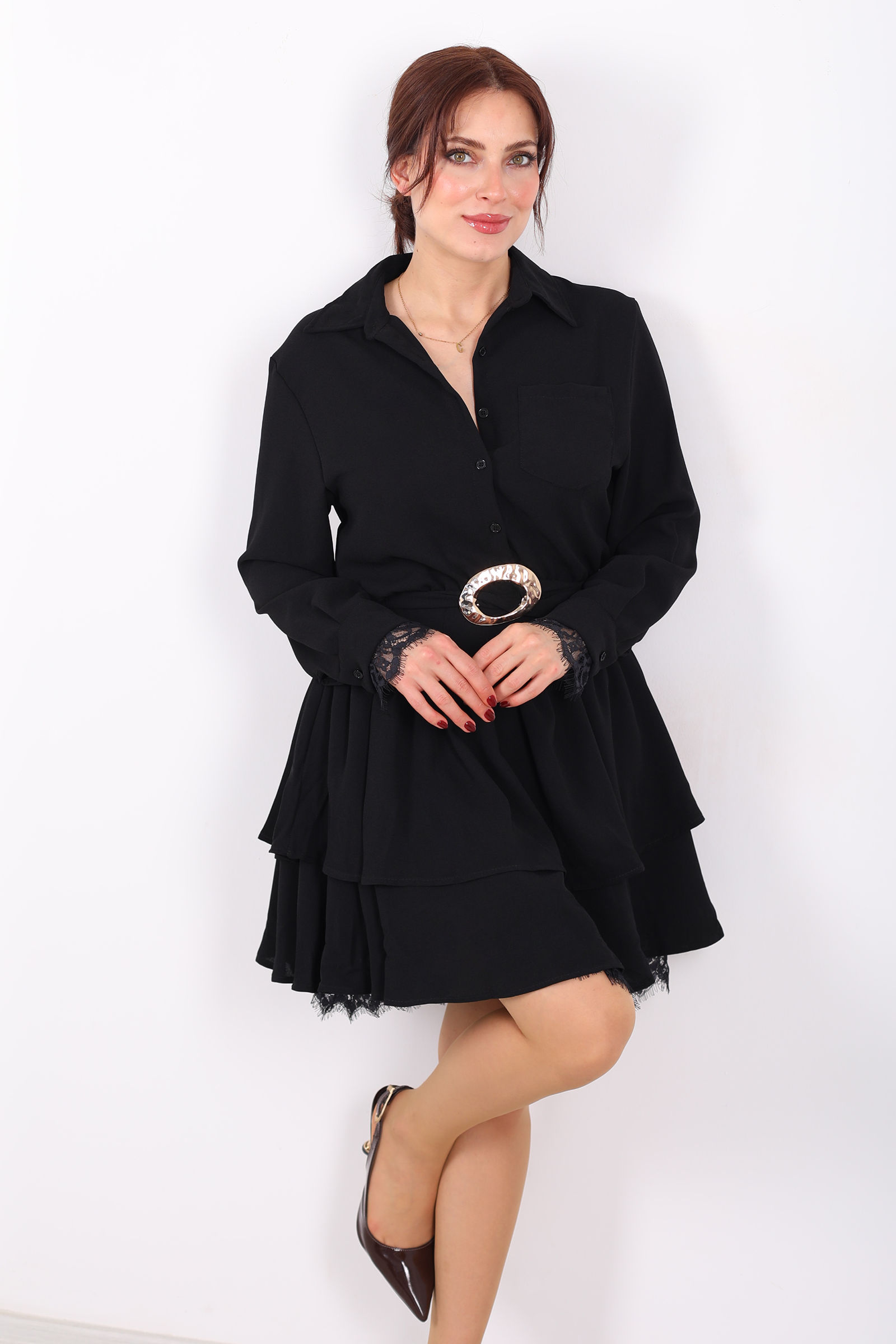 Gömlek Yaka Dantel Detaylı Katlı Siyah Kadın Mini Elbise