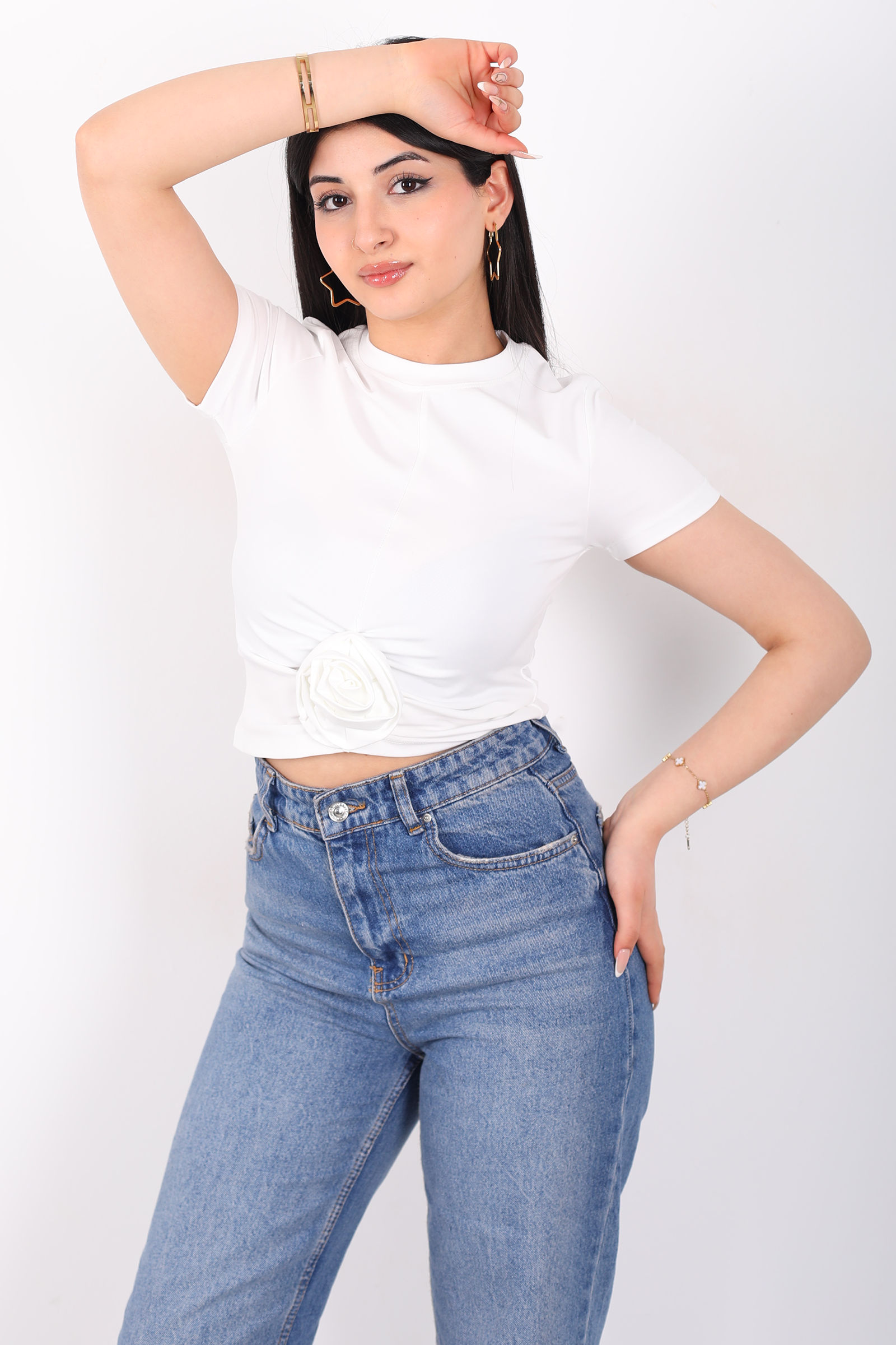 Gül Detaylı Kısa Kol Sandy Beyaz Kadın Crop Bluz