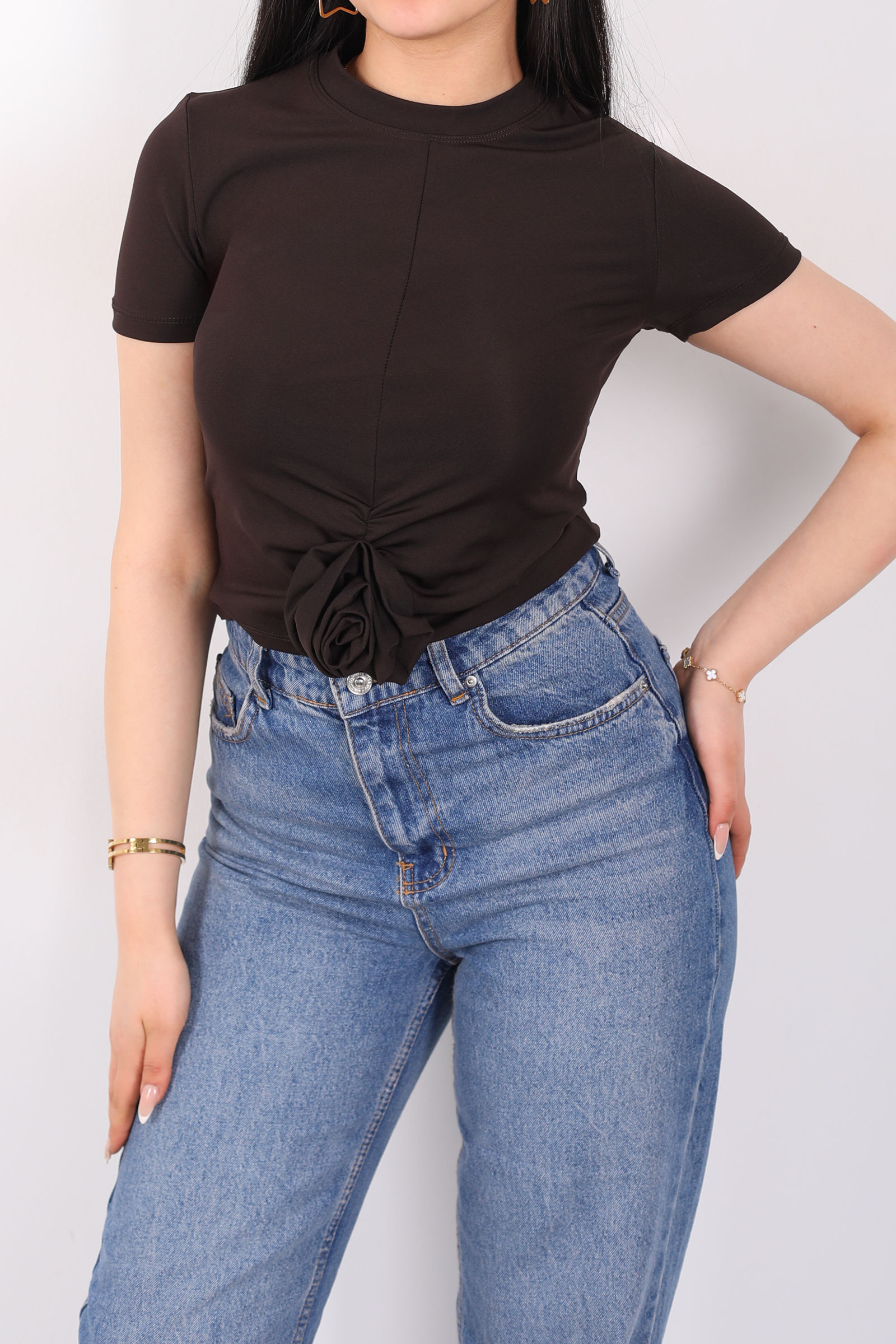 Gül Detaylı Kısa Kol Sandy Kahverengi Kadın Crop Bluz
