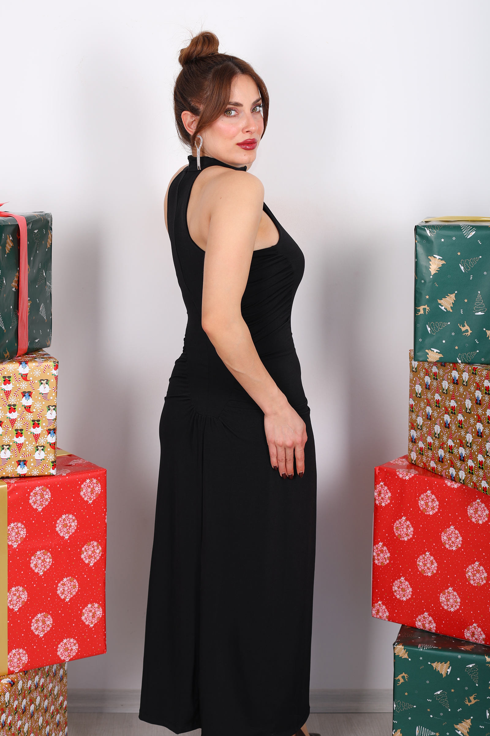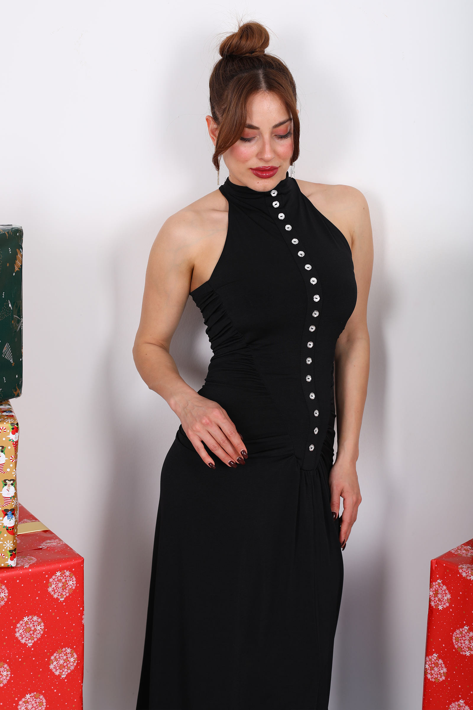 Siyahın vazgeçilmez cazibesini modern detaylarla harmanlayan bu kolsuz elbise, sade çizgilerin ötesine geçen bir duruş sunuyor. Halter yakası boyun hattına net bir çerçeve çizerken, ön düğme detayı tasarımda ince ama dikkat çekici bir ritim oluşturuyor. Vücutla nazikçe uyum sağlayan kesimi, hareket ettiğiniz her anda akıcı bir siluet sunar. Günlük ritimden akşam buluşmalarına kadar geniş bir stil skalasında yer alabilen bu parça, minimalist ama güçlü bir ifade ile fark yaratır.