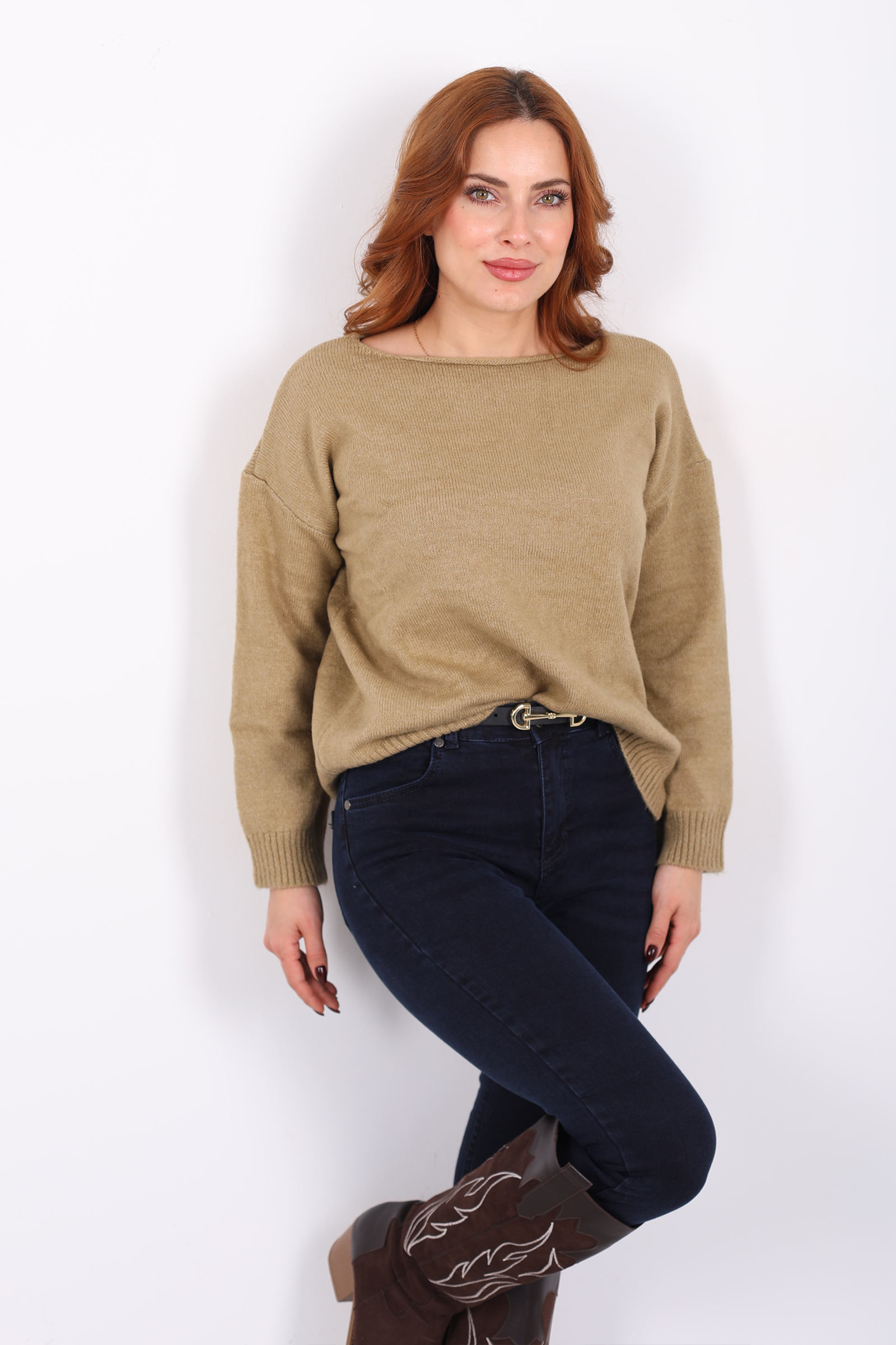Dik Yaka Dikiş Detaylı Krem Kadın Triko Kazak