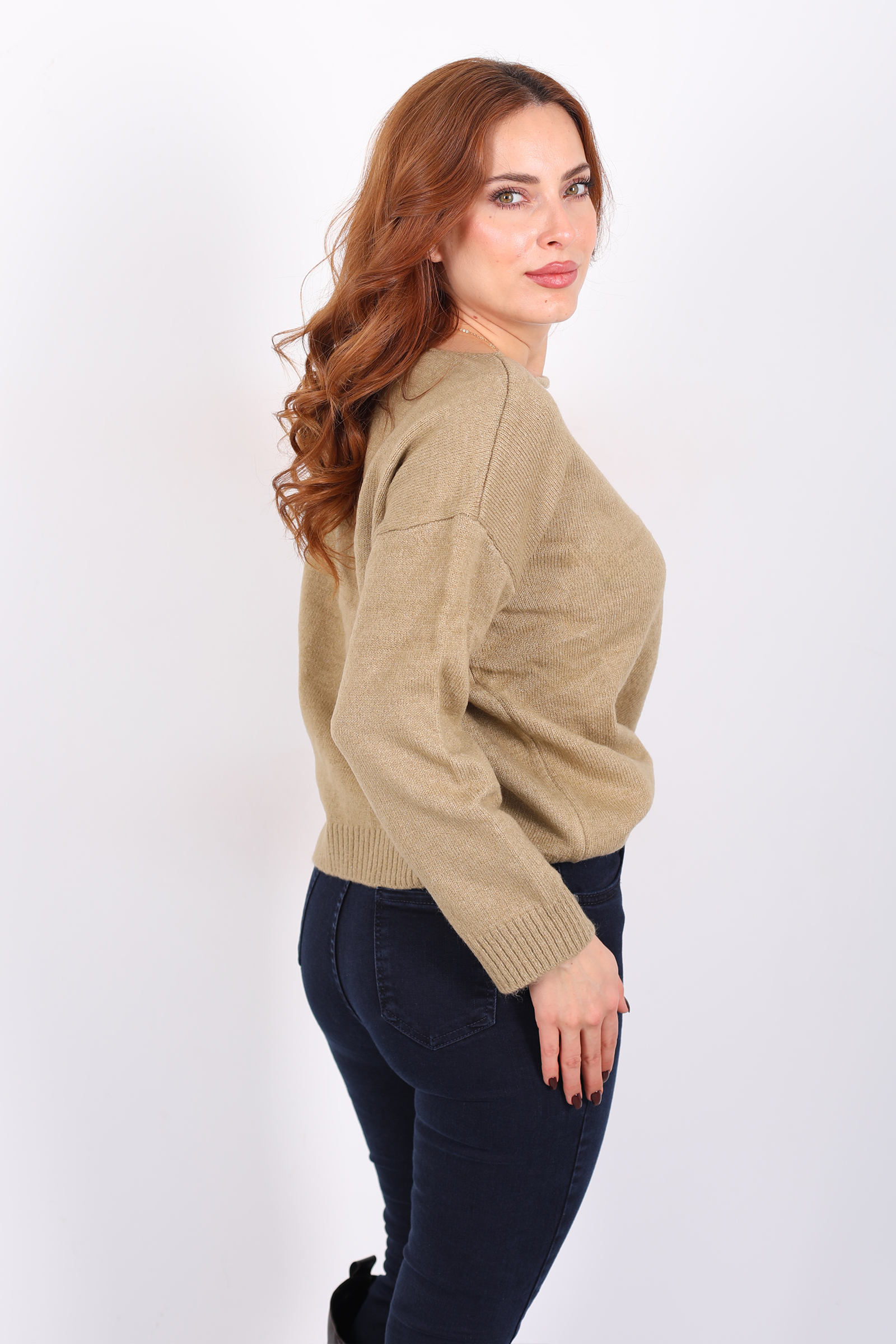 V Yaka Vatkalı Ekru Kadın Triko Crop