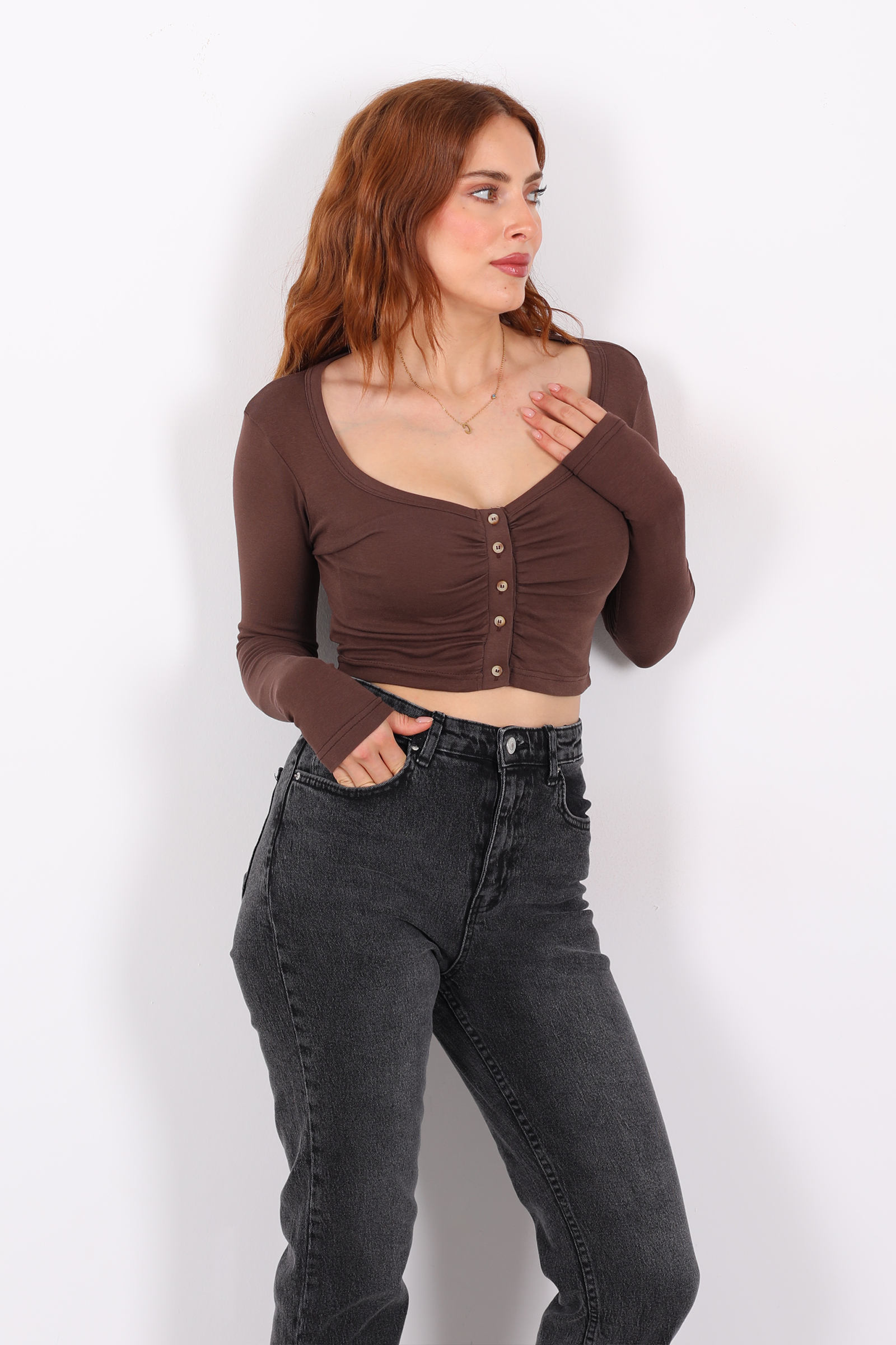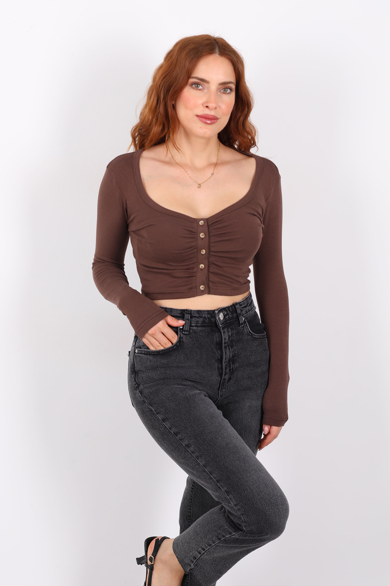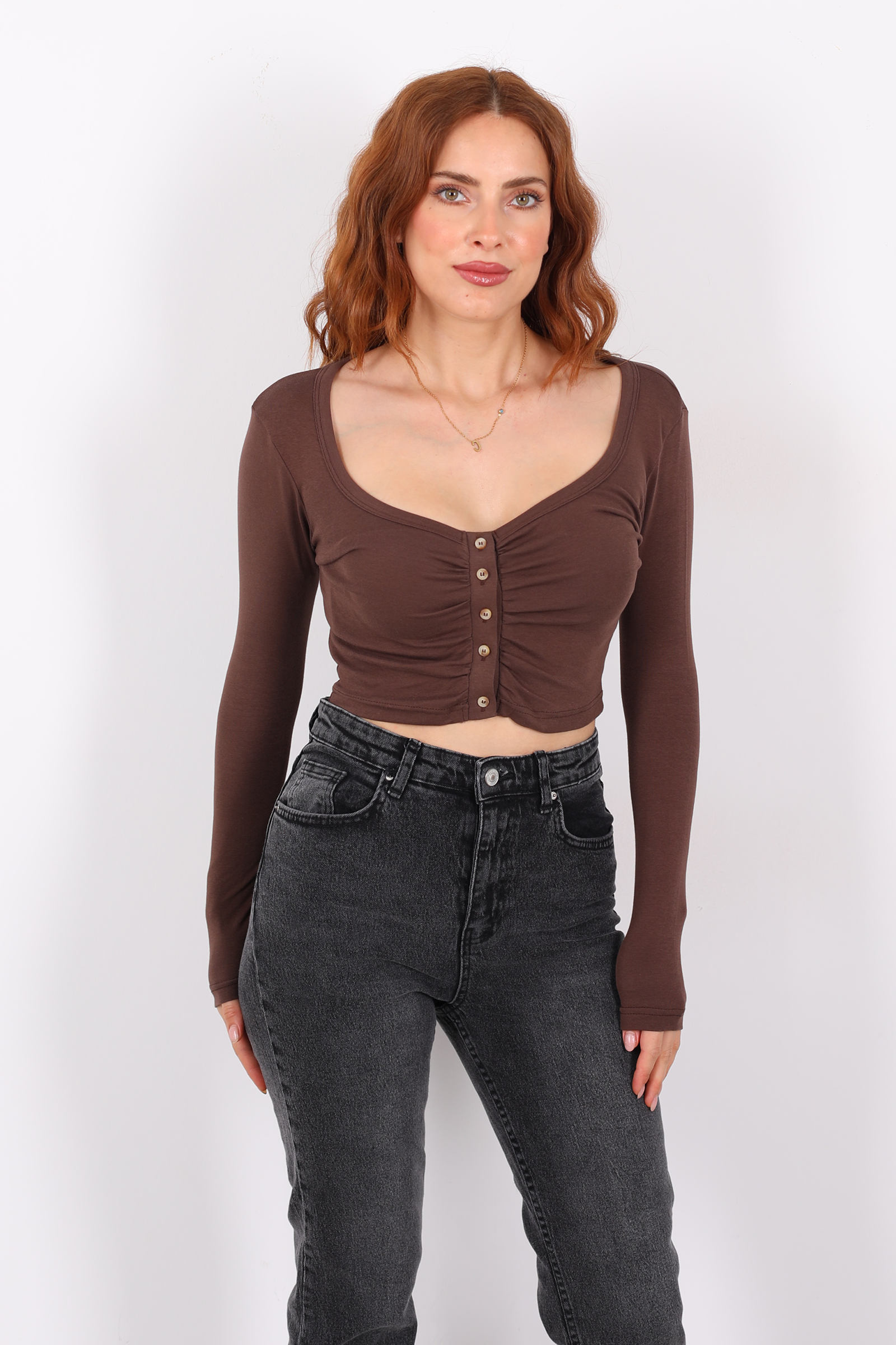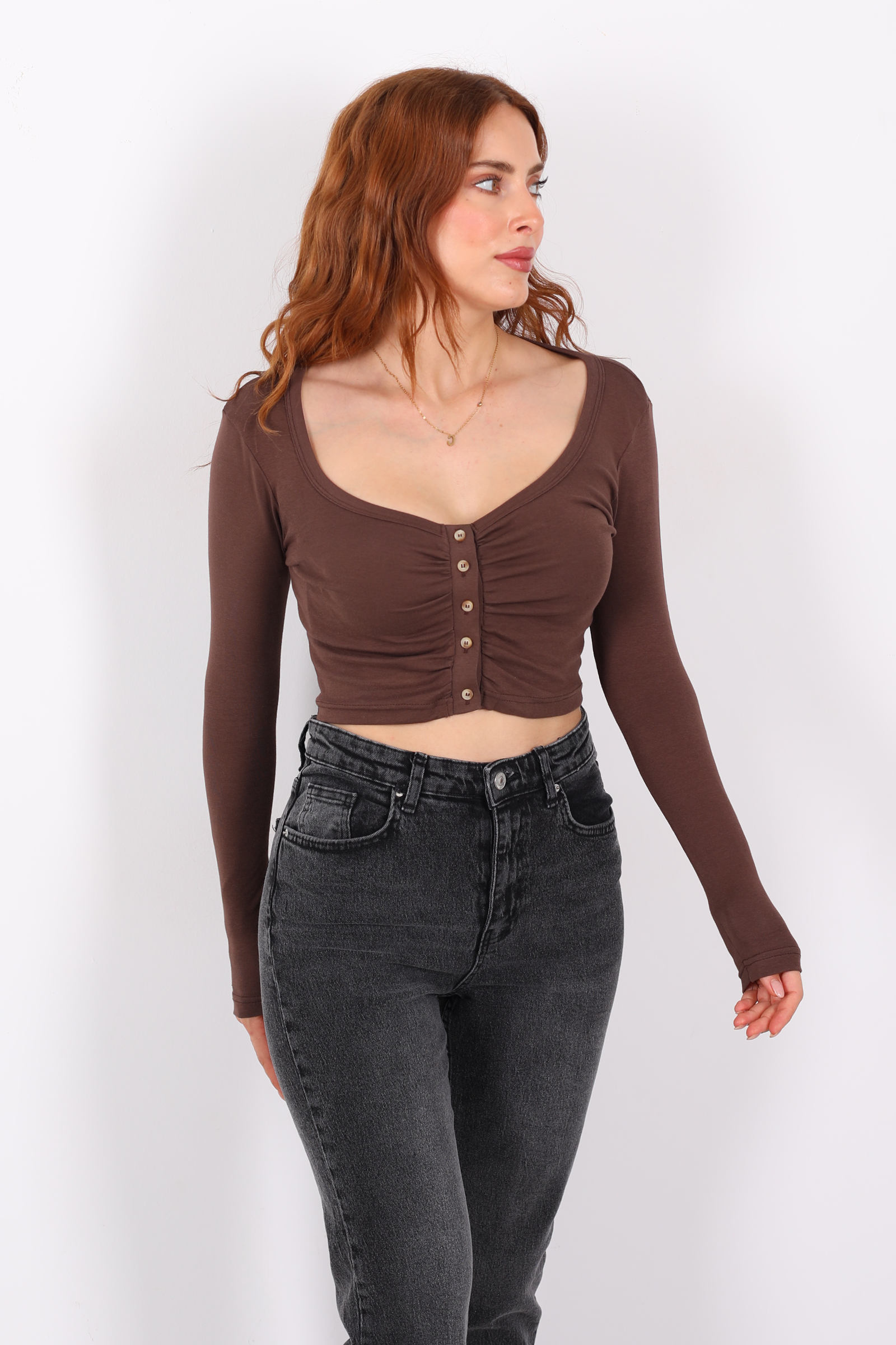 Doğal toprak tonlarının sıcaklığını stilinize yansıtan bu kahverengi düğmeli bluz, havuz yakasıyla zarafet ve konforu buluşturuyor. Her mevsime uyum sağlayacak otantik bir parça.Hafif ve nefes alabilen bir kumaştan üretilmiş; vücuda yumuşakça oturur ve gün boyu rahatlık sağlar.Hem ofis hem gündelik kombinlerde kullanılabilecek çok yönlü bir üst parça arayanlara.