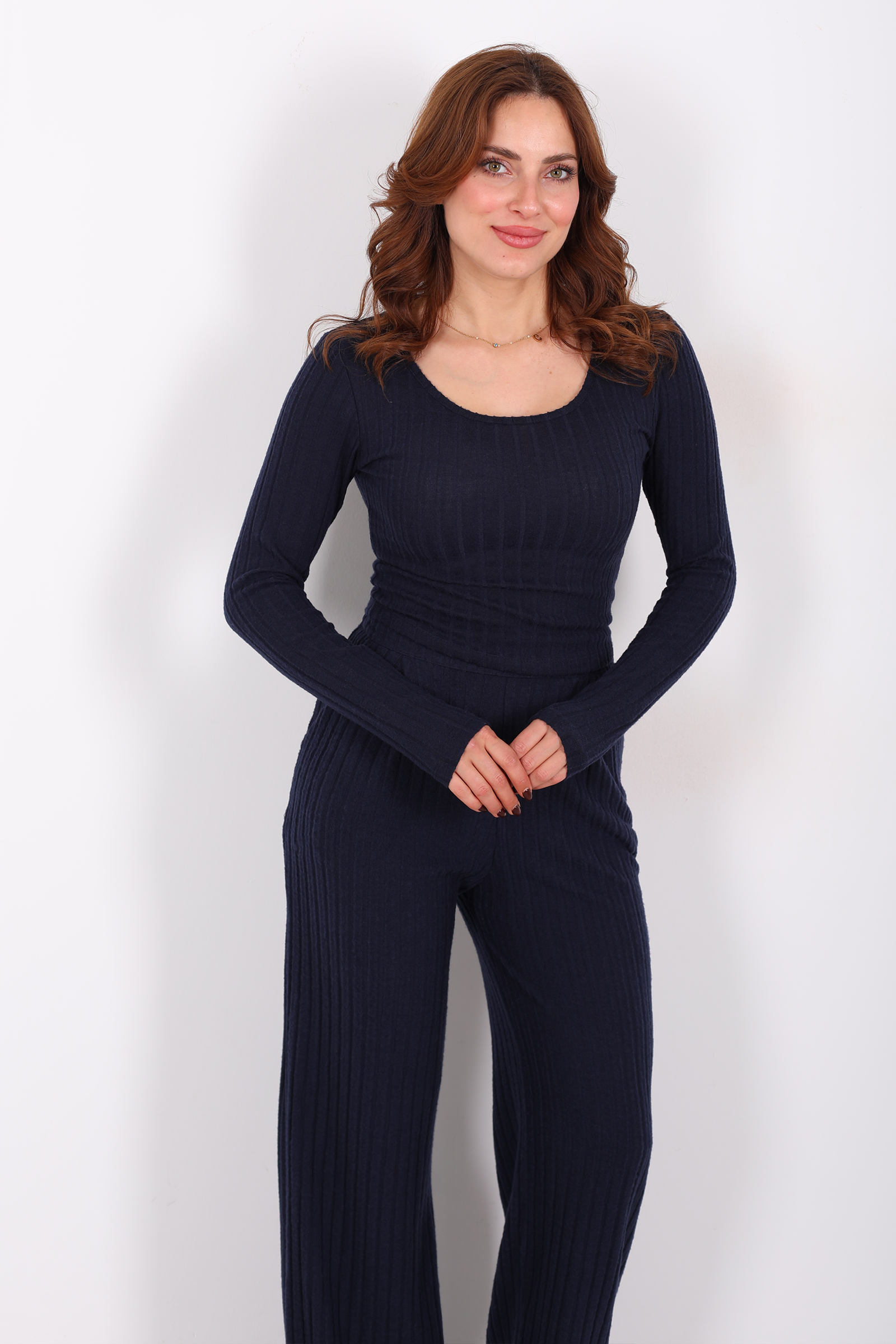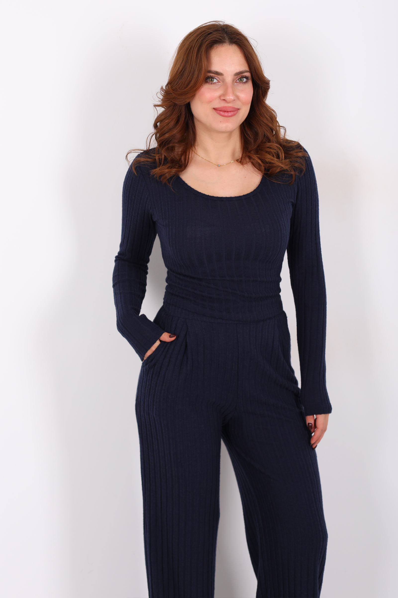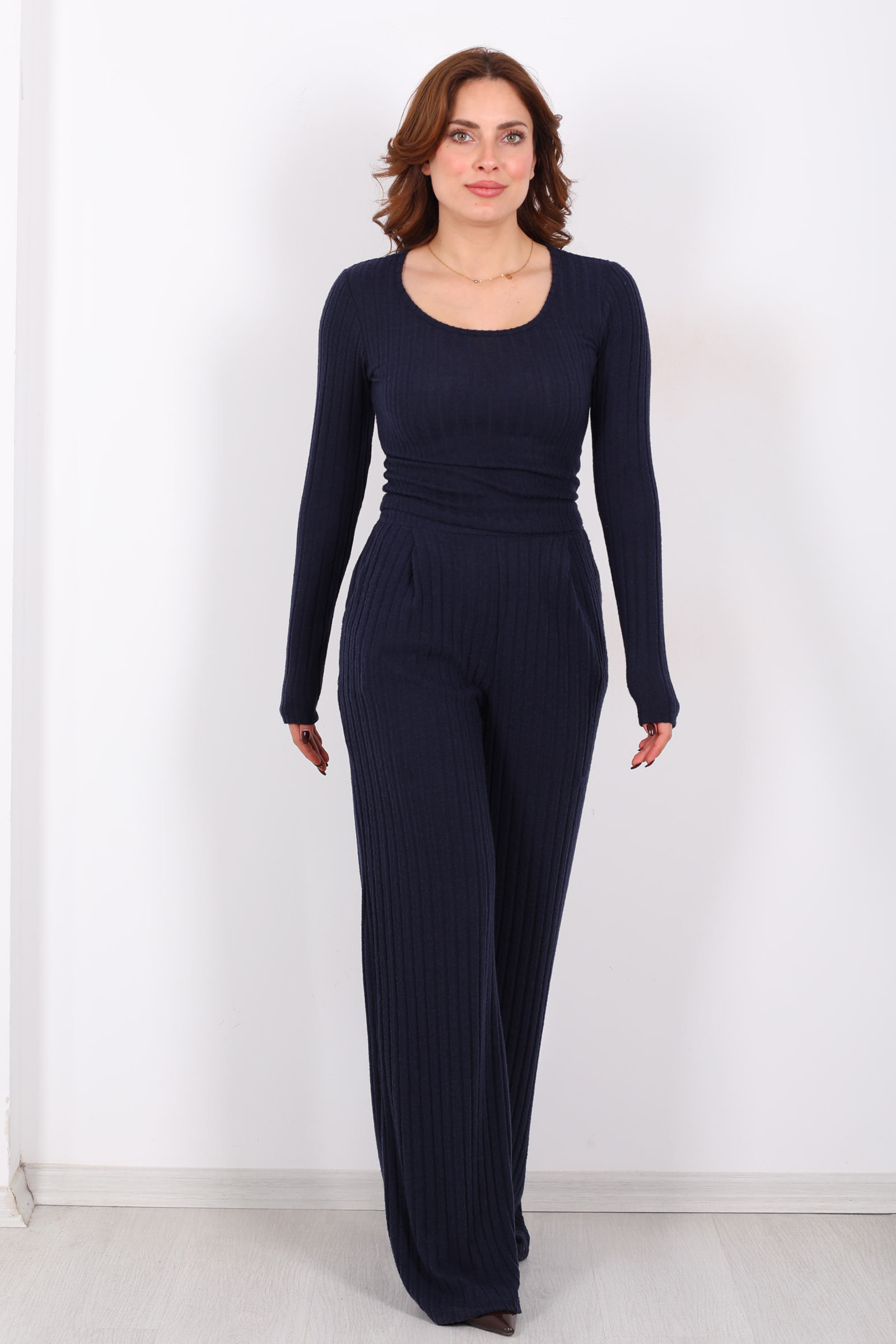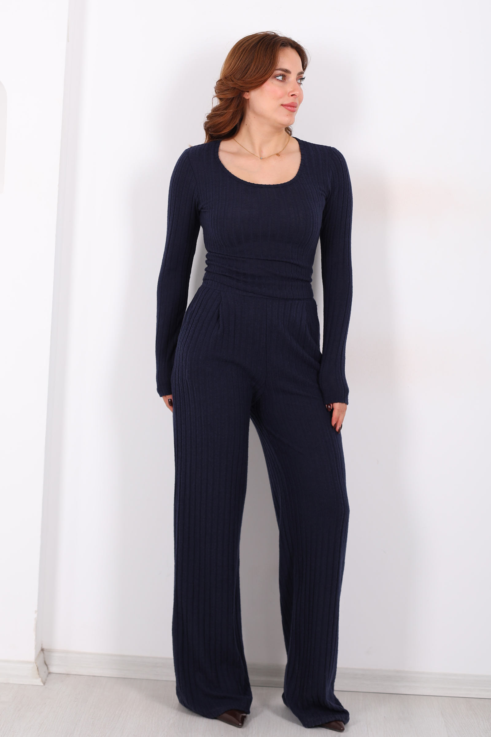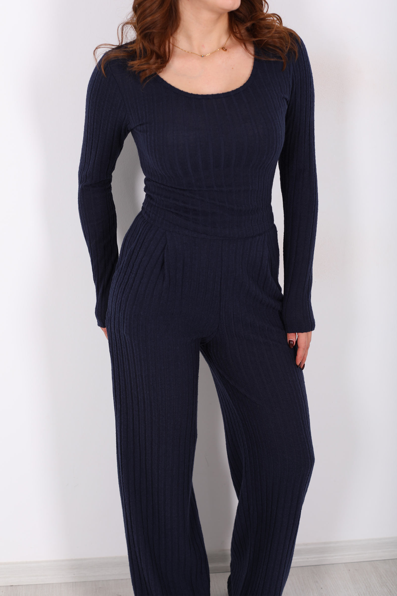 Havuz Yaka Kendinden Fitilli Lacivert Kadın Pantolon Takım, sade şıklığı gece mavisinin derinliğiyle buluşturan stil odaklı bir seçenektir. Üst parçanın havuz yaka detayı, boynunuzu çevreleyen zarif bir çerçeve gibi dururken, alt parçanın kendinden fitilli dokusu takımın enerjisine ritmik bir akış katar. Lacivertin dingin tonu, gündelik kombinlerde rahat bir duruş oluştururken minimalist ama güçlü bir ifade yaratır.