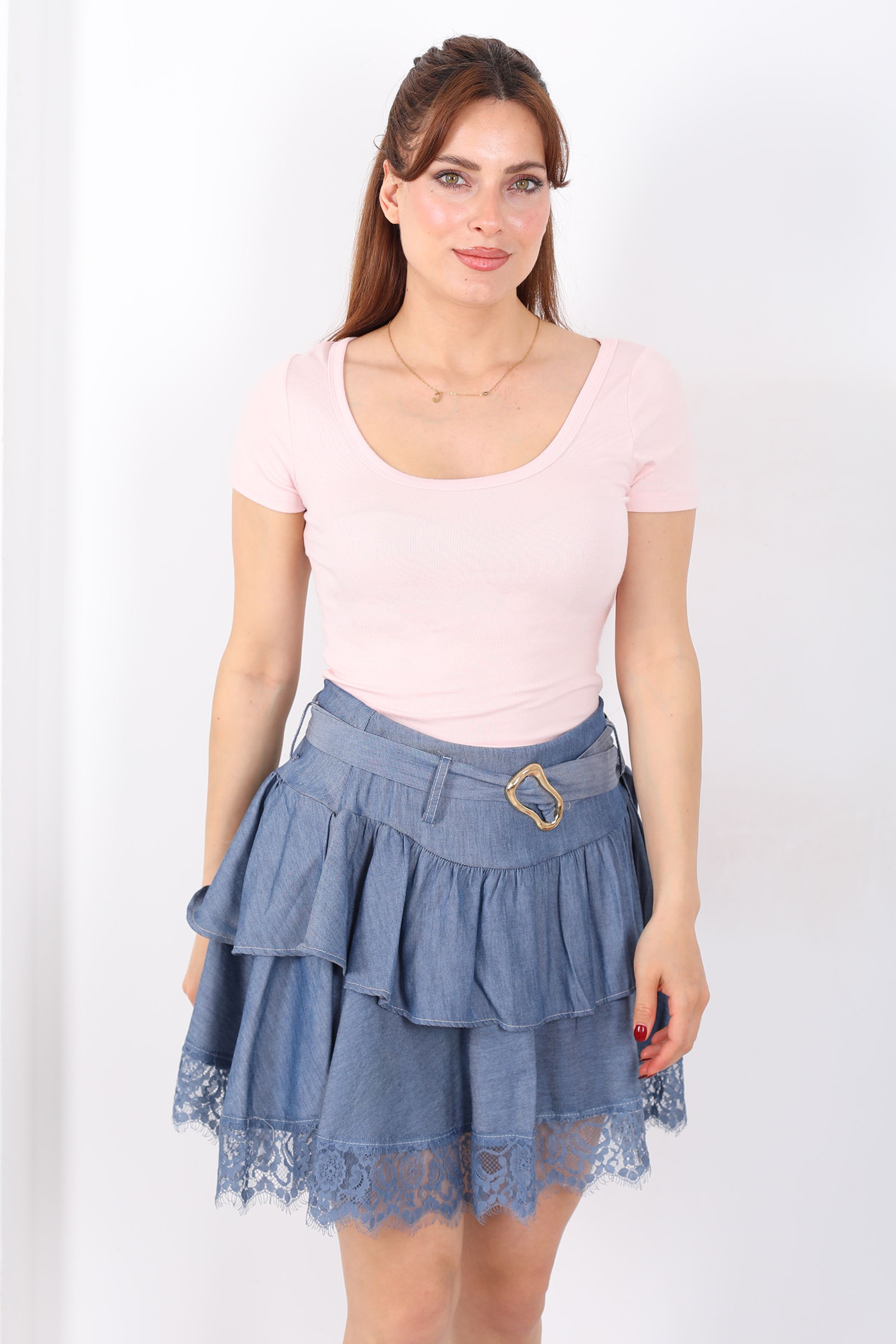 Dantelli Kemerli Kat Kat Mavi Kadın Mini Etek