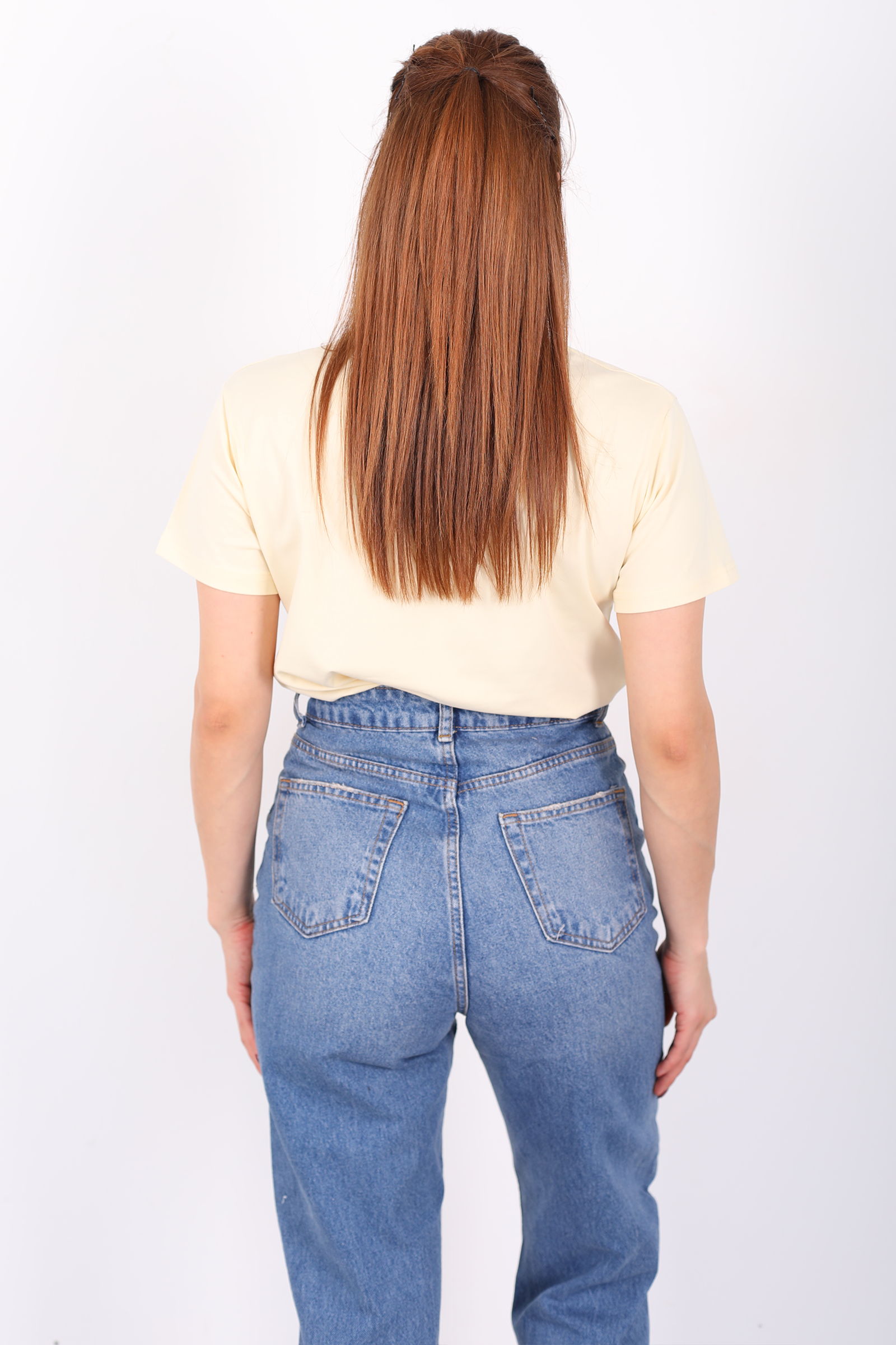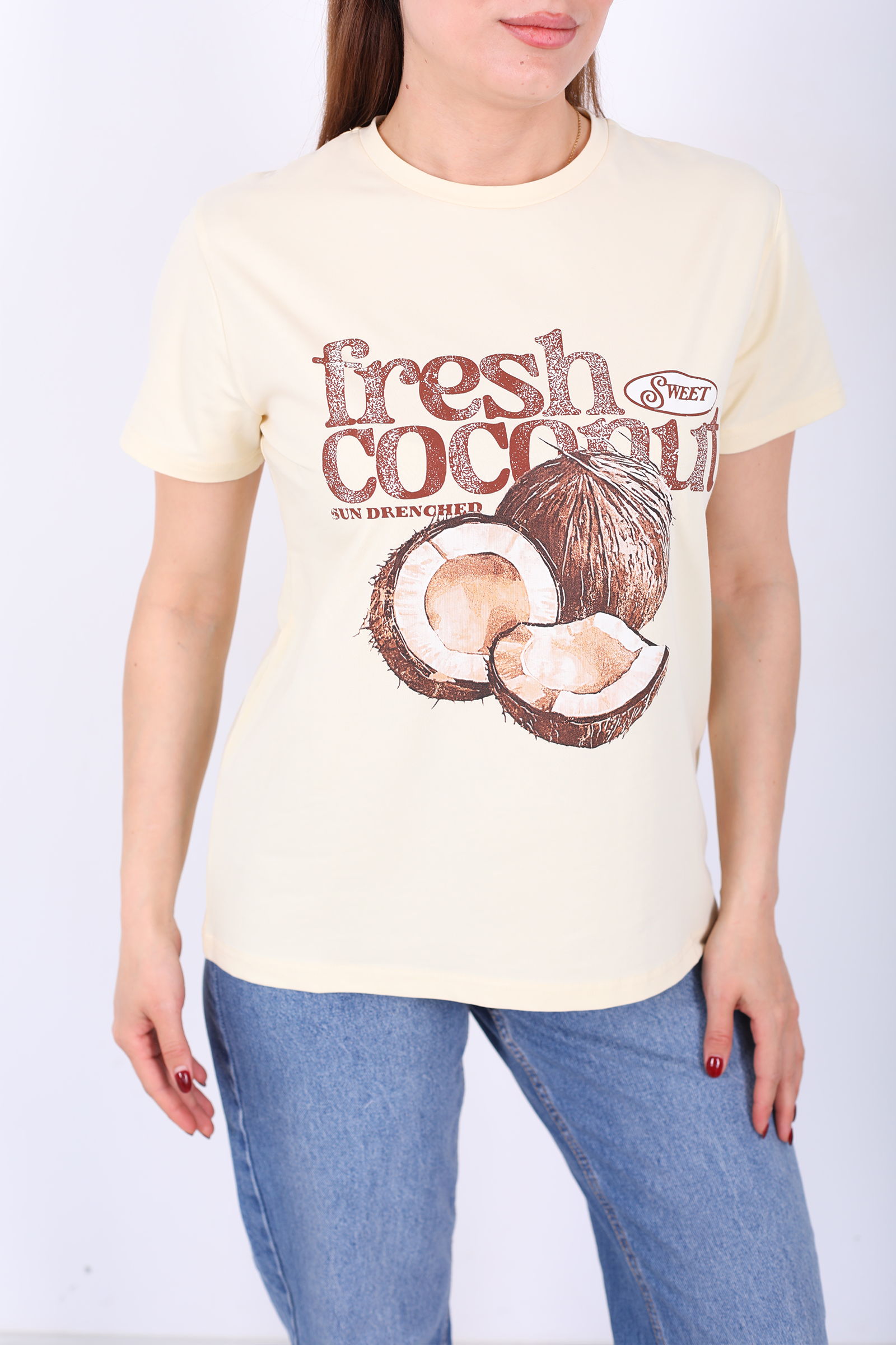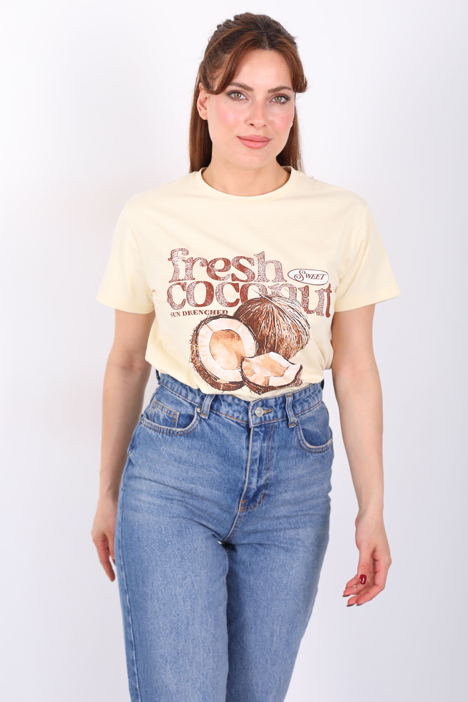 Hindistan Cevizi Baskılı Yazılı Kadın Sarı T-Shirt