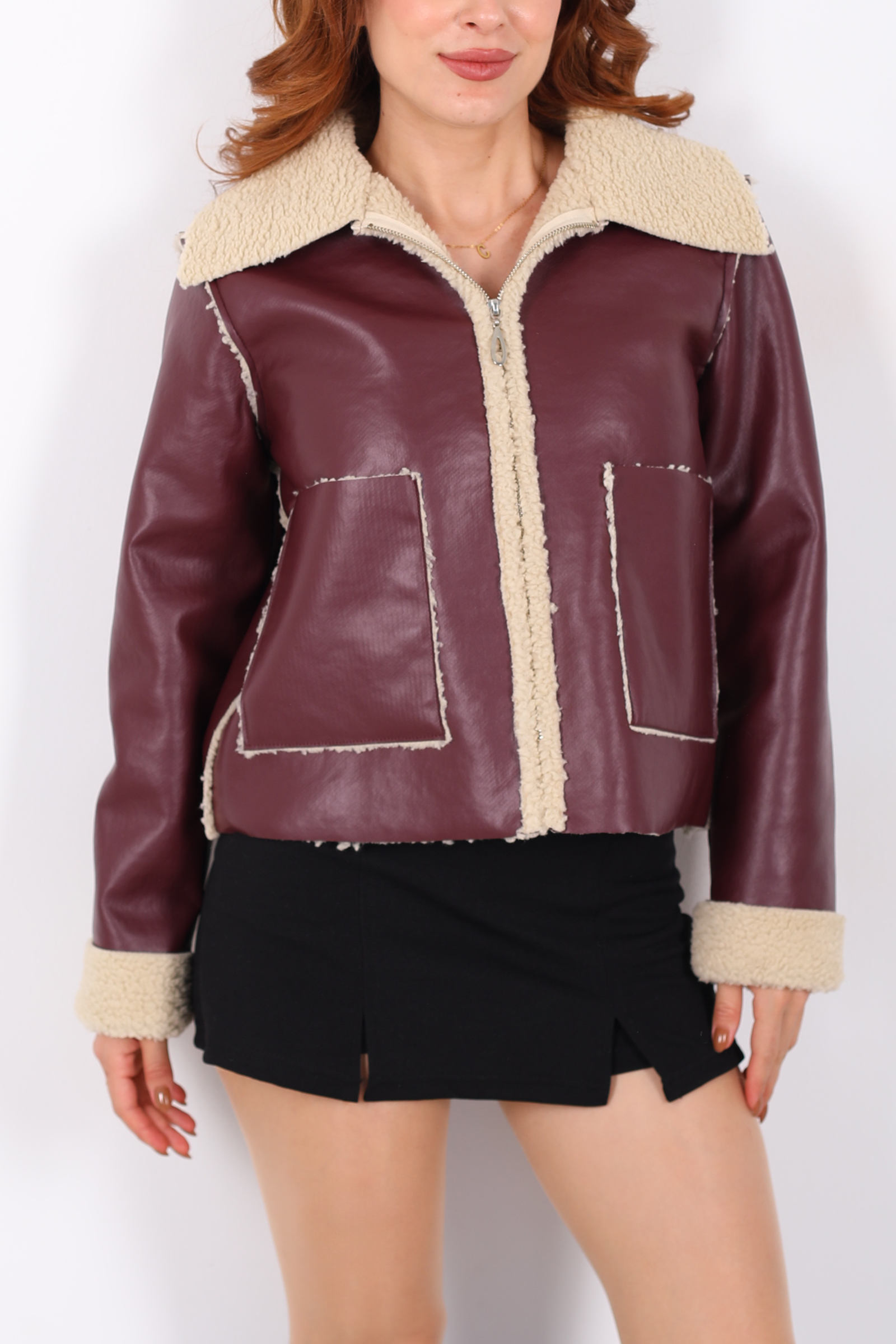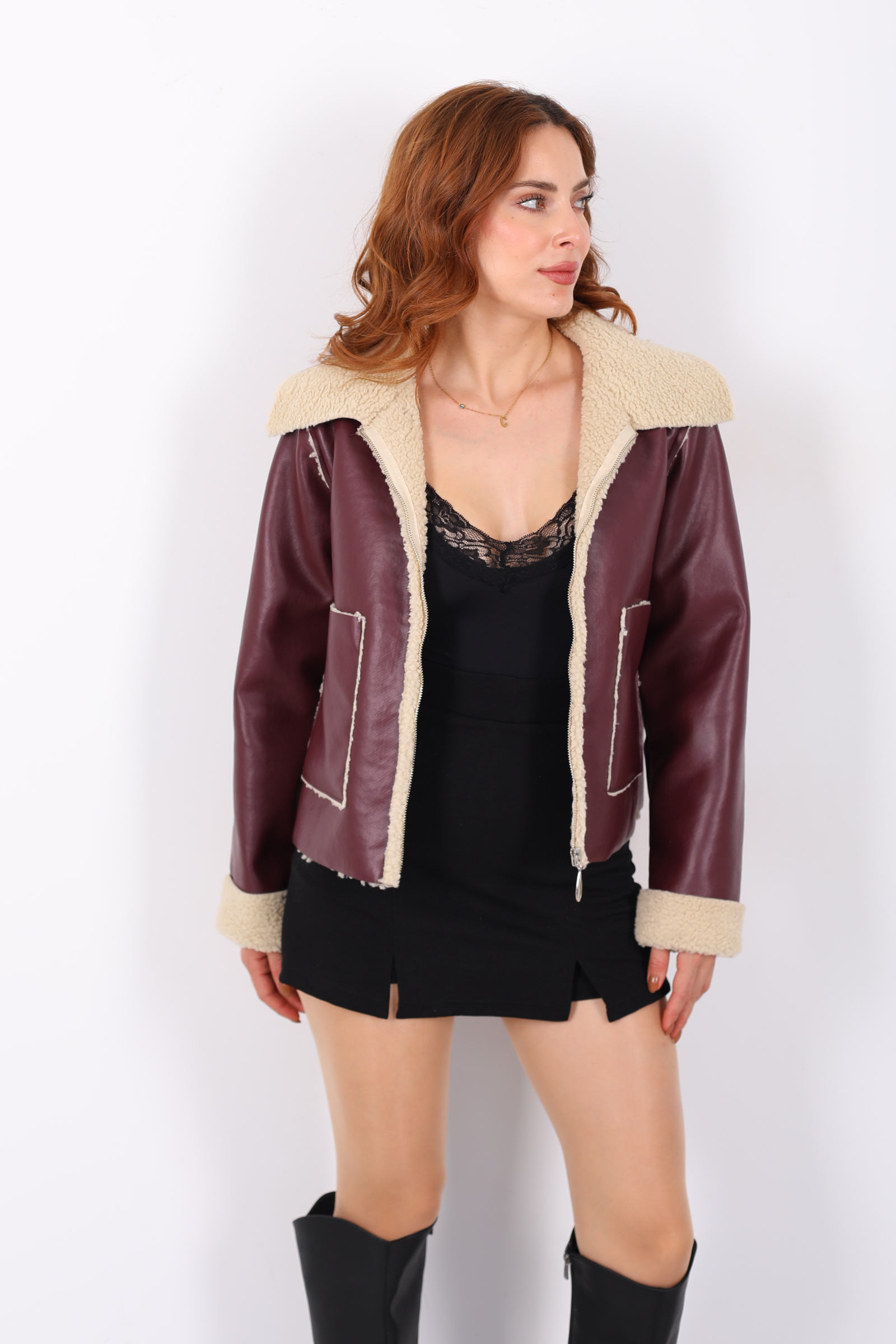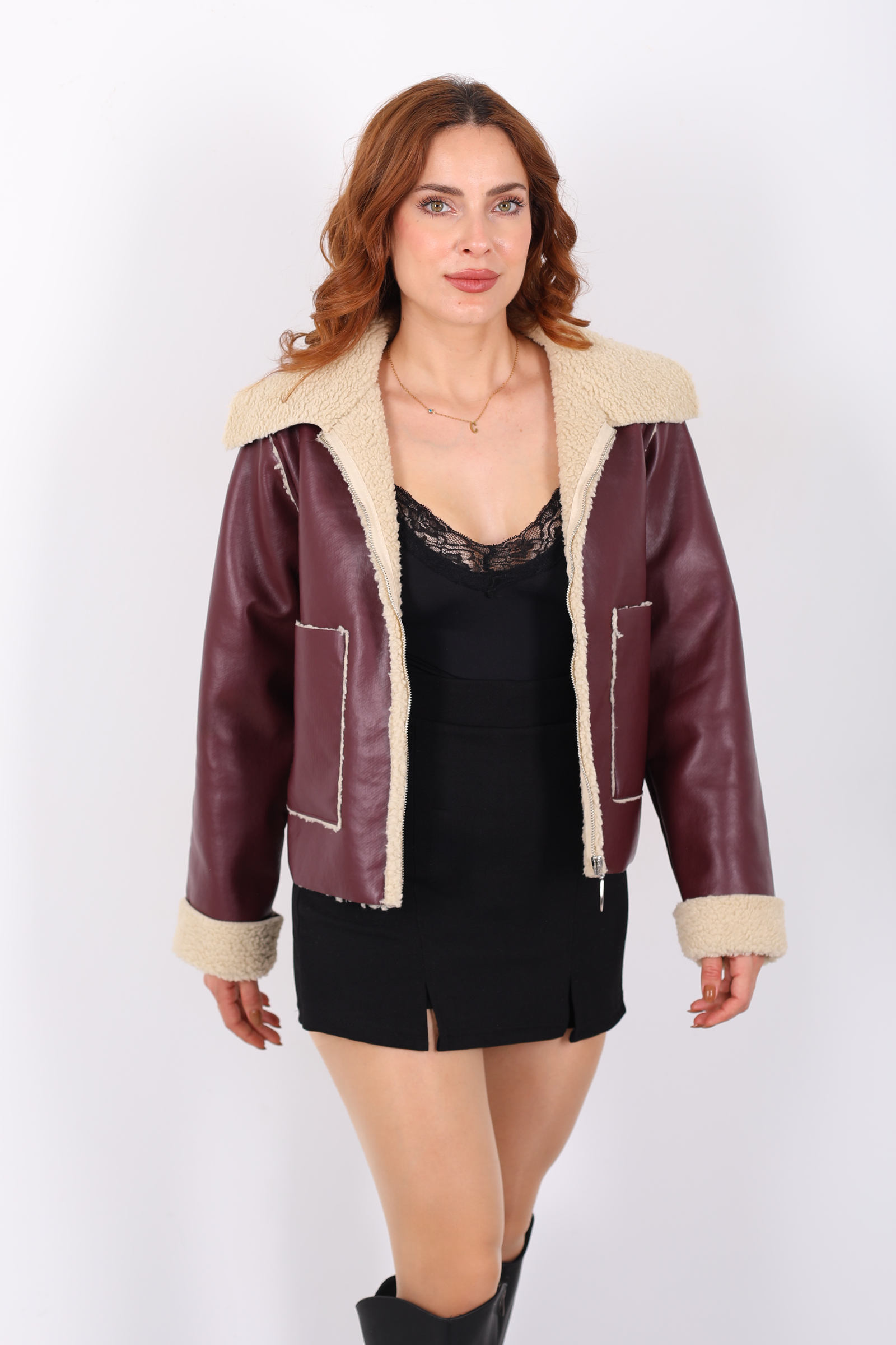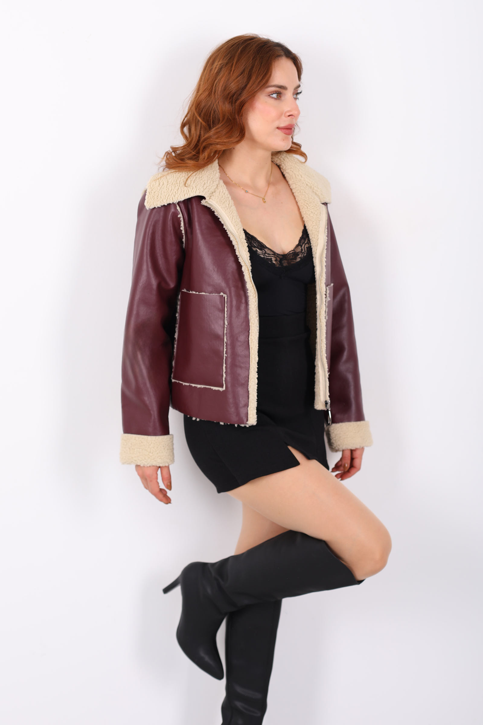 İçi Kürklü Çift Cepli Bordo Kadın Deri Ceket