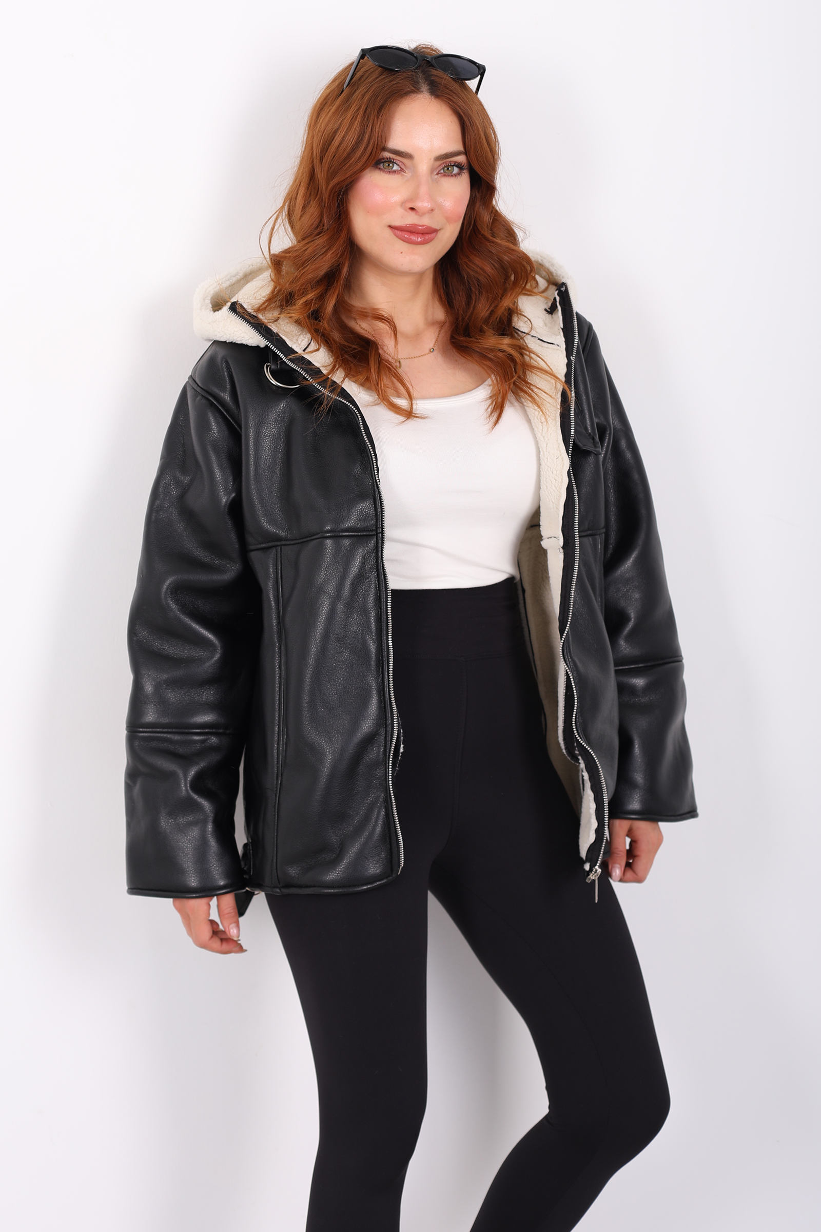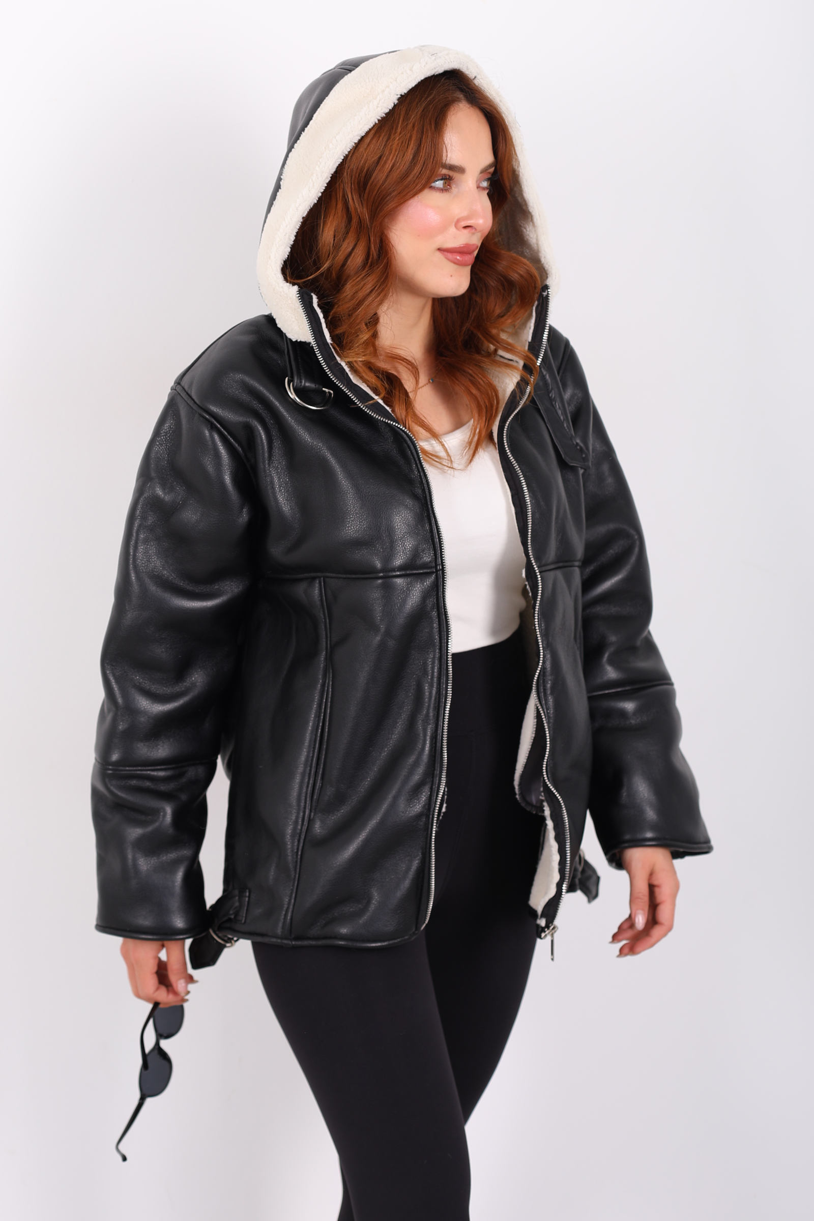 İçi Kürklü Kapüşonlu Beyaz Kadın Deri Mont