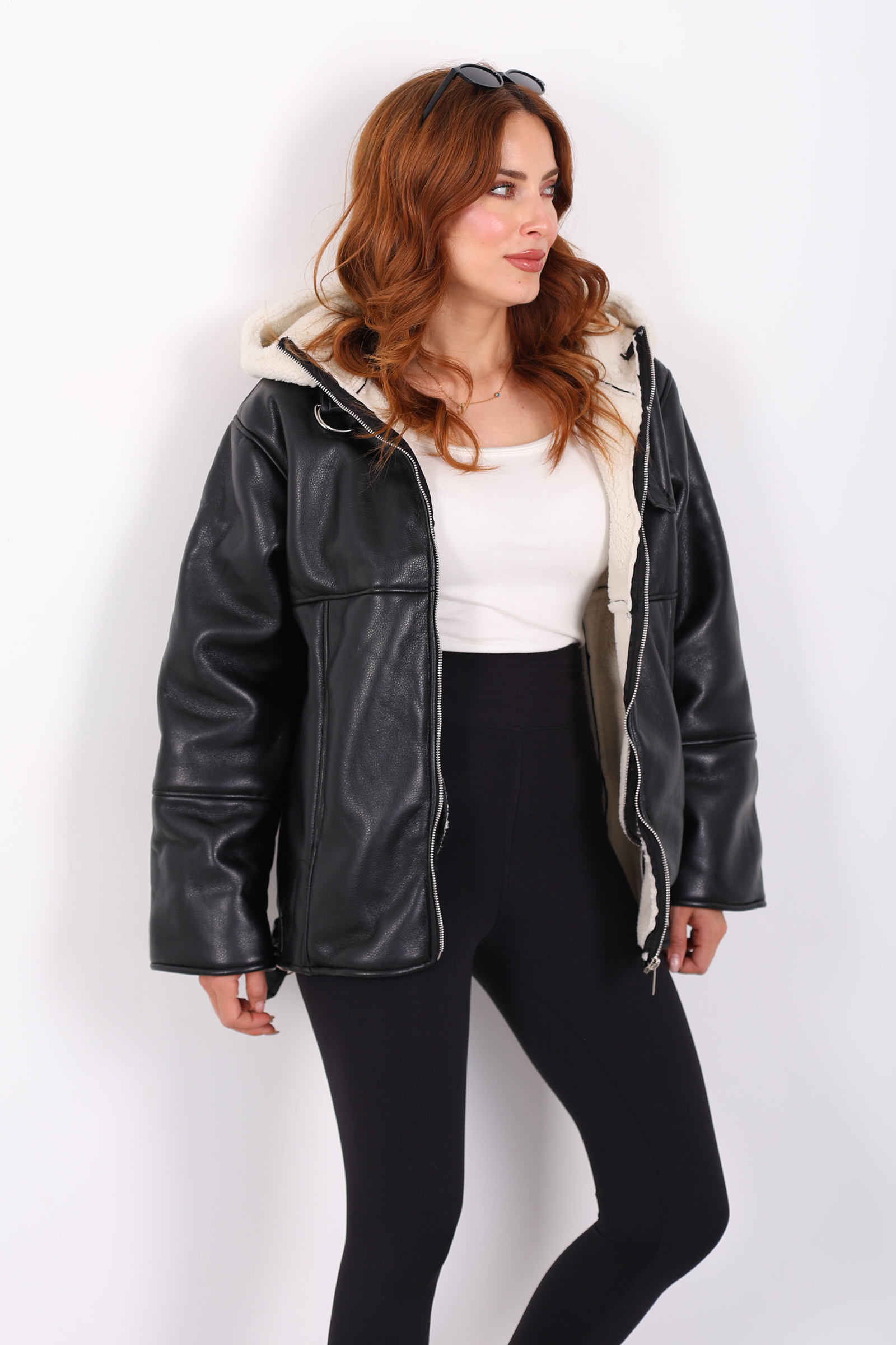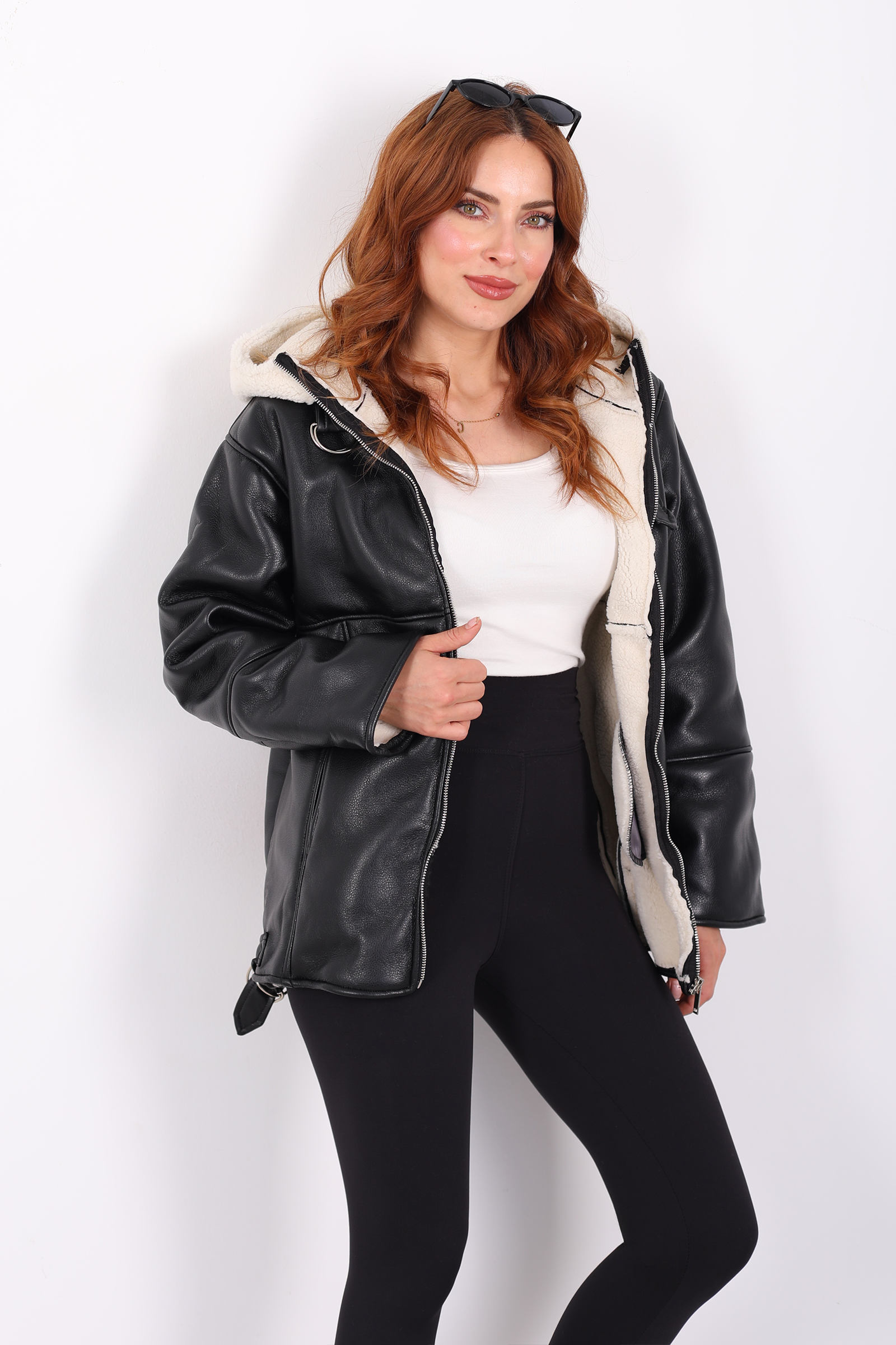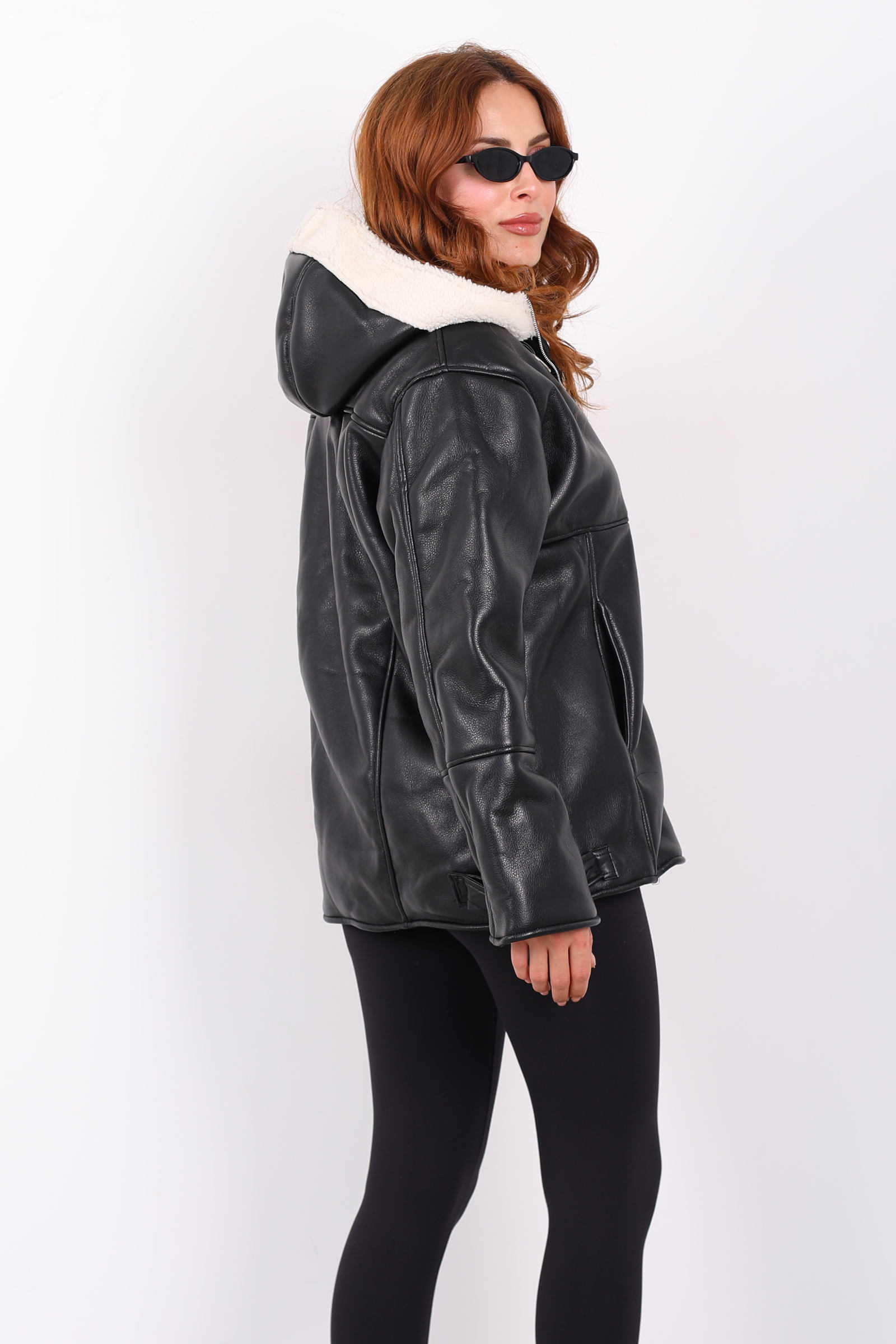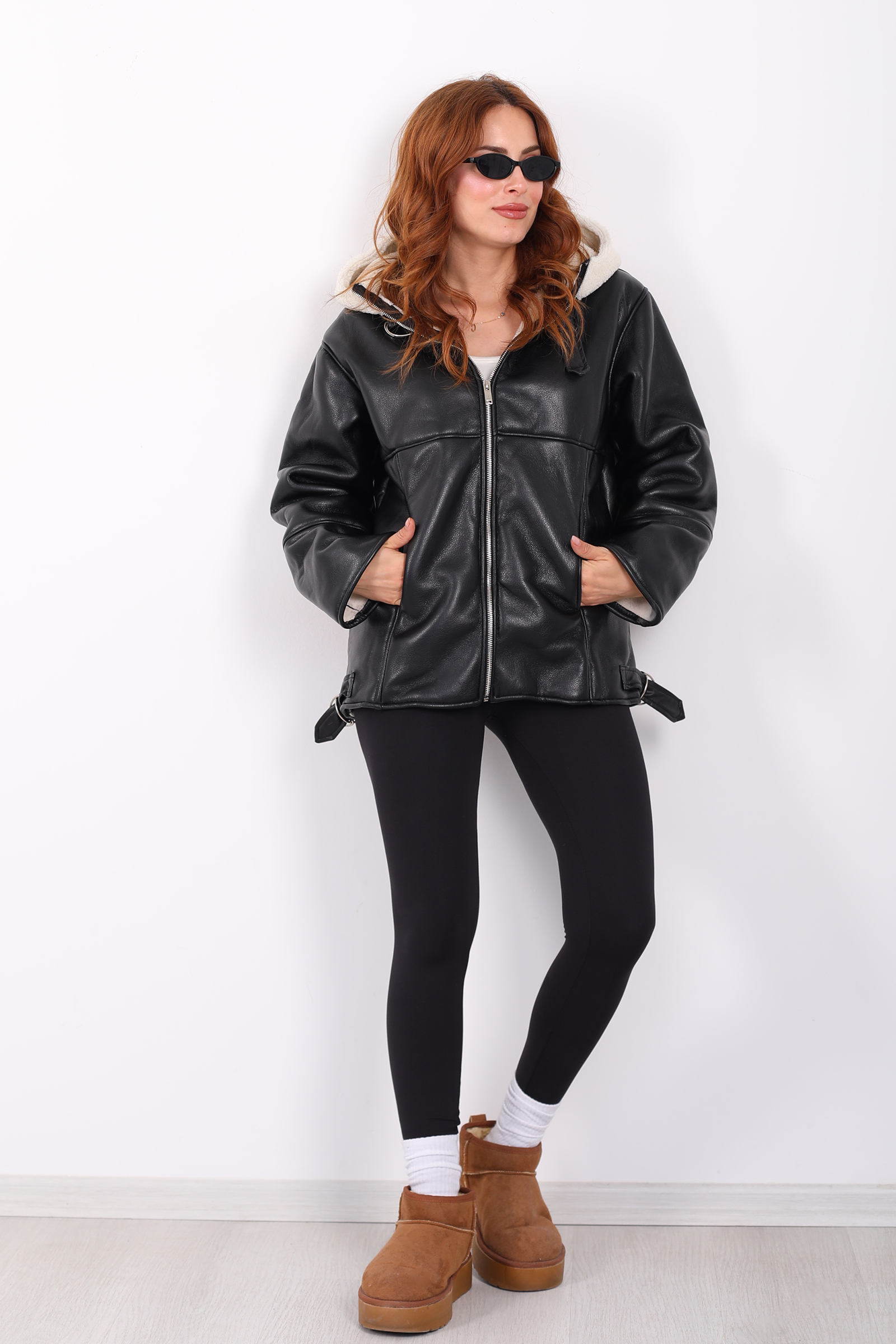 Yaka Kürklü Zımbalı Siyah Kadın Deri Mont