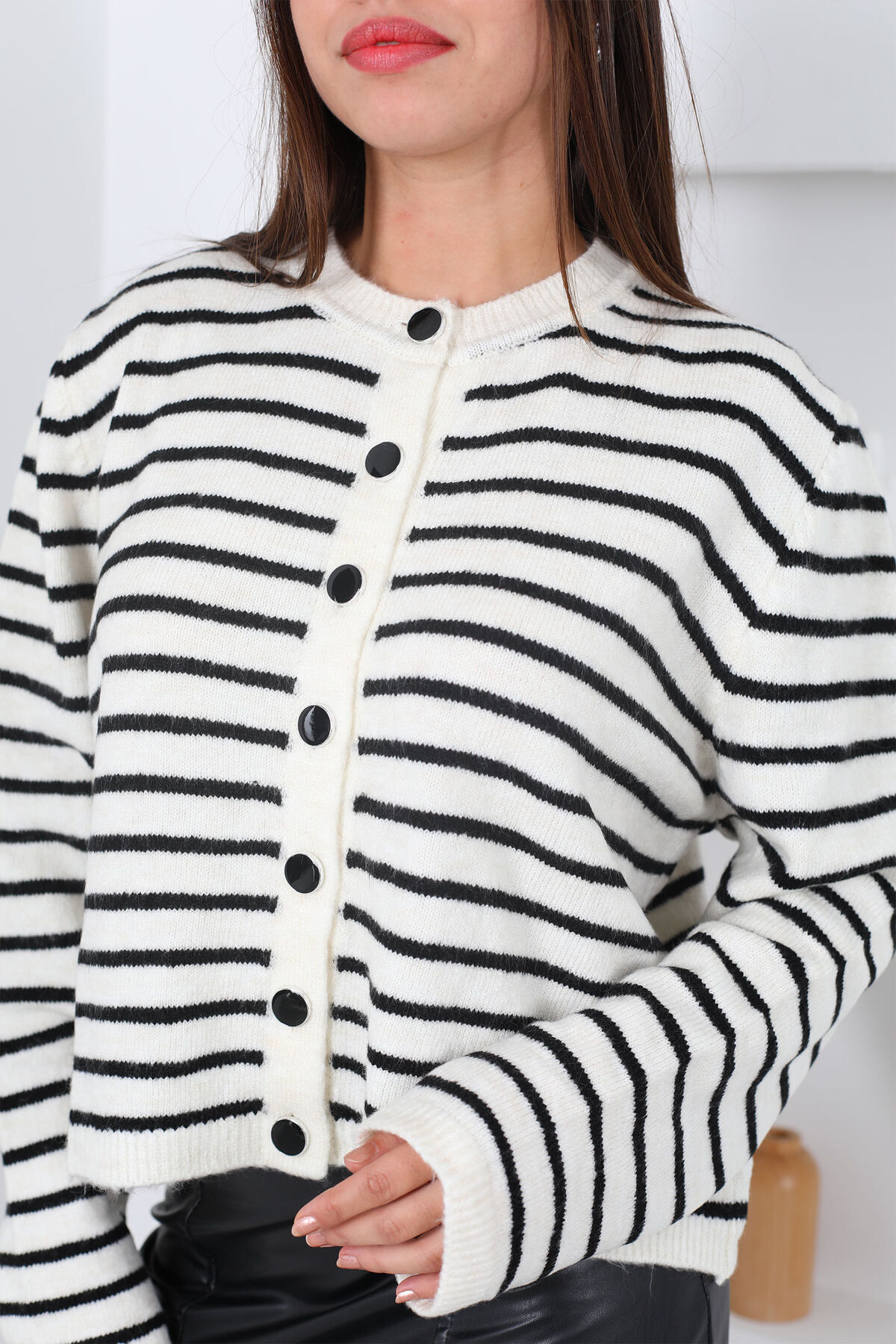 İnce Çizgili Düğmeli Beyaz Kadın Triko Hırka