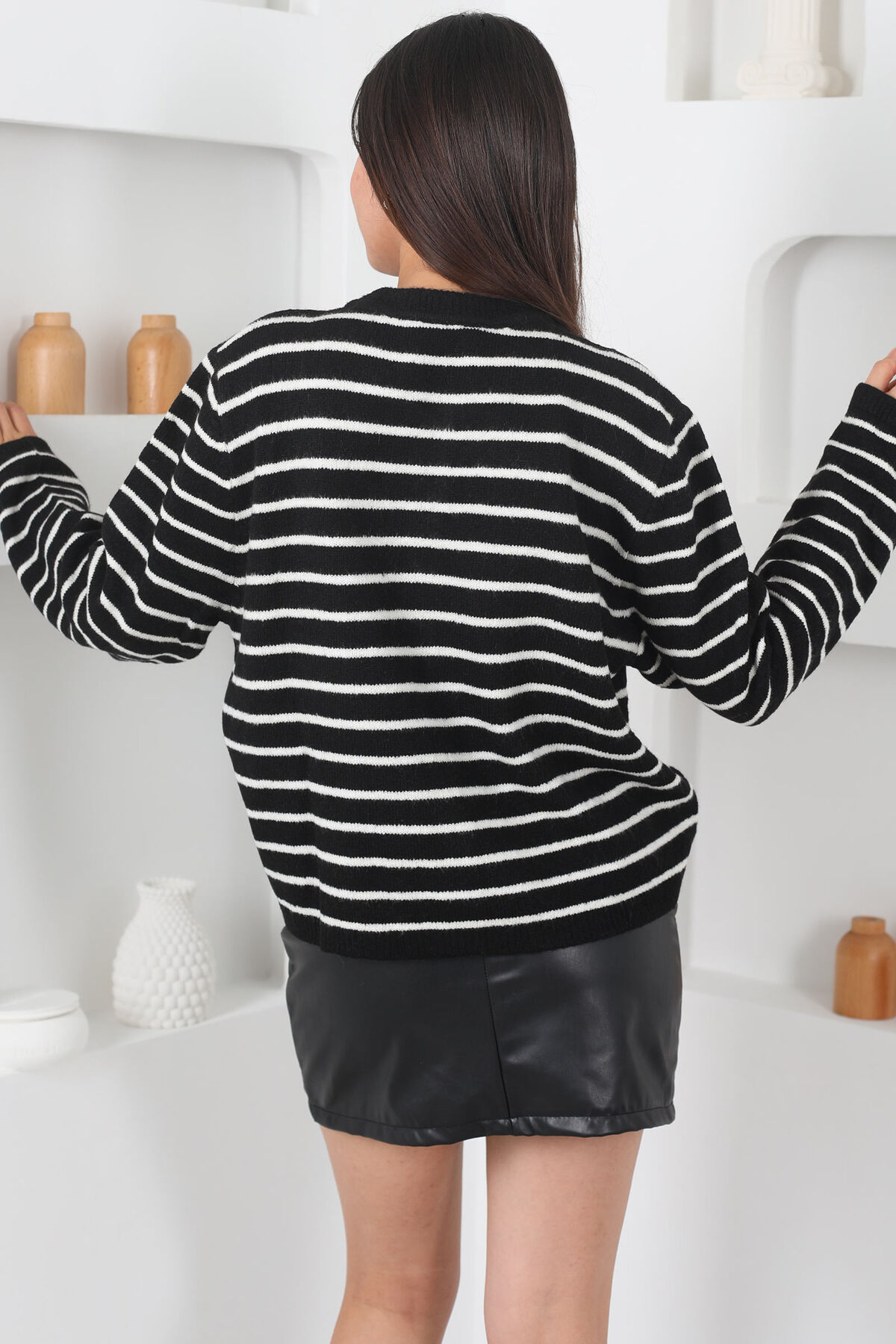 İnce Çizgili Düğmeli Siyah Kadın Triko Hırka