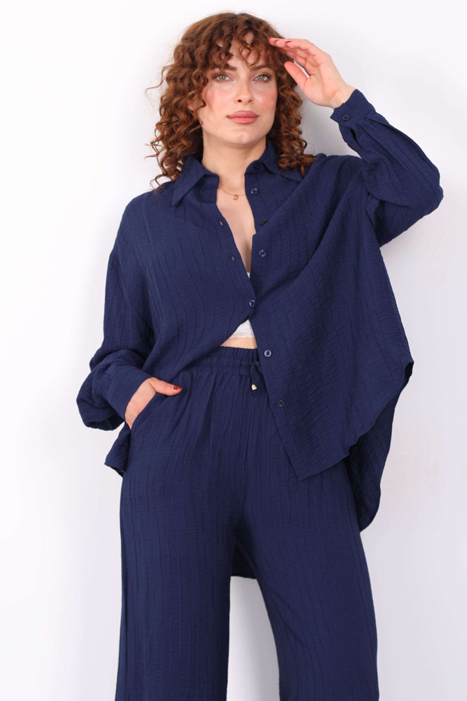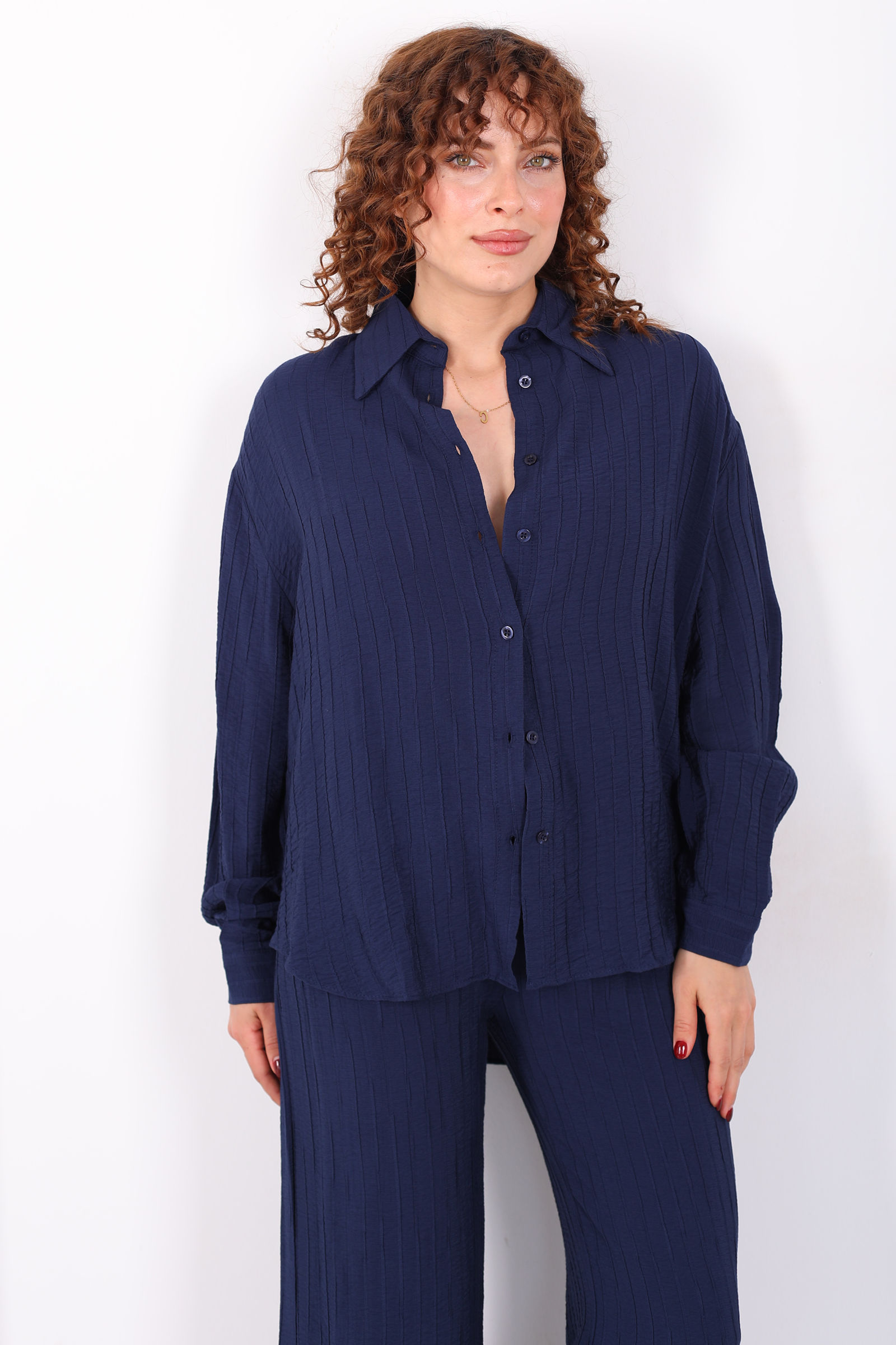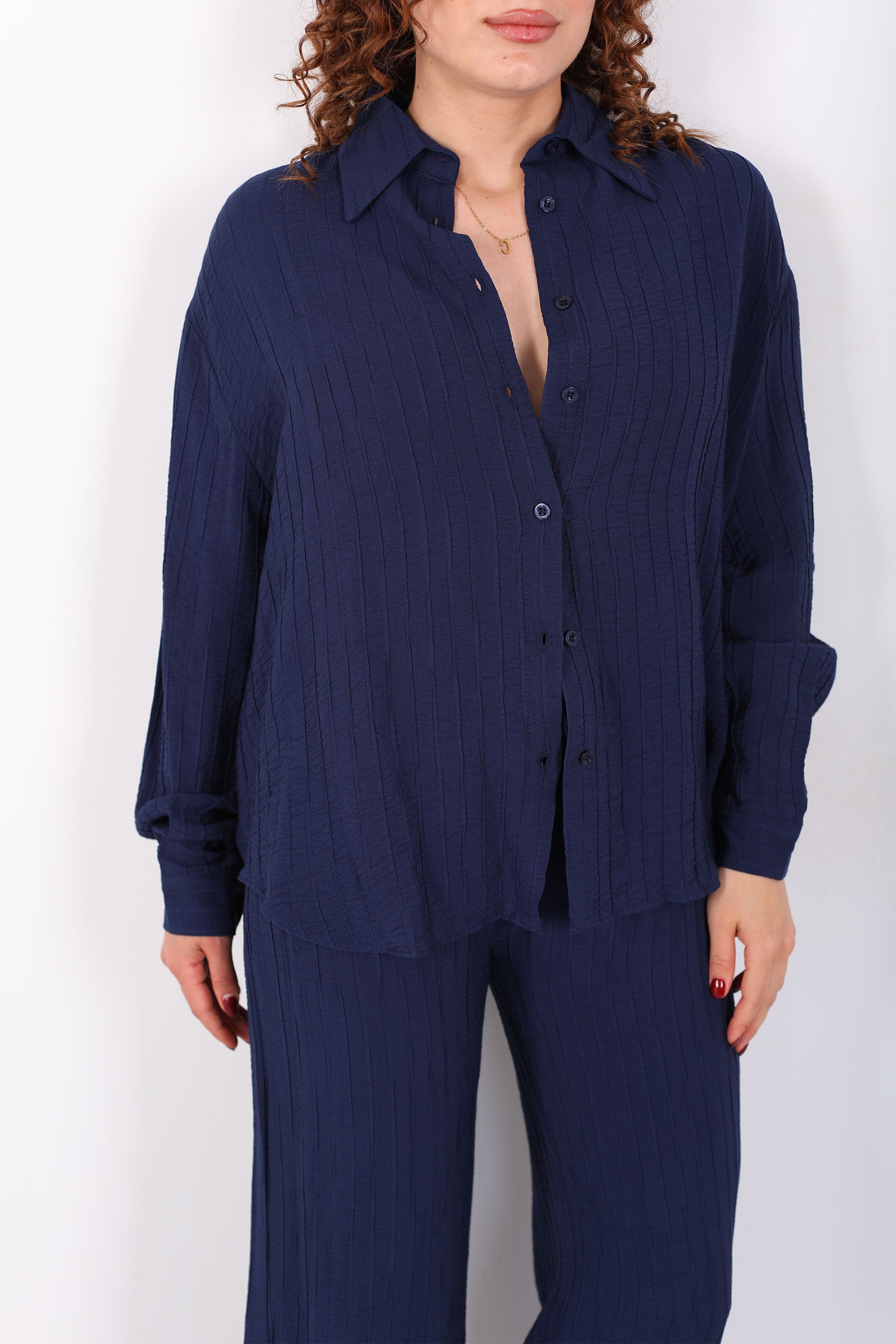 İnce Çizgili Kadın Lacivert Oversize Gömlek