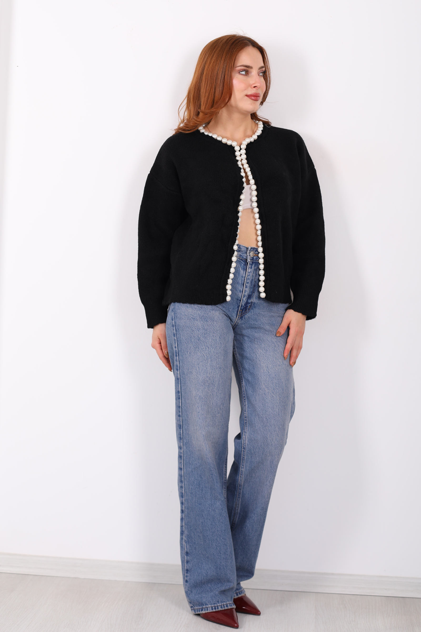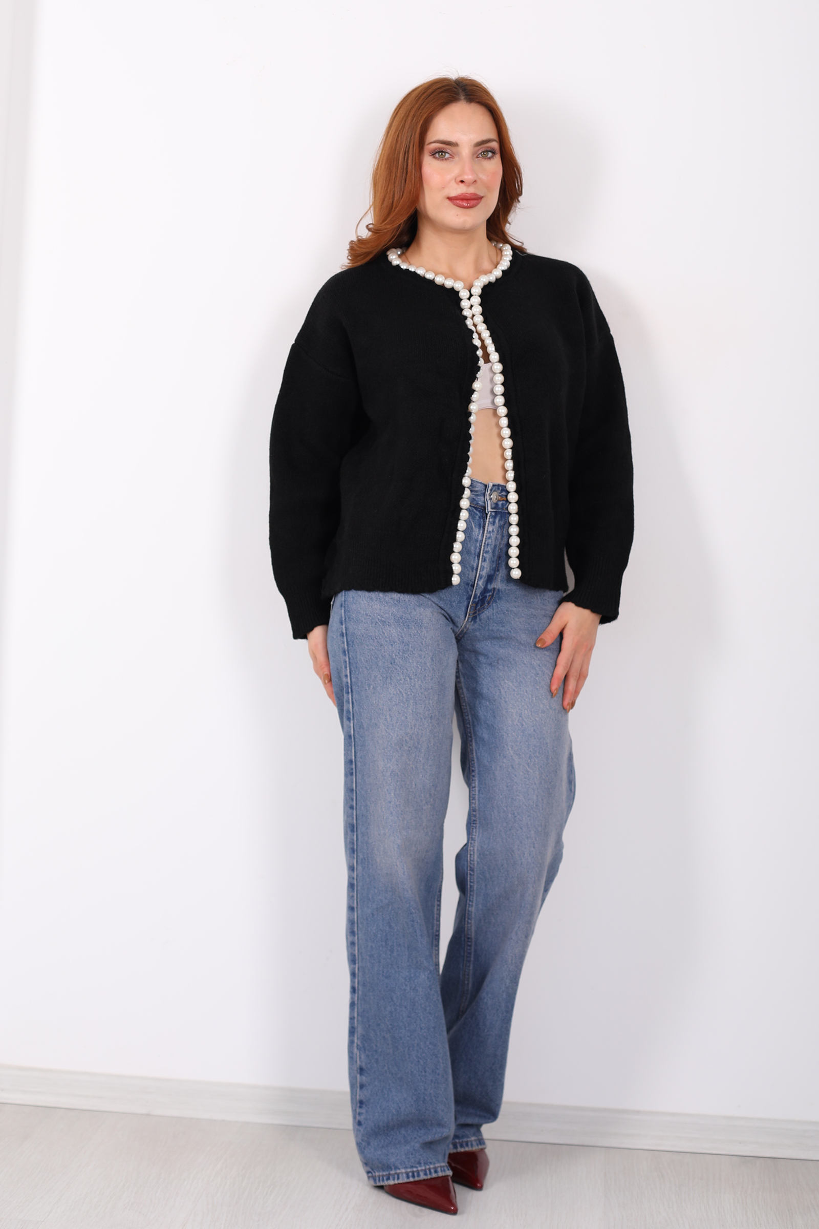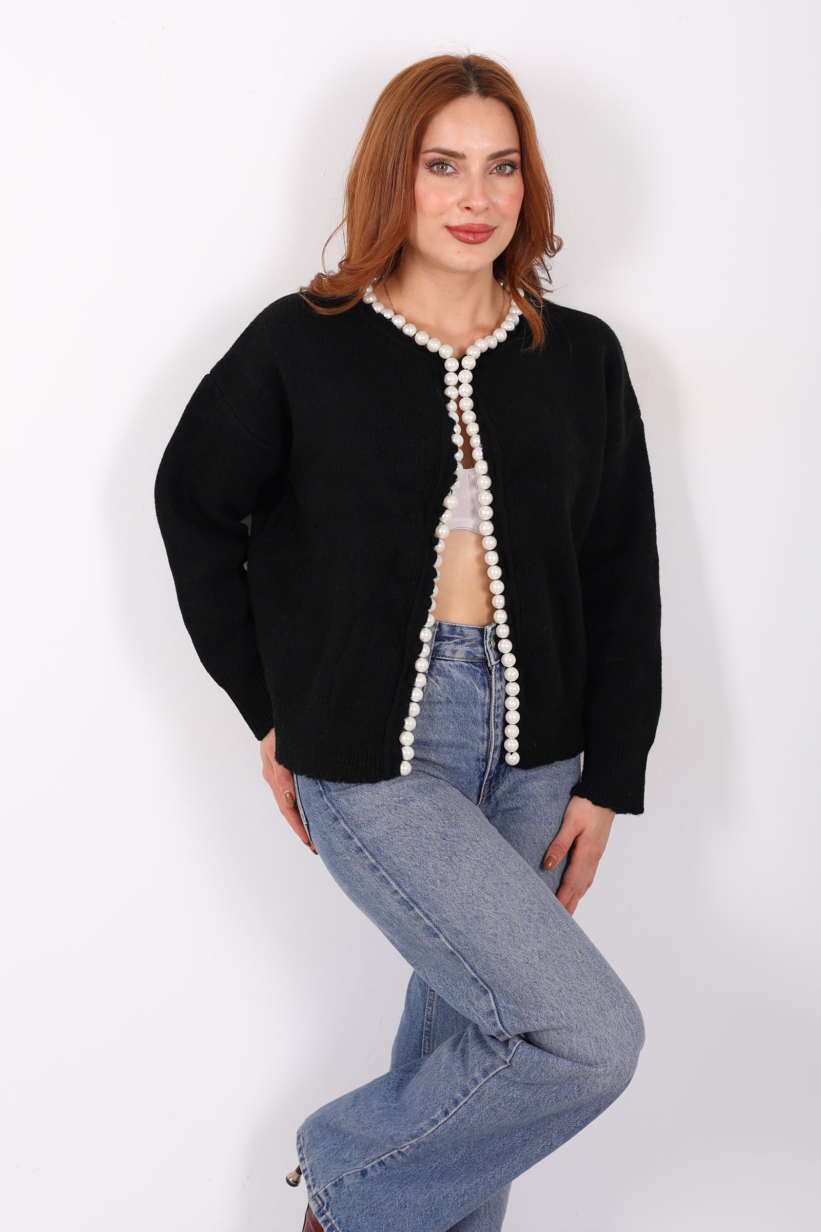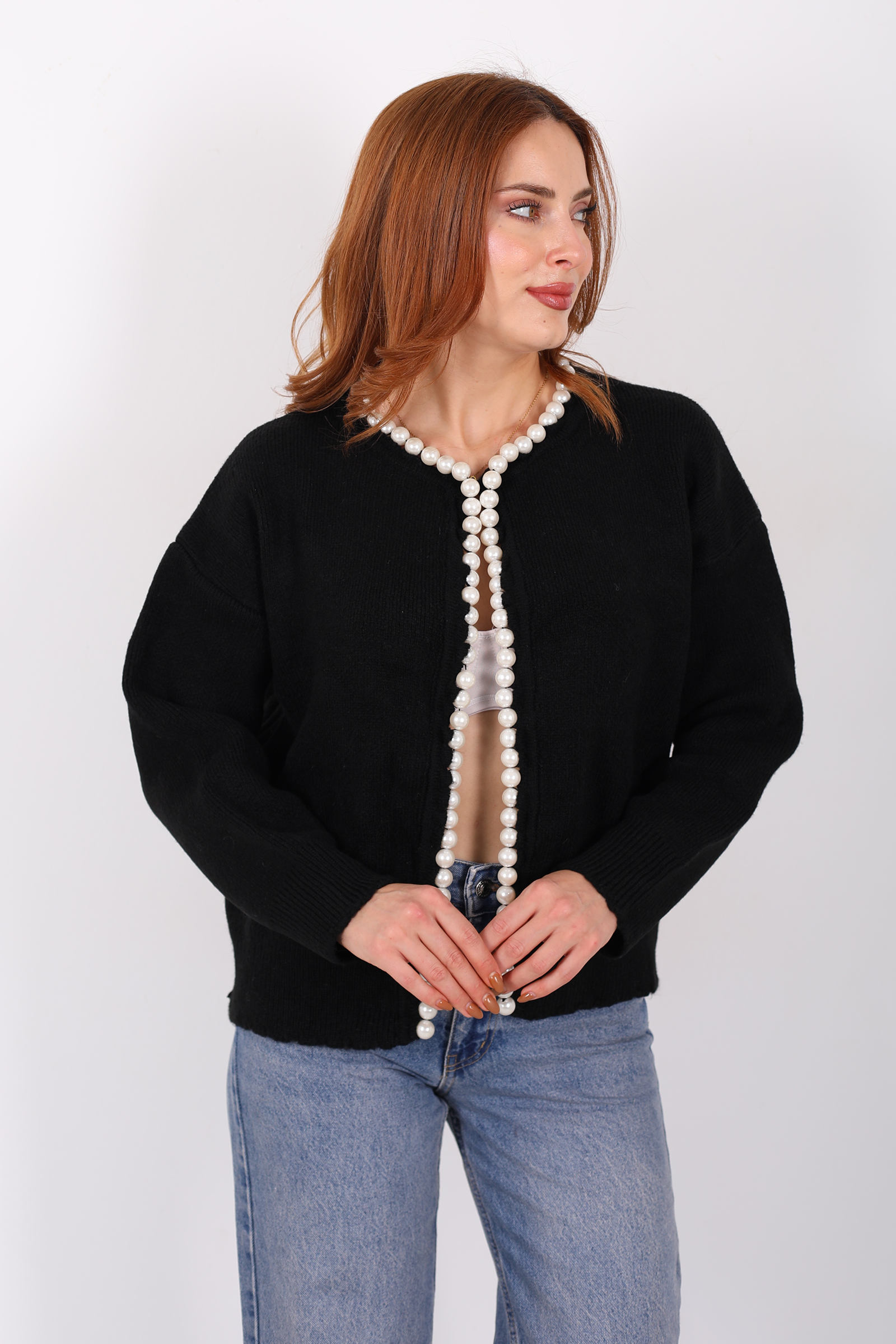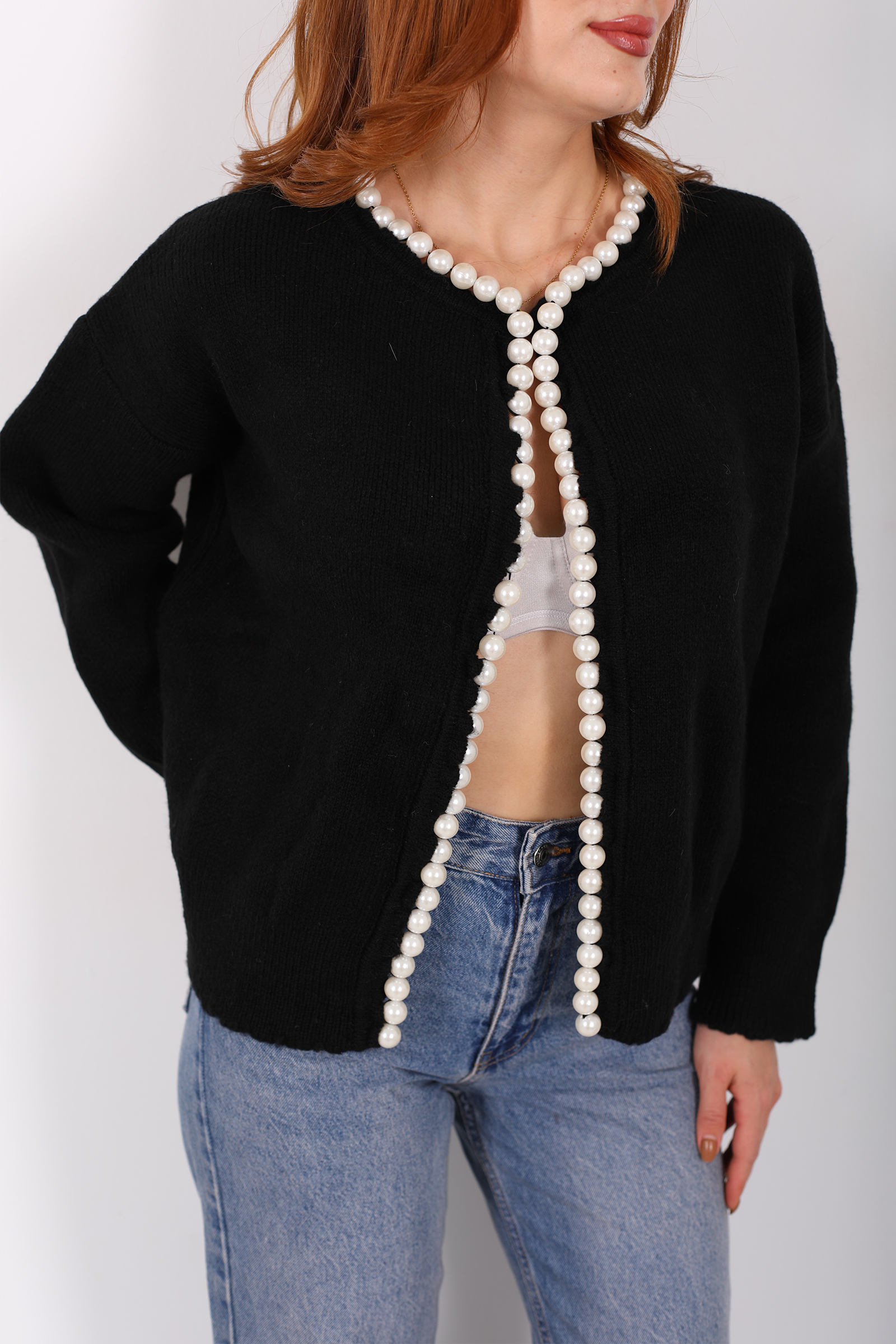 İnci Aksesuarlı Siyah Kadın Triko Hırka