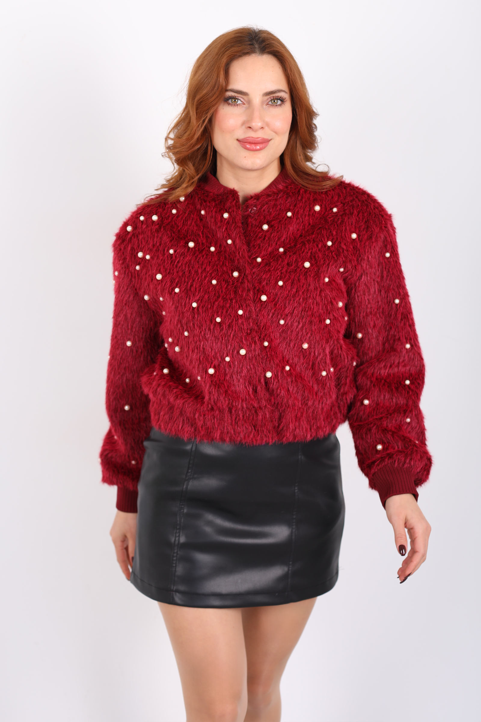 İnci Detaylı Suni Kürk Bordo Kadın Bomber Ceket