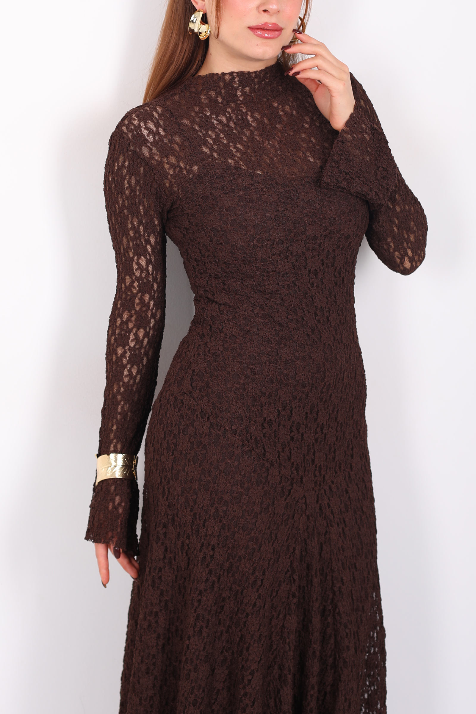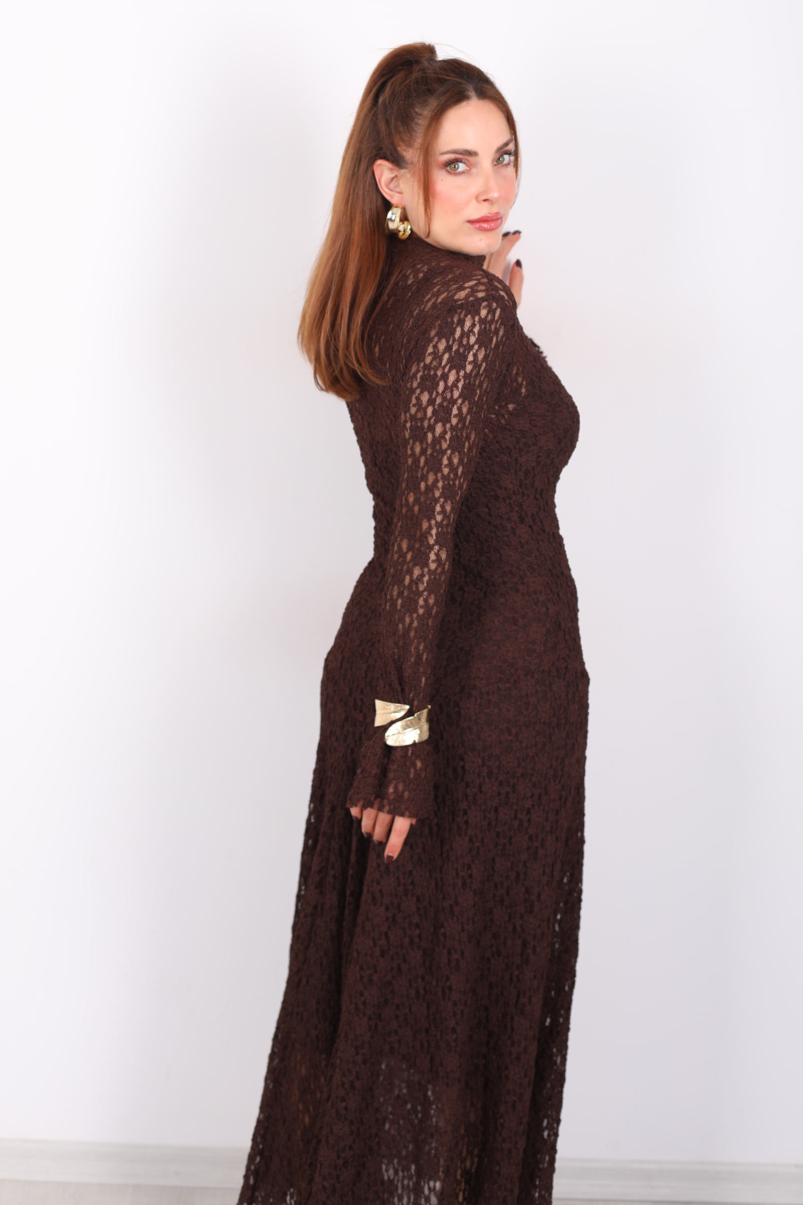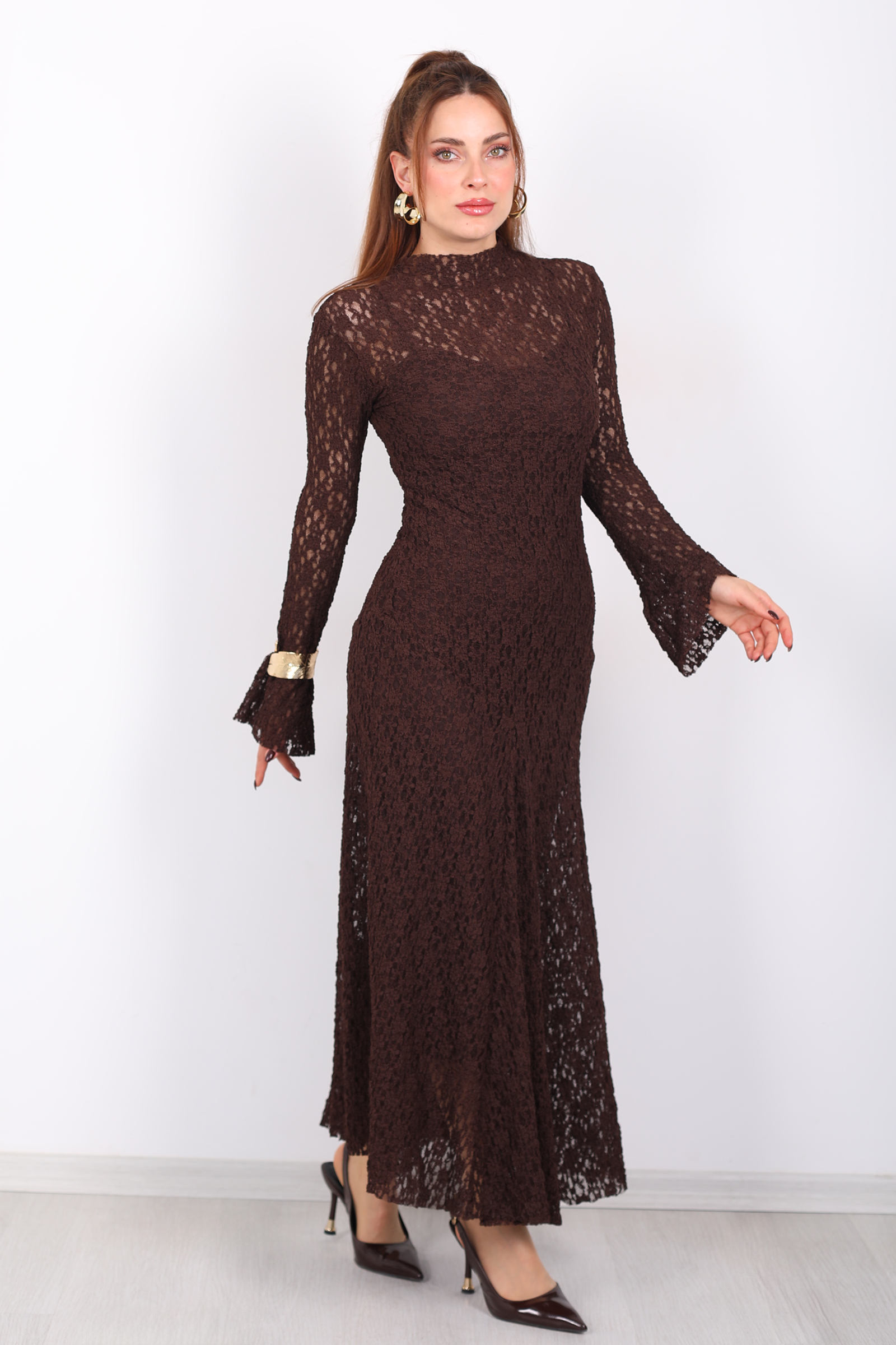 Gündüzün sıcak tonlarından akşamın büyülü ışıklarına akabilen bir elbise… Bu acı kahve renkli dantel elbise, sadece kumaşla çevrili bir siluet değil kişisel stilinin ritmini duyuran bir anlatıdır. İspanyol kolun zarafeti, omuz hattında yumuşak bir heykelsi kıvrım sunarken balık model kesim, bedenini akışkan ama çarpıcı bir çizgide sarar.