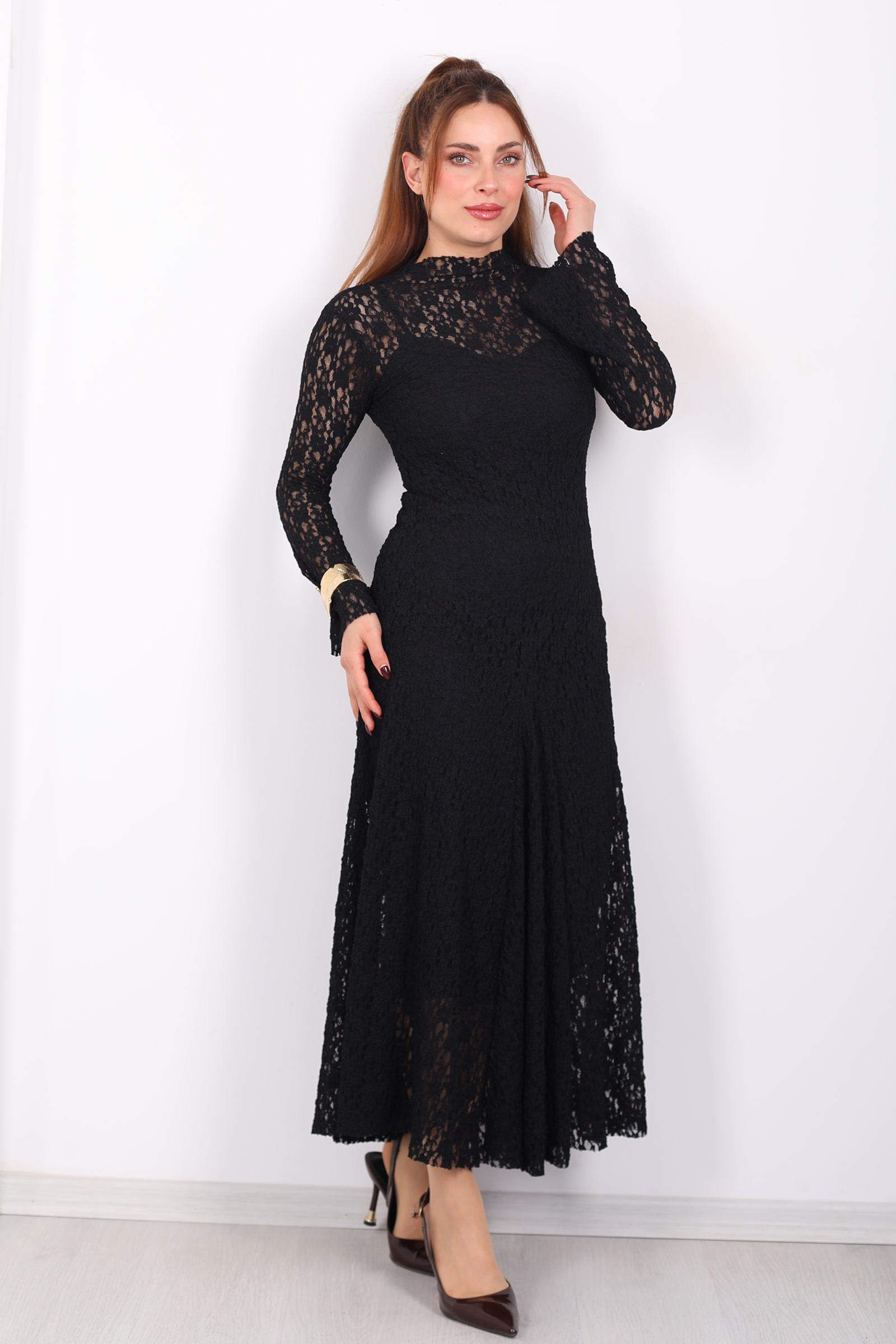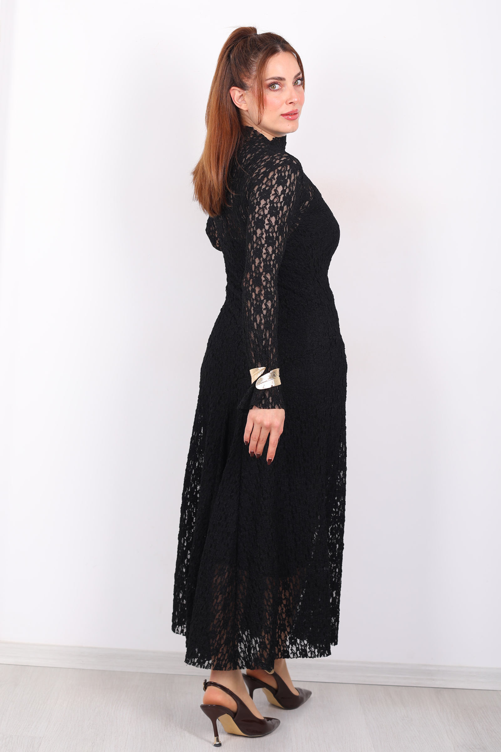 Gösterişin sessiz ama çarpıcı bir yolunu arayanlara: Bu siyah dantel elbise, sadece giyilmek için değil stil ile ifade edilen bir duruş için tasarlandı. İspanyol kol, zarafeti doğrudan vurgularken omuz hattına hafif bir hacim ve “hareket anı” kazandırır; balık model siluet ise beden çizgisini yumuşak bir akışla sarar.