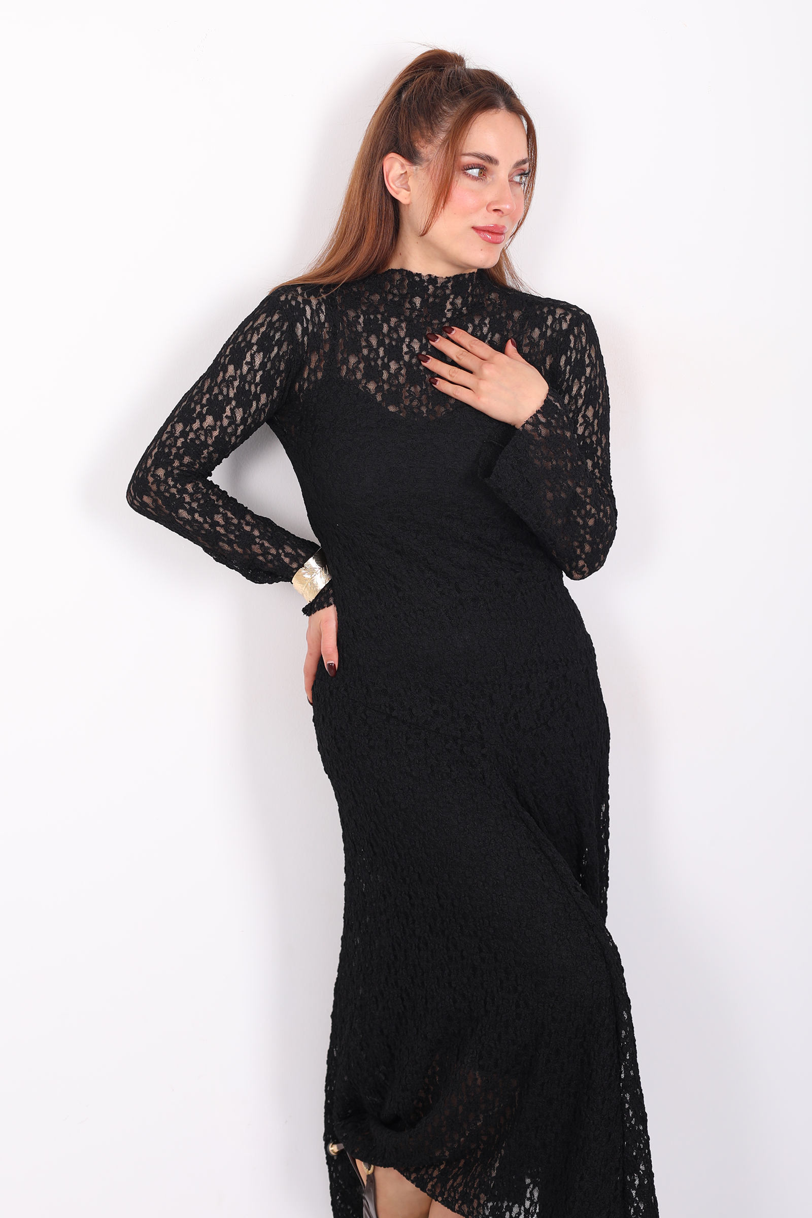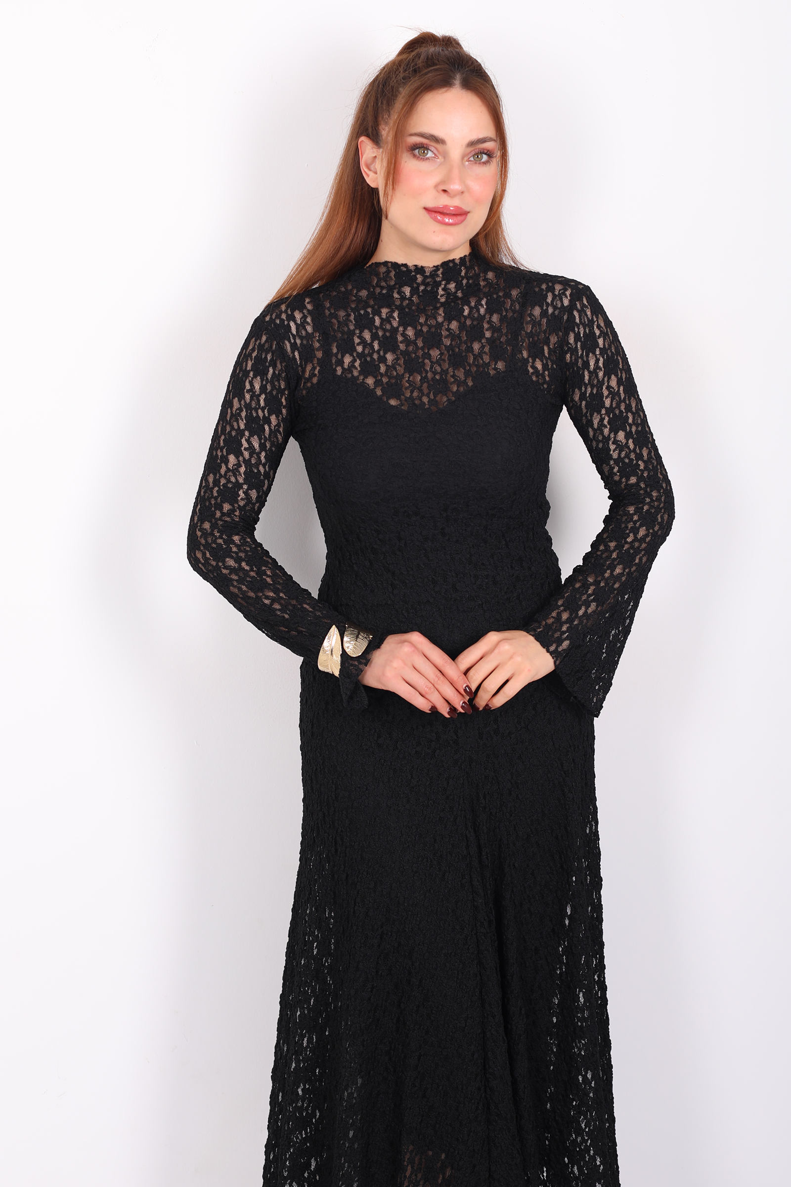 Siyah dantel sadece kumaş değil zamanın içinden geçen zarif bir etkidir. Işığın ritmine göre kabaran minik desenler, ince dantel dokusunun içine hafif bir üç boyut hissi verir ve bu da elbiseyi sıradan geceliklerden ayırır. Bu elbise, yürüdüğünde kendi melodisini yaratır gibi; her adımda ritmik bir feminenlik sunar.