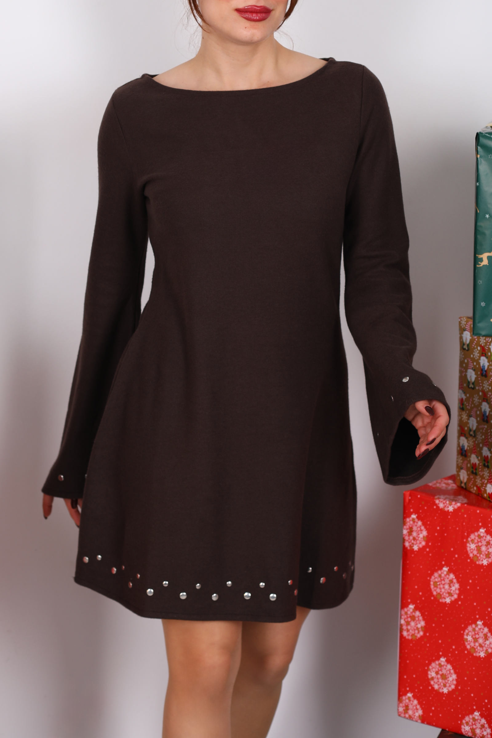 Elbisenin üzerine işlenmiş taş detaylar, minimalizmin sessiz şıklığını lüks bir dokunuşla buluşturur; ışığı yansıtma biçimiyle zarafeti her açıdan görünür kılar. Gündelik kombinlerde sneaker veya sandaletlerle uyumlu olurken, topuklu ayakkabılarla akşam stiline dönüşen kusursuz bir geçiş sağlar. Acı kahvenin nötr ama etkileyici tonu, her ten rengiyle uyumlu olup stilinize derinlik ve karakter katar.