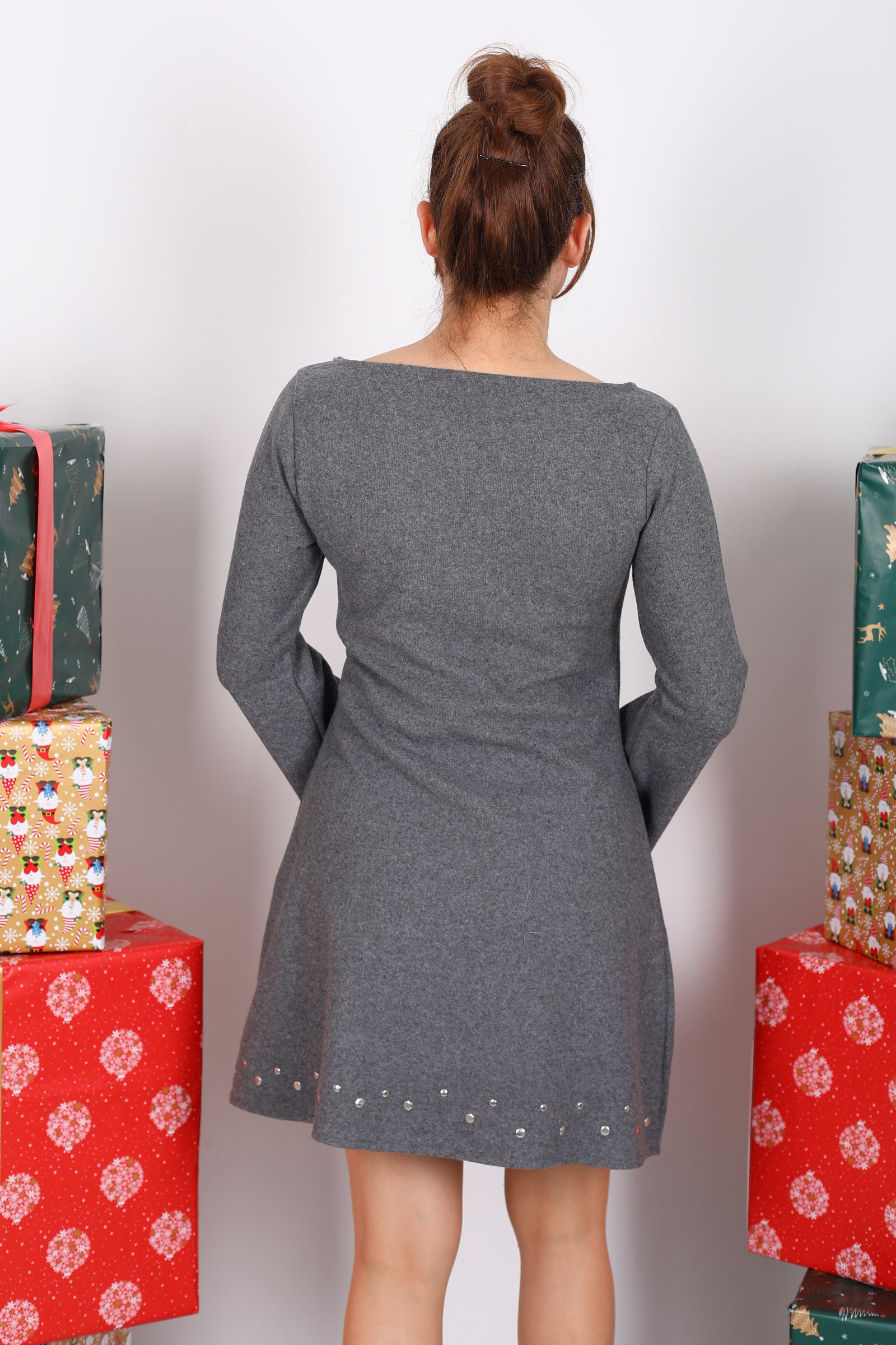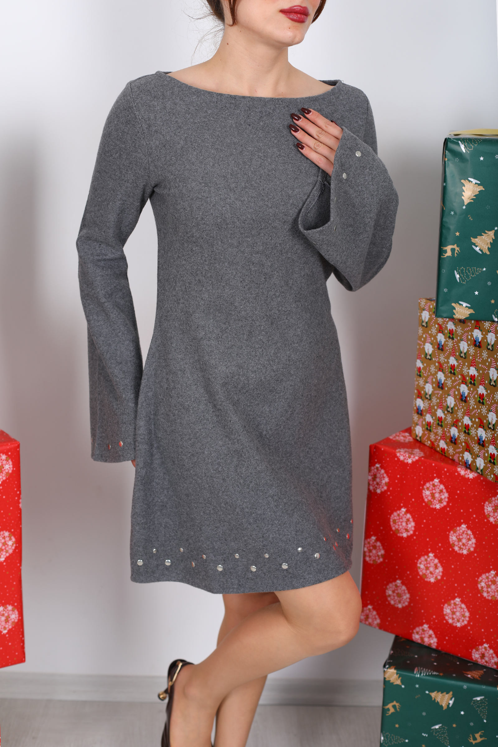 Füme tonunun sessiz çekiciliğiyle tasarlanmış bu elbise, sade bir zarafeti taş detaylarla buluşturan yüksek moda hissi verir. Omuz hattındaki İspanyol kol kesimi, sadece geniş ve akışkan bir siluet sunmakla kalmaz; aynı zamanda elbiseye hafif dramatik bir hava kazandırır. Taş detaylar, klasik çizgiyi incelikle kıran küçük ama etkileyici vurgulardır – ışığın altında nazikçe parlar ve görünümünüze lüks bir dokunuş ekler. Füme tonunun sessiz çekiciliğiyle tasarlanmış bu elbise, sade bir zarafeti taş detaylarla buluşturan yüksek moda hissi verir. Omuz hattındaki İspanyol kol kesimi, sadece geniş ve akışkan bir siluet sunmakla kalmaz; aynı zamanda elbiseye hafif dramatik bir hava kazandırır. Taş detaylar, klasik çizgiyi incelikle kıran küçük ama etkileyici vurgulardır – ışığın altında nazikçe parlar ve görünümünüze lüks bir dokunuş ekler.