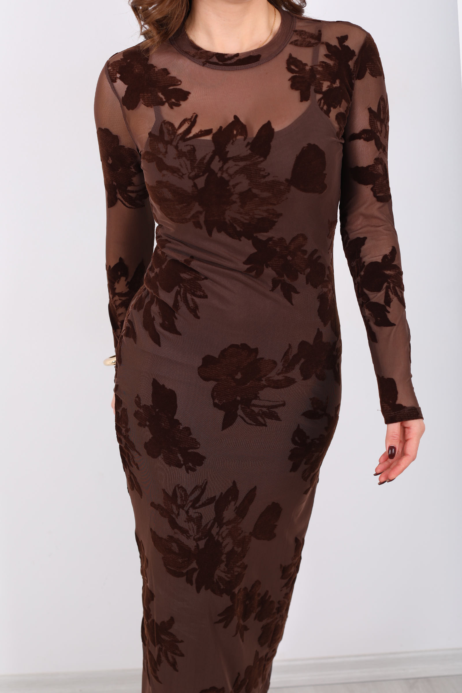 Kadife Baskılı Acı Kahve Kadın Astarlı Elbise