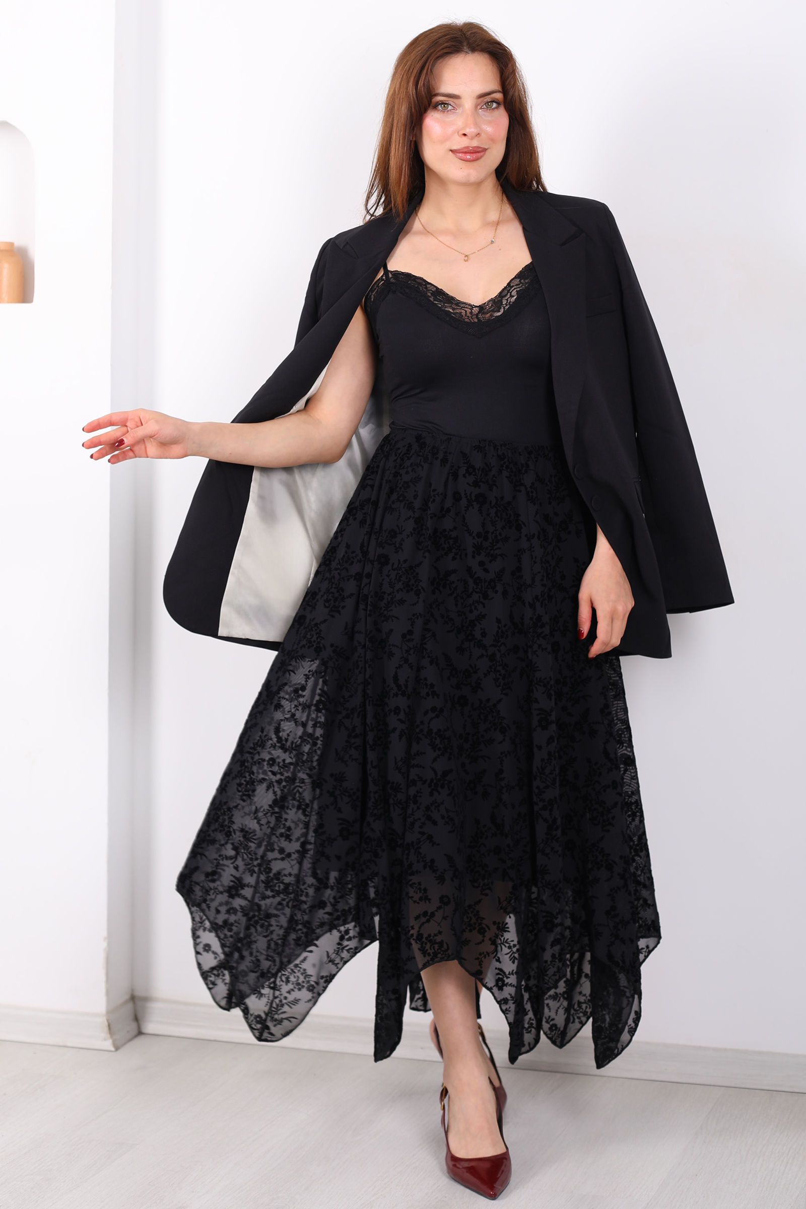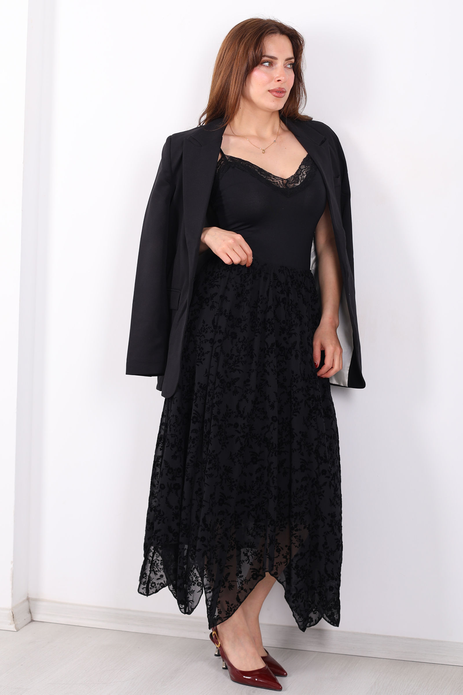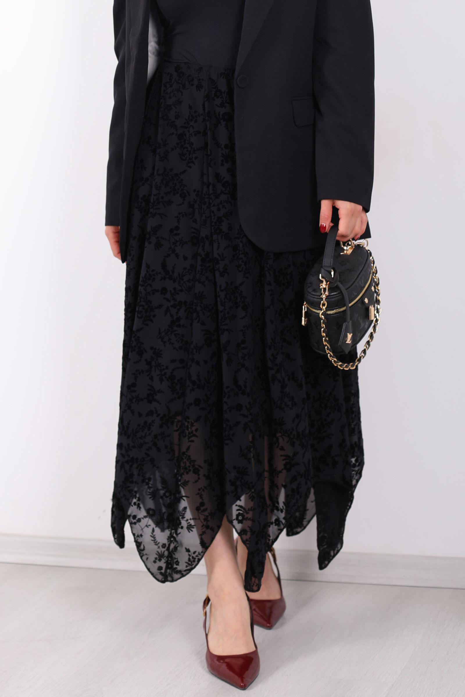Kadife Baskılı Asimetrik Siyah Kadın Kloş Etek