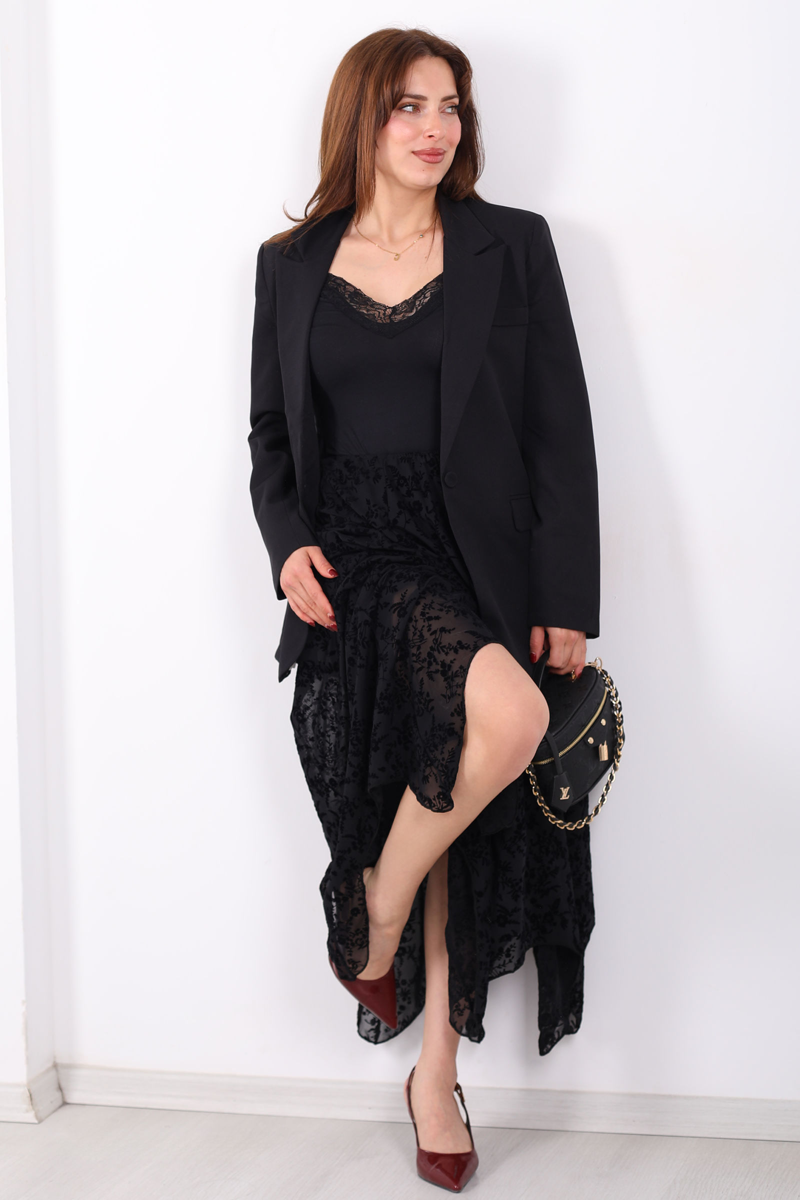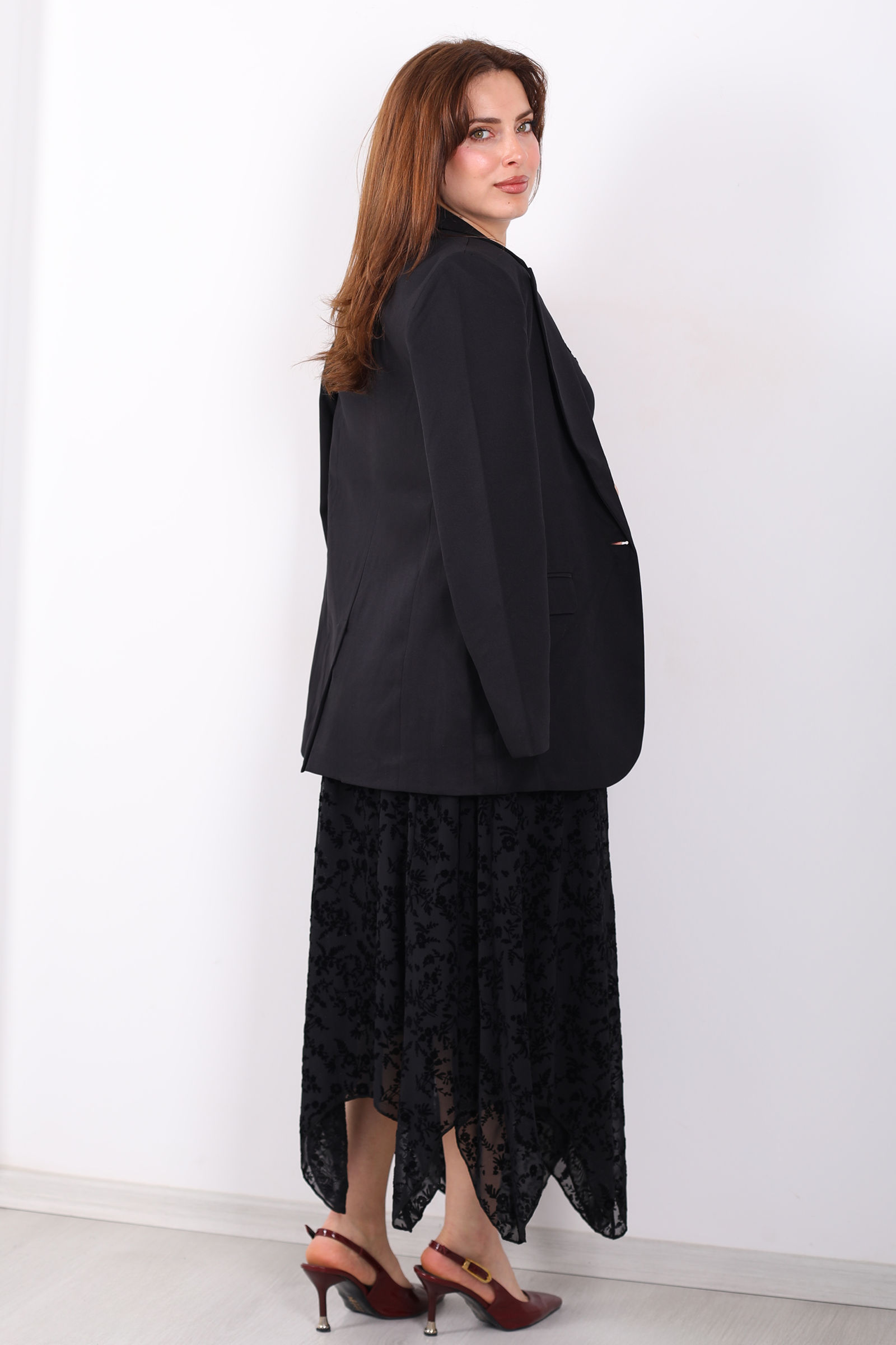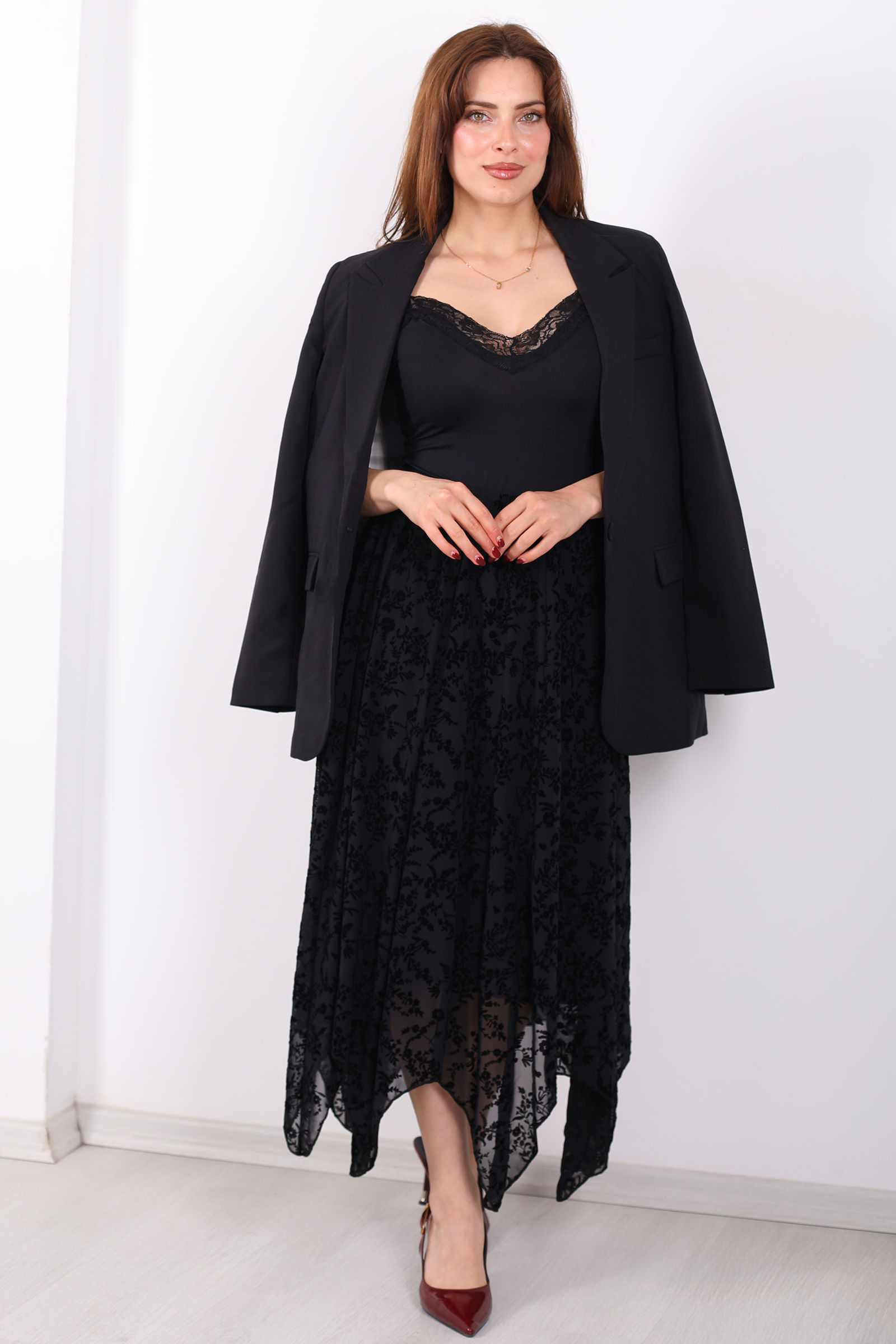 Kadife Baskılı Asimetrik Siyah Kadın Kloş Etek