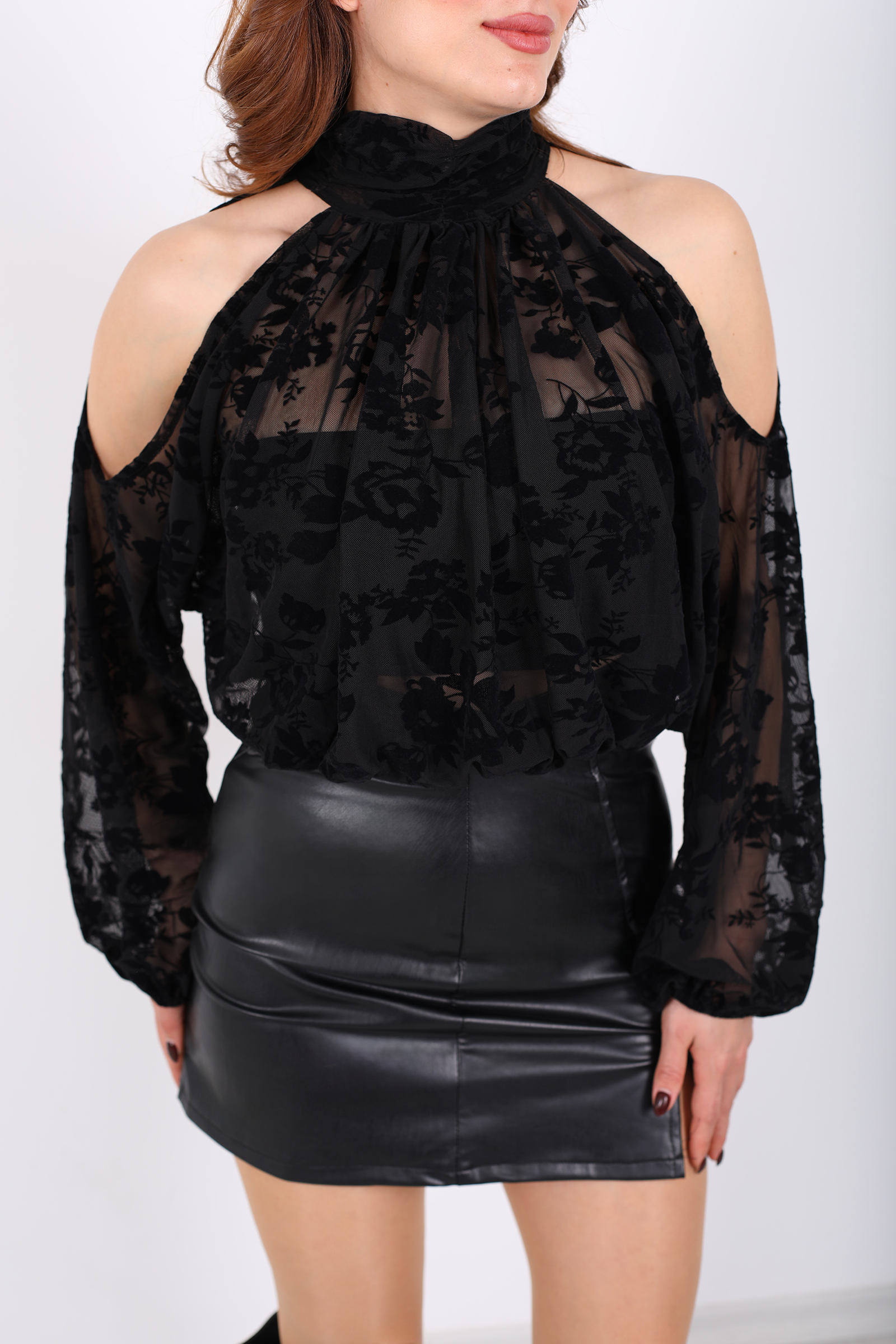 Siyah tülün hafif zarafeti, kadife baskının derin dokusuyla birleşerek bu omuz açık bluzda etkileyici bir estetik yaratıyor. Omuzların nazikçe açıkta bırakıldığı tasarım, boyun ve omuz hattına feminen bir vurgu eklerken tülün akışkan yapısı her adımda incelikli bir ritim sunar. Kadife baskılar, yüzeye sofistike bir doku katıp görünümü modern bir sanat eserine dönüştürür. Bu bluz, sade parçalarla veya iddialı alt giyimlerle kombine edildiğinde dikkat çekici bir kontrast sağlayarak stilinize karizmatik bir hava katar.